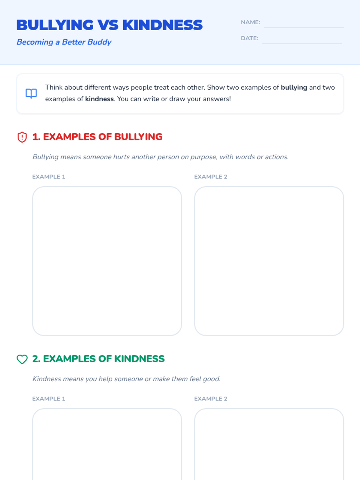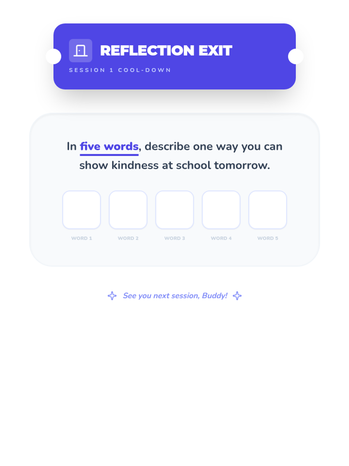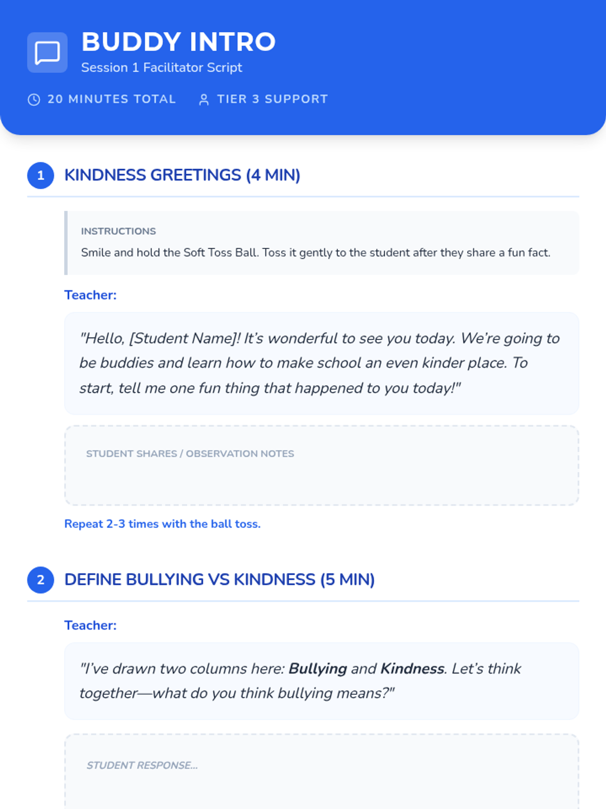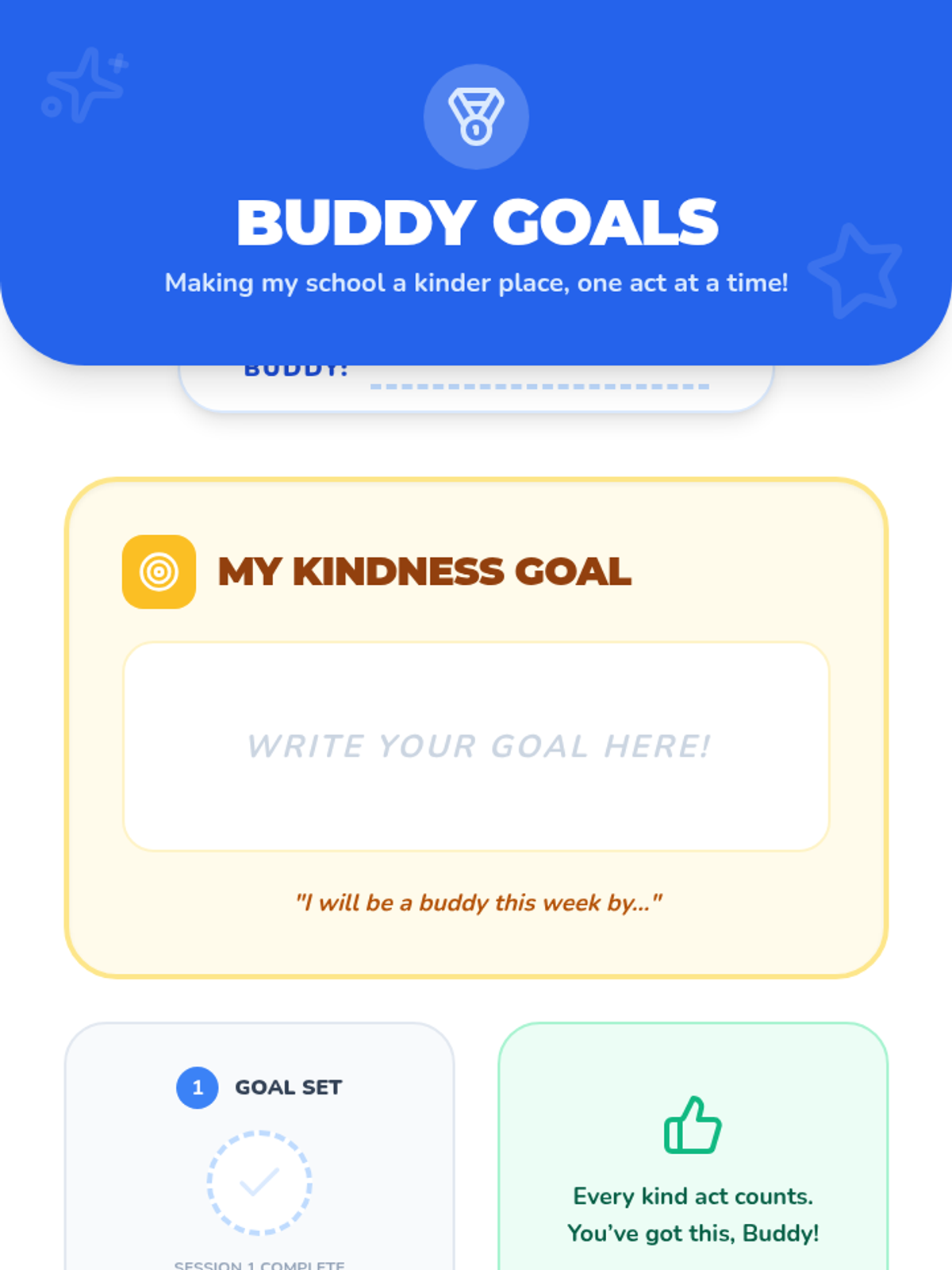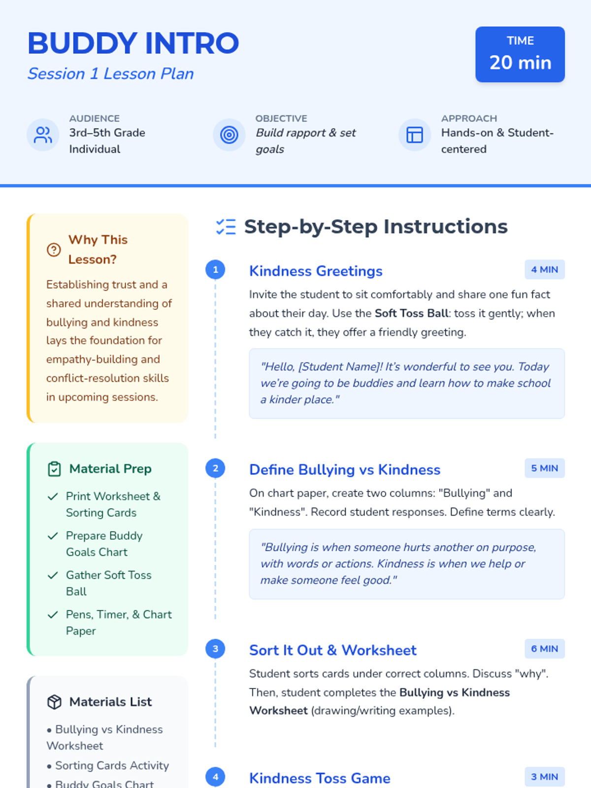 An 8-session individual support series designed for 3rd-5th graders to foster empathy, kindness, and conflict-resolution skills while addressing the impacts of bullying. Each session uses interactive discussions and hands-on activities to build a supportive 'buddy' mindset.