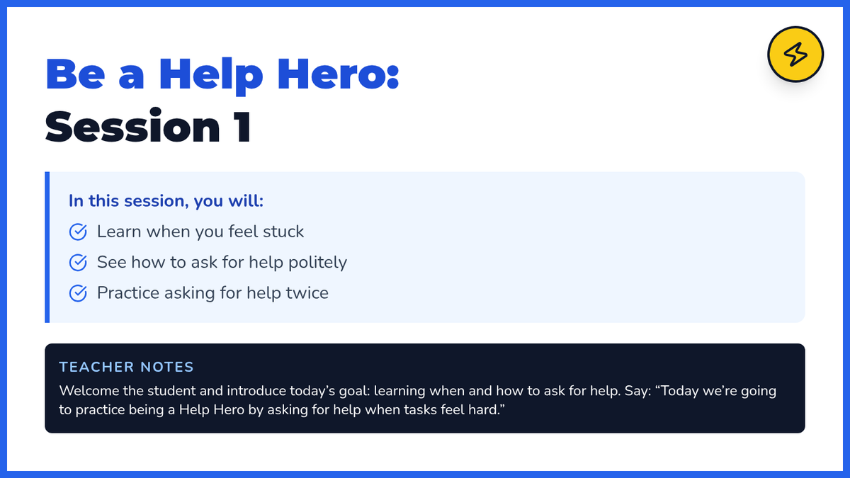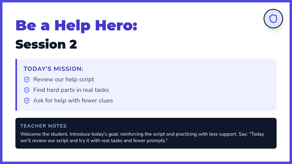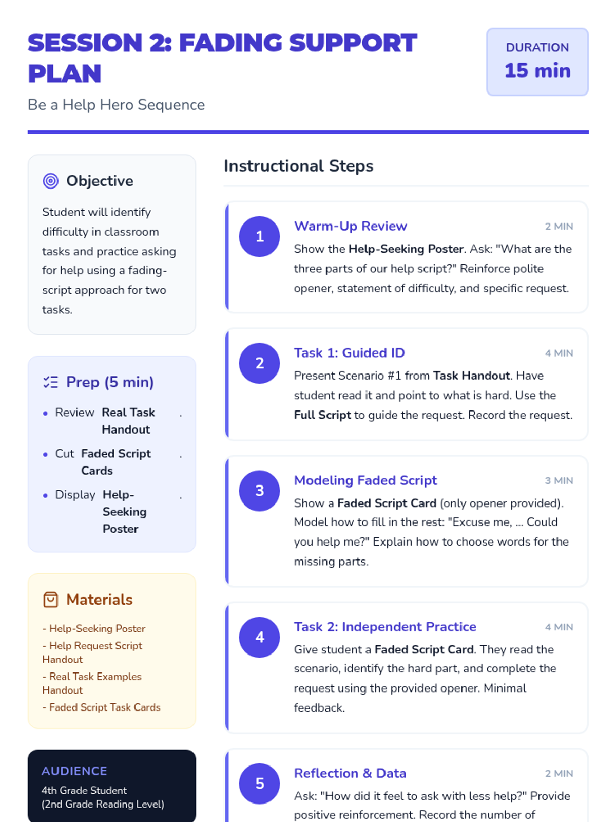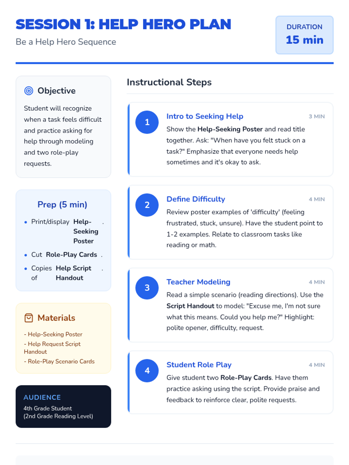 A 4-session Tier 3 intervention sequence designed for a 4th-grade student with a 2nd-grade reading level, focusing on identifying difficulty and politely asking for help using a structured script.
