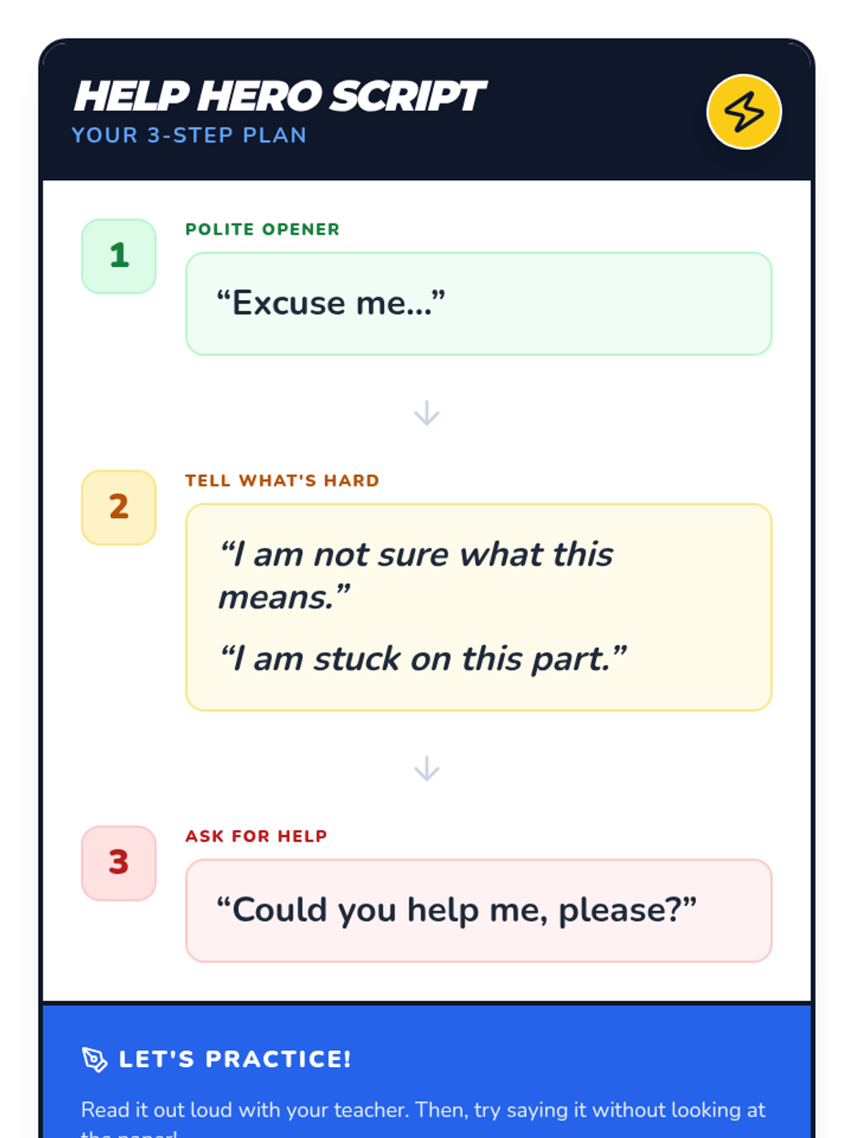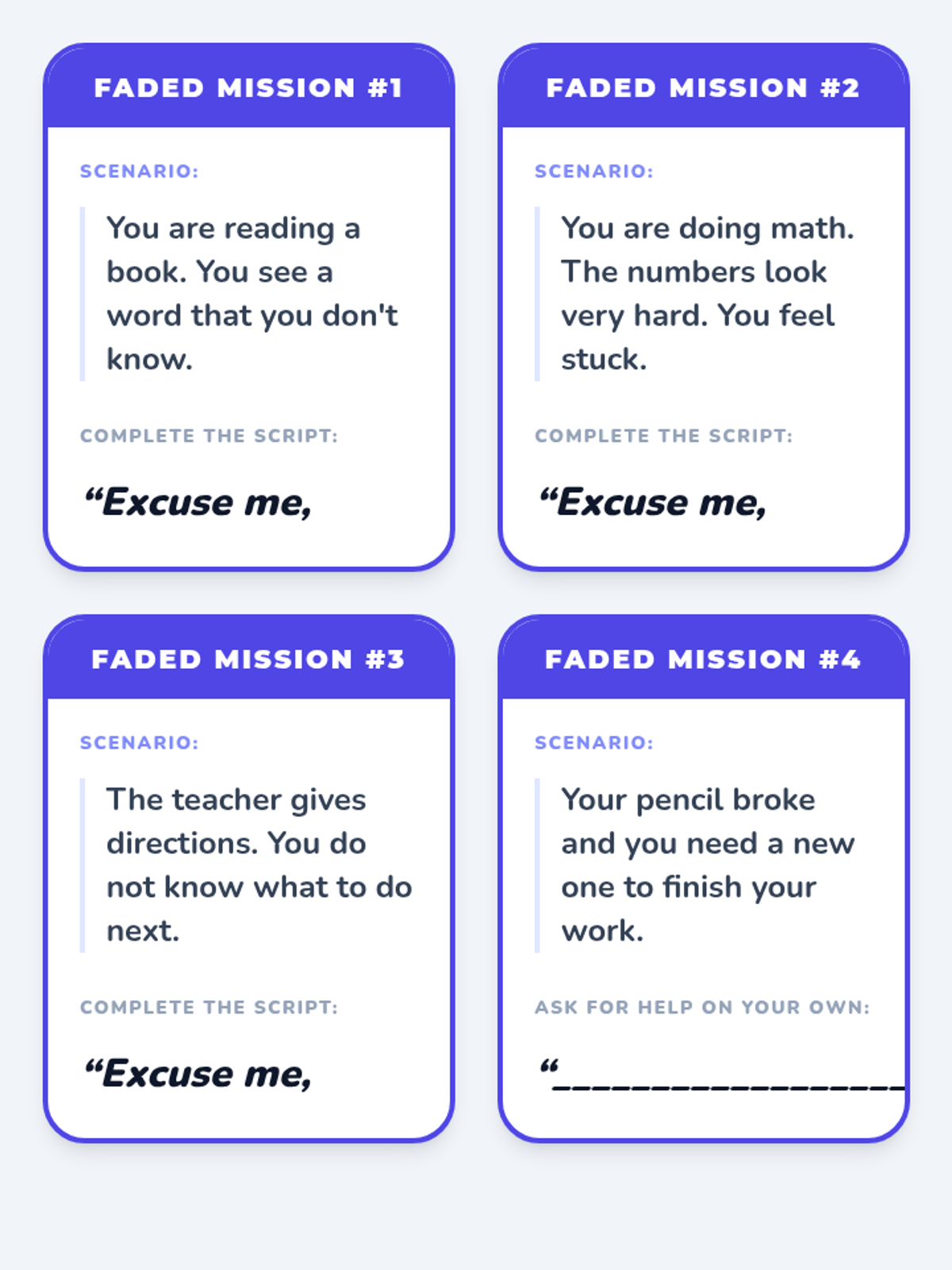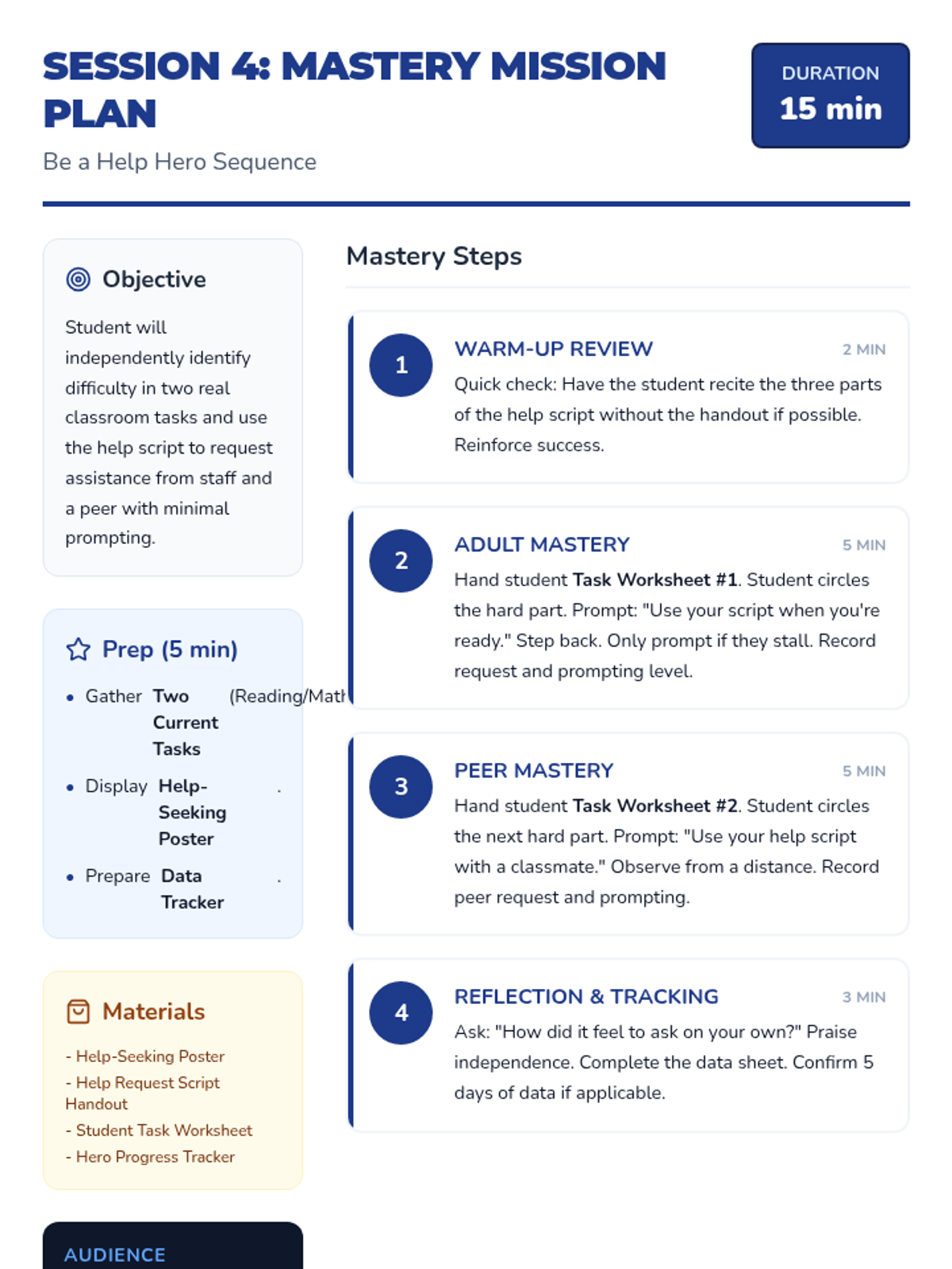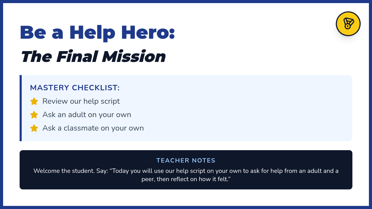 A 4-session Tier 3 intervention sequence designed for a 4th-grade student with a 2nd-grade reading level, focusing on identifying difficulty and politely asking for help using a structured script.
