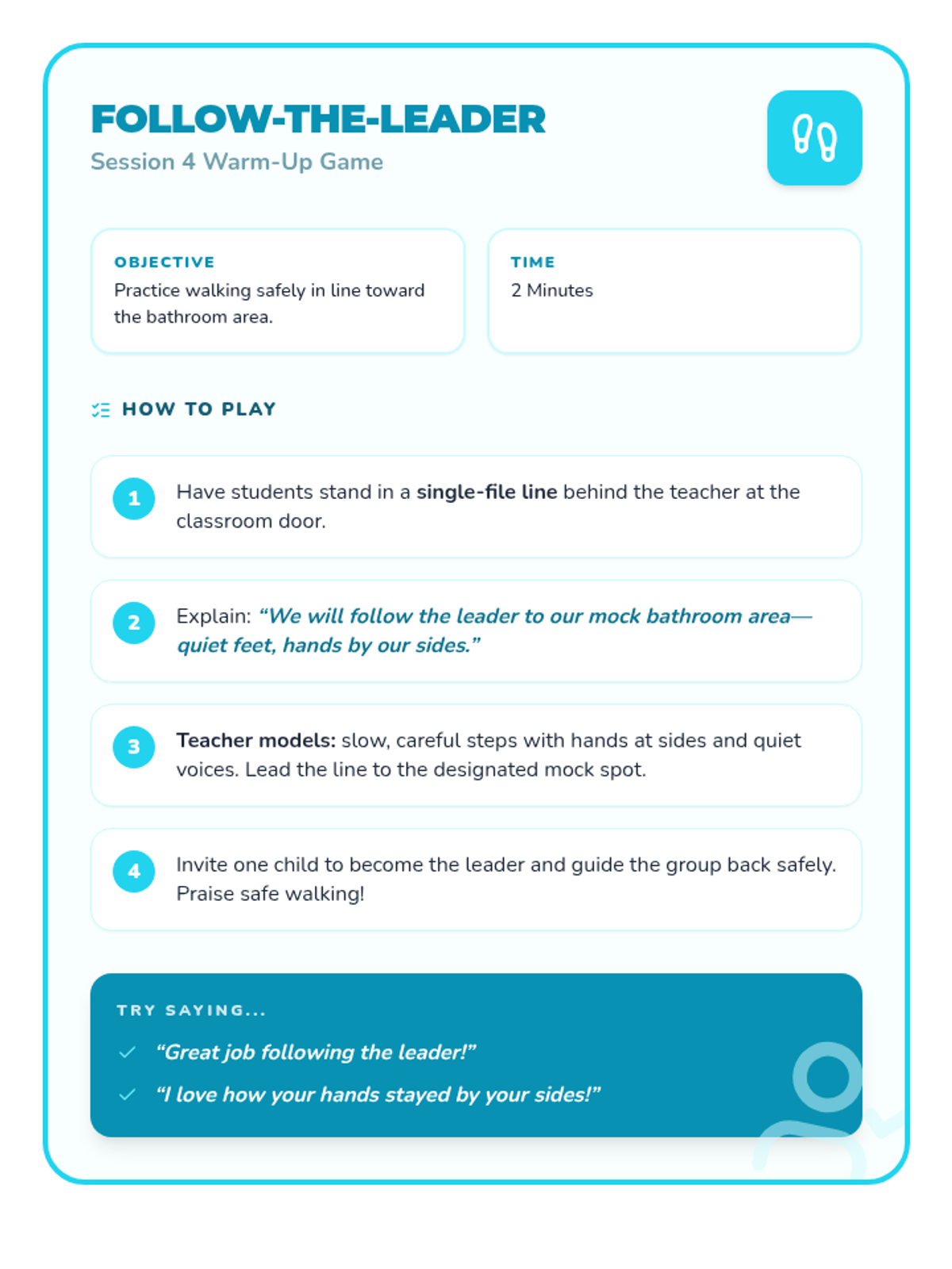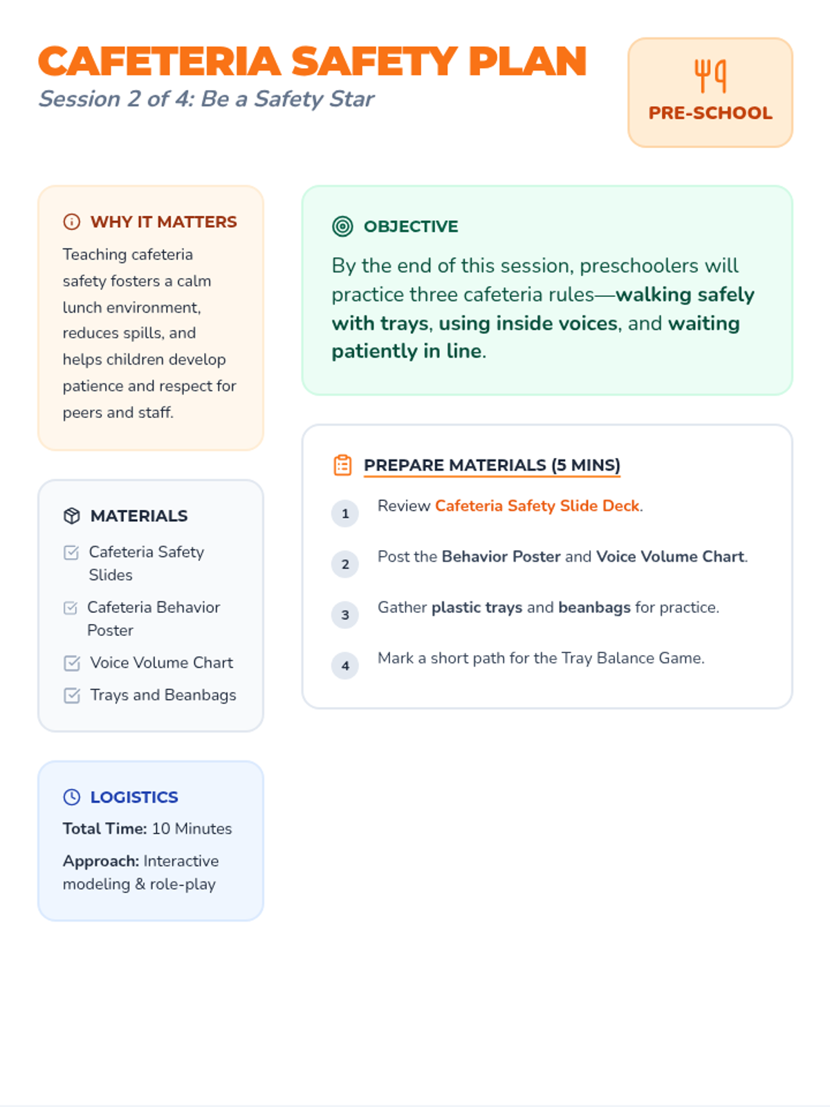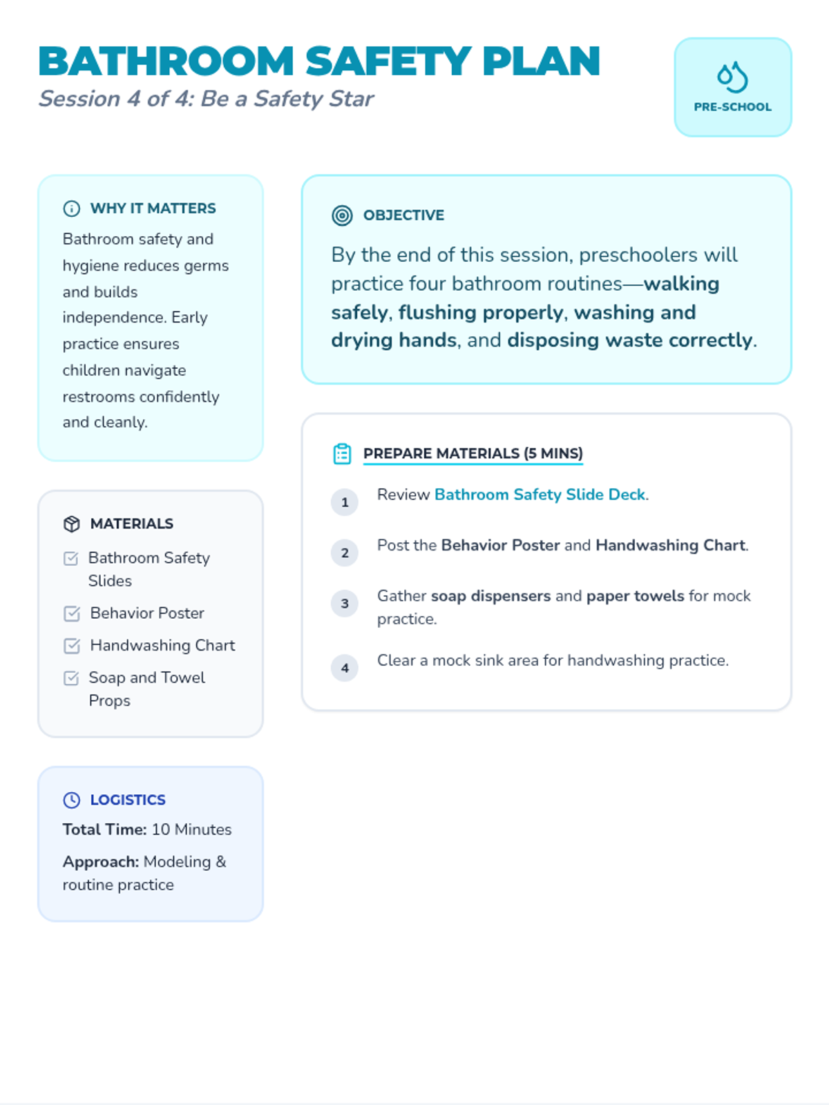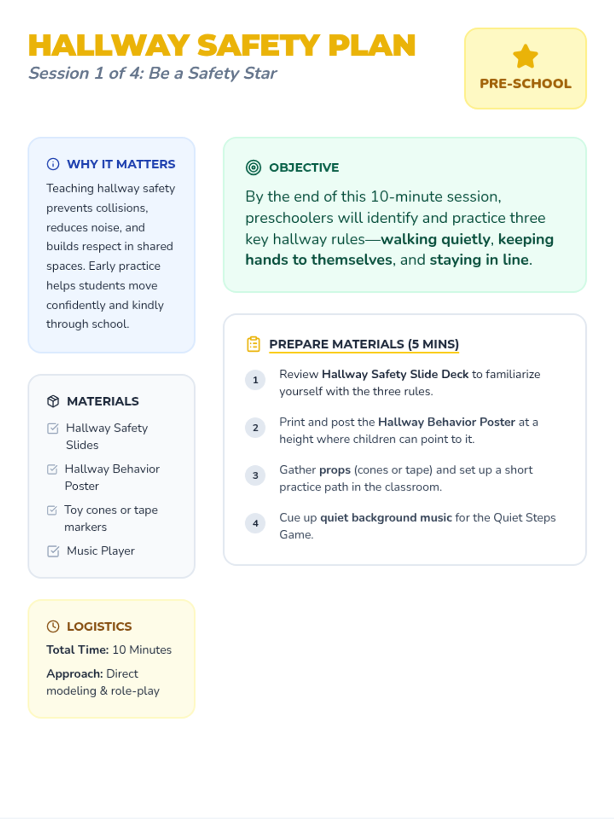 A 4-session preschool sequence that teaches safe and respectful behaviors in the hallway, cafeteria, playground, and bathroom through engaging activities and visuals.