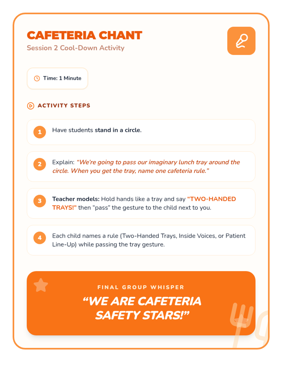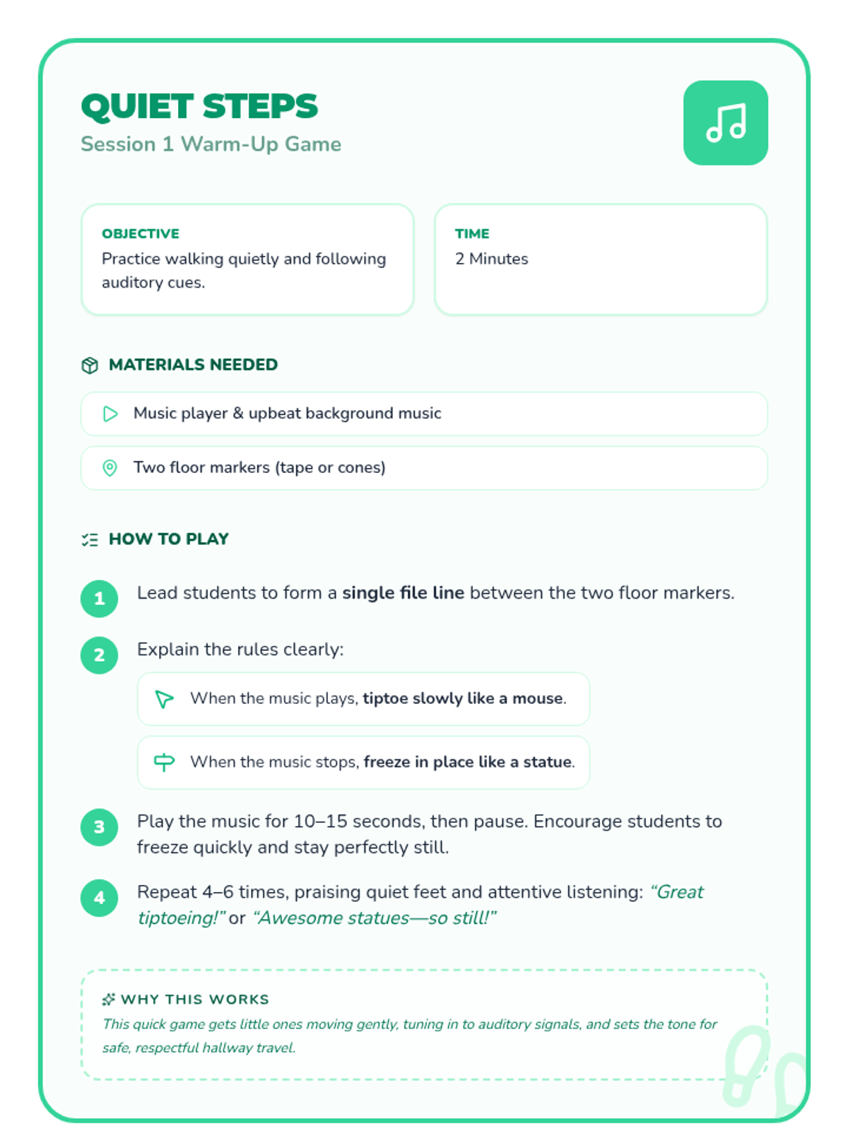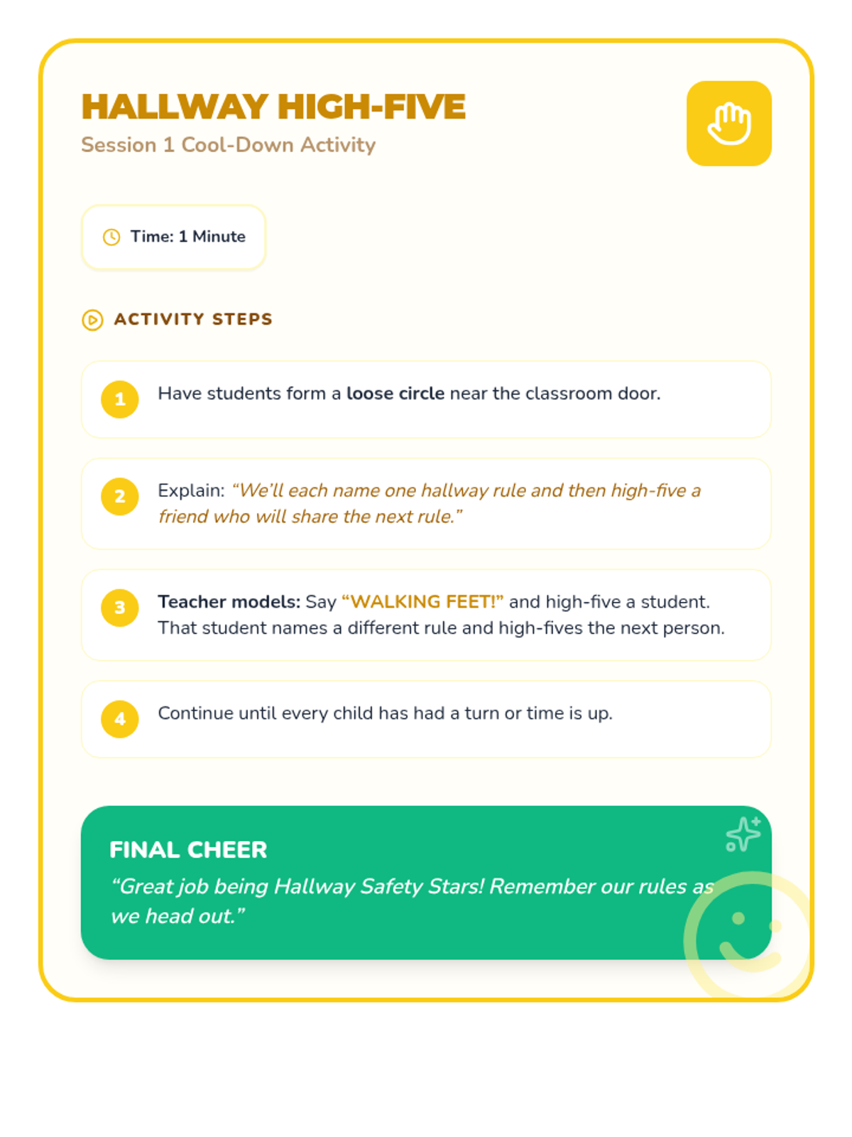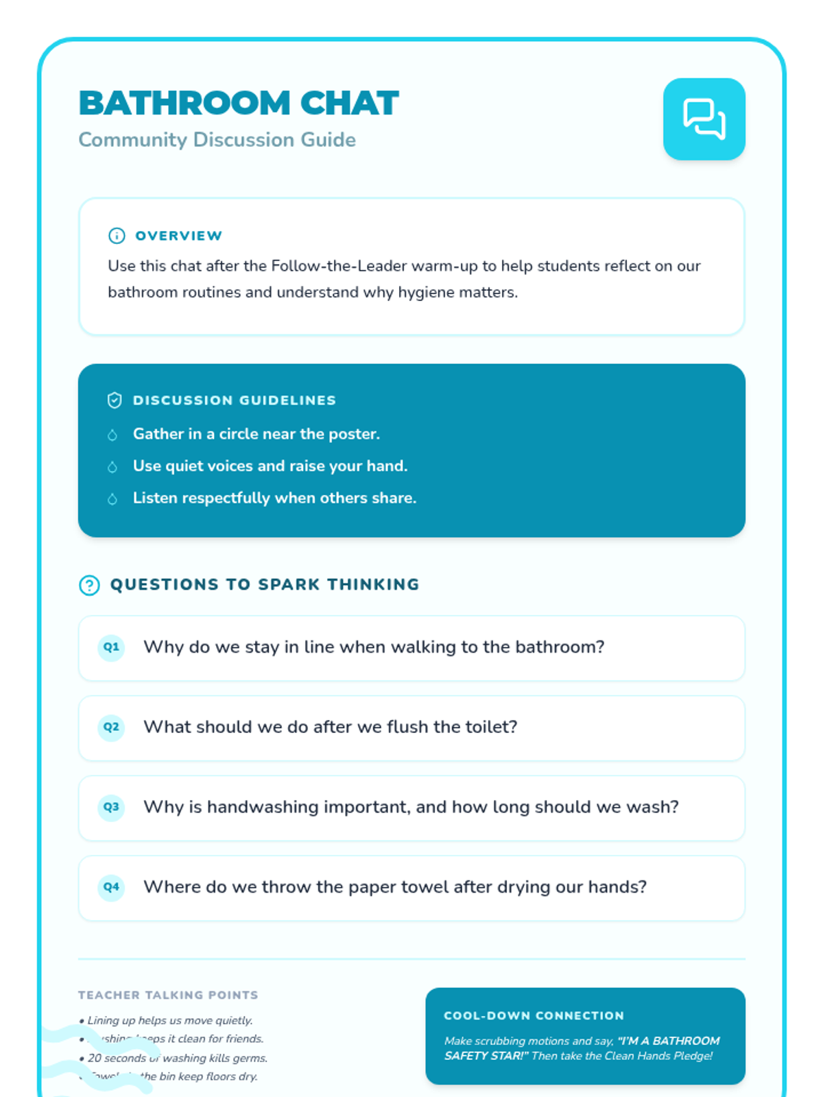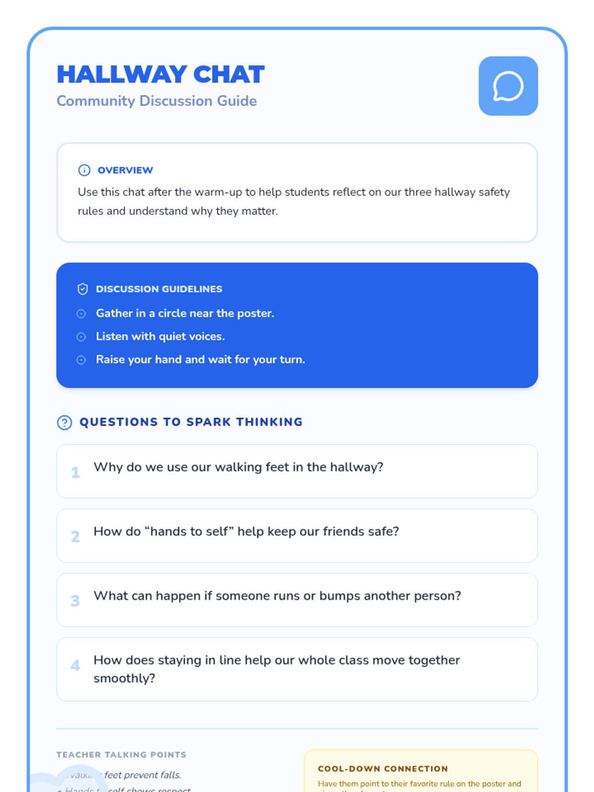 A 4-session preschool sequence that teaches safe and respectful behaviors in the hallway, cafeteria, playground, and bathroom through engaging activities and visuals.