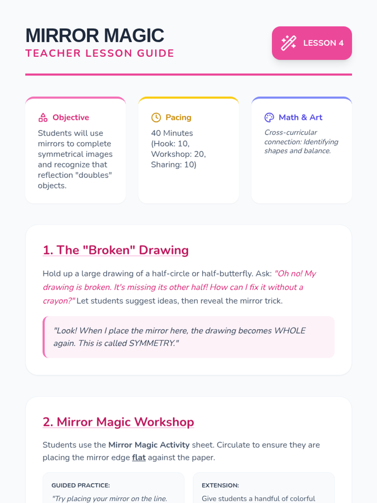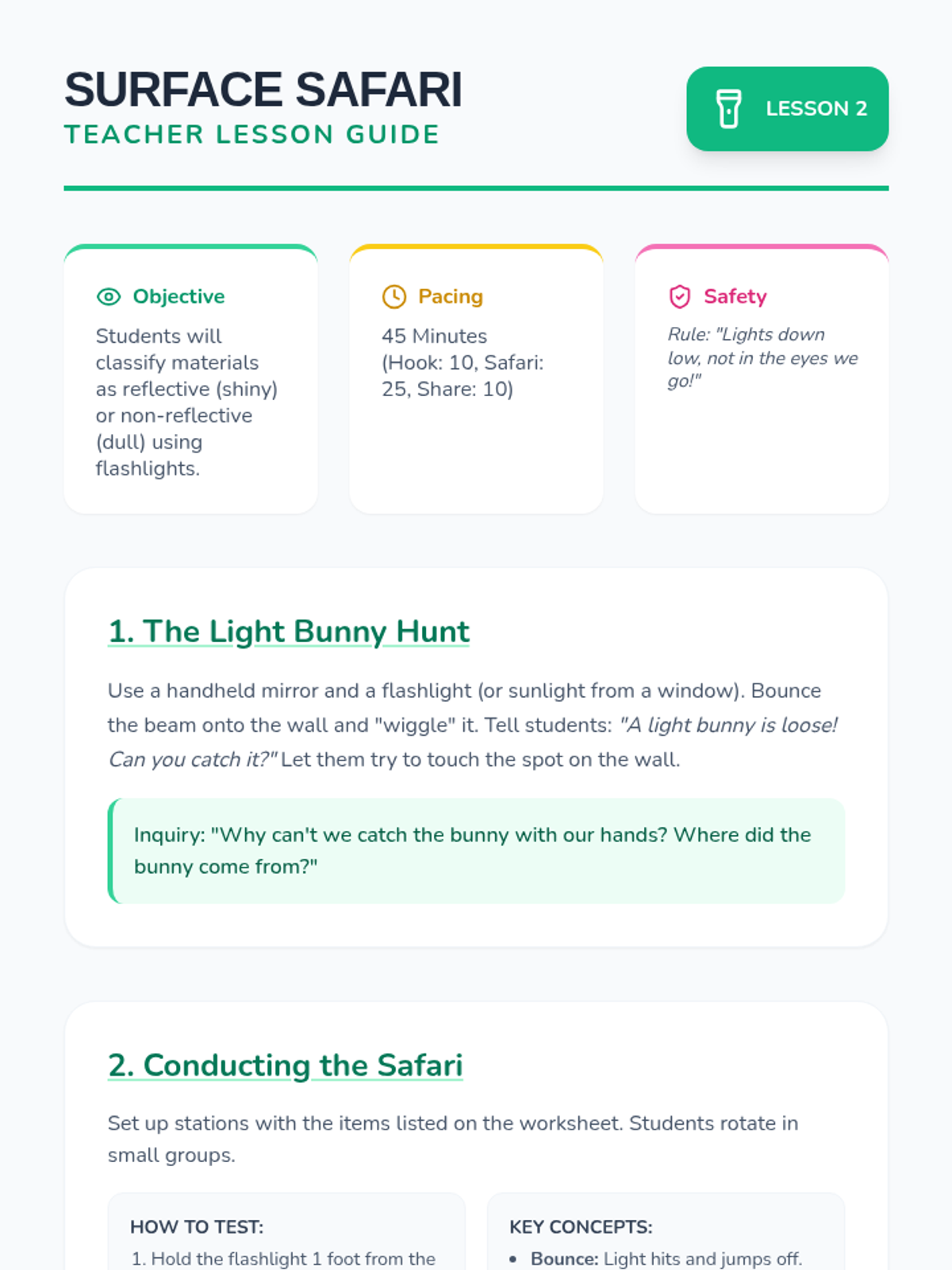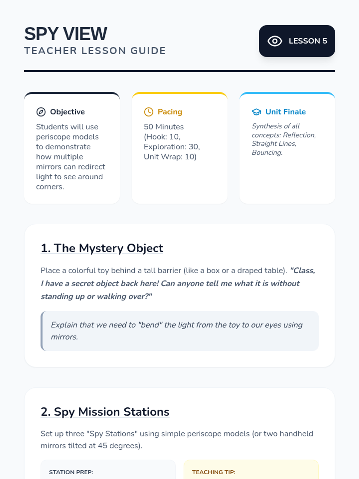 A Kindergarten science sequence exploring the physics of light through reflection. Students engage in hands-on activities with mirrors and flashlights to understand how light bounces, travels in straight lines, and creates symmetry.