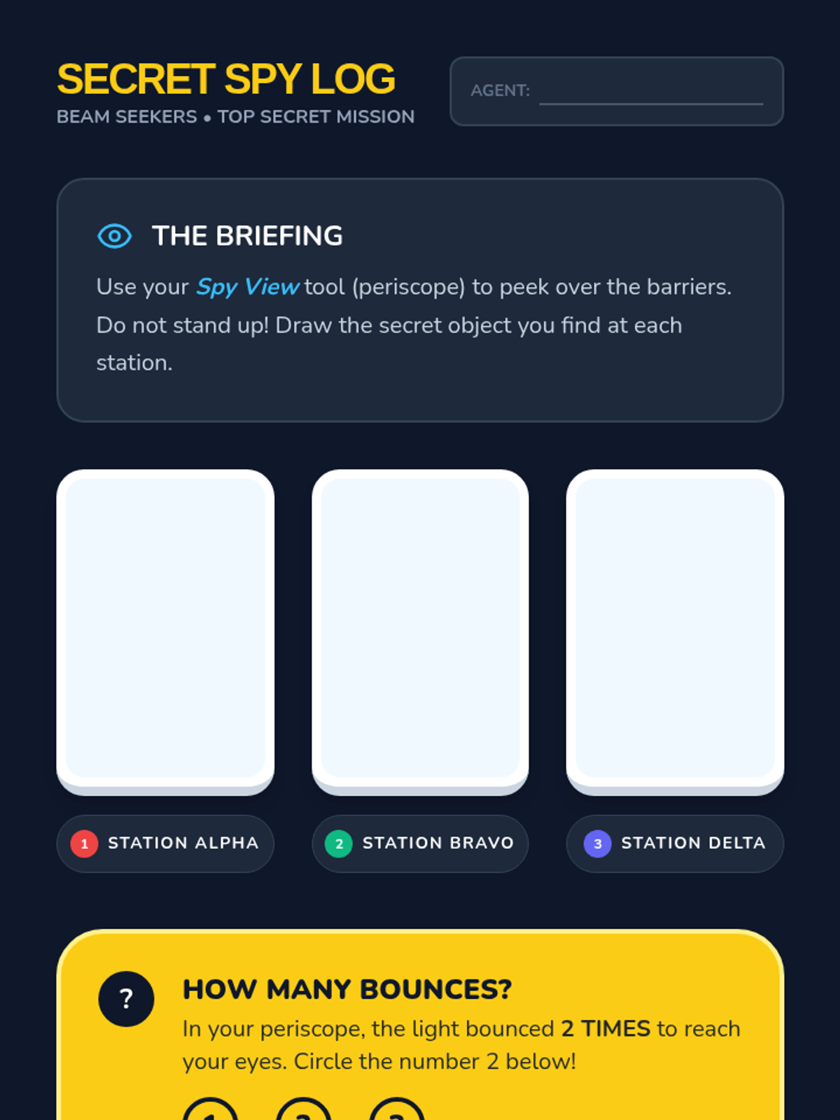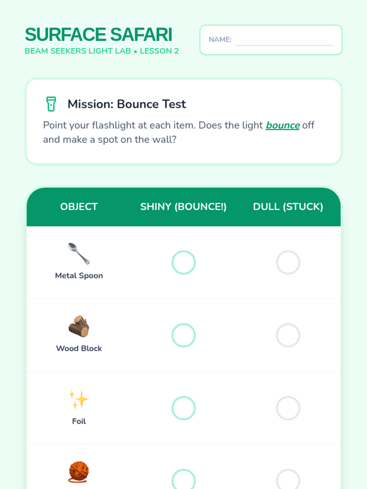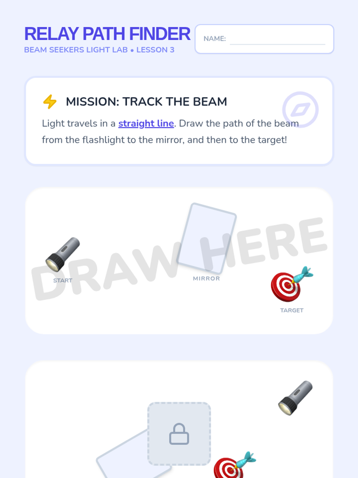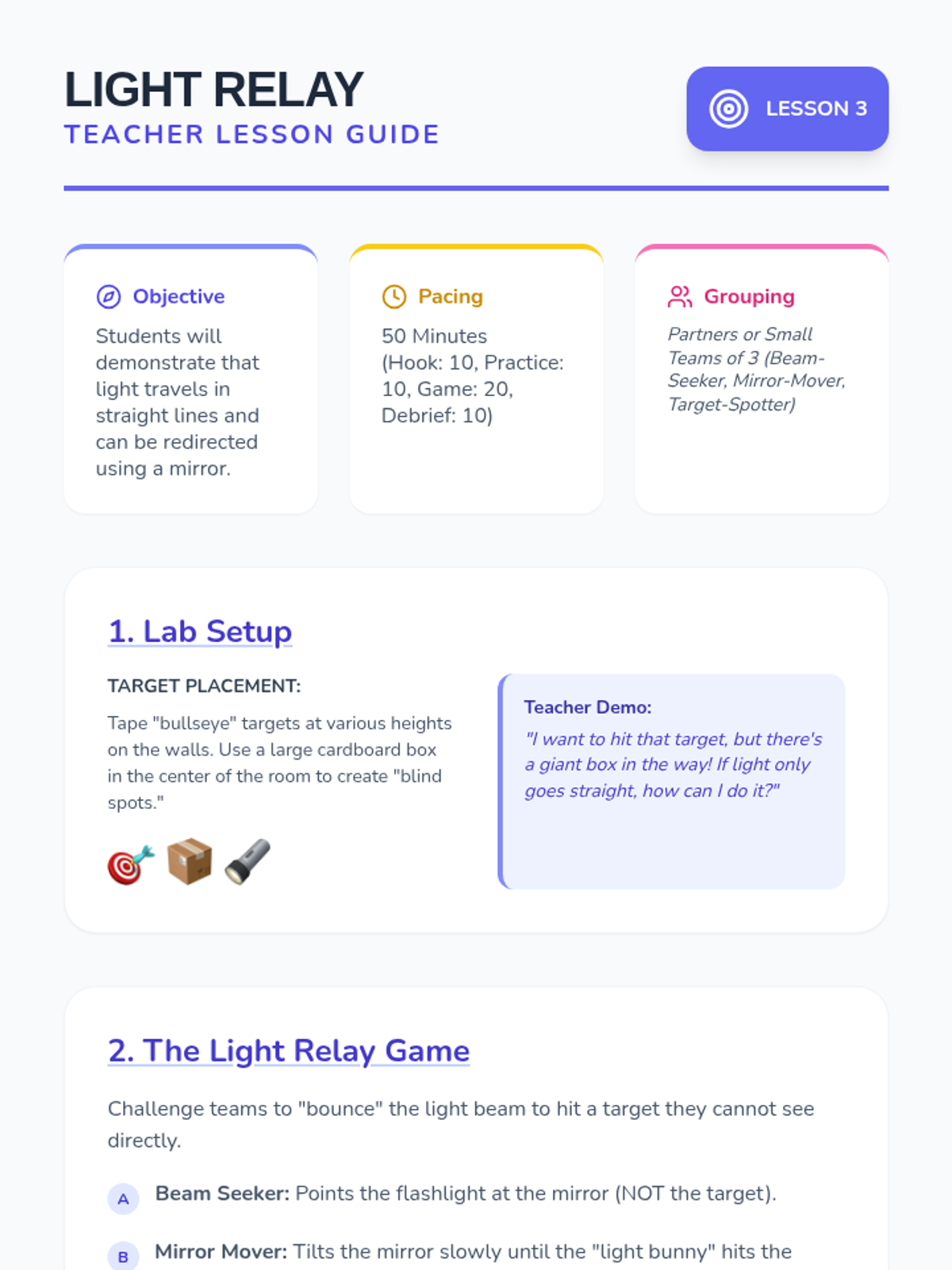 A Kindergarten science sequence exploring the physics of light through reflection. Students engage in hands-on activities with mirrors and flashlights to understand how light bounces, travels in straight lines, and creates symmetry.