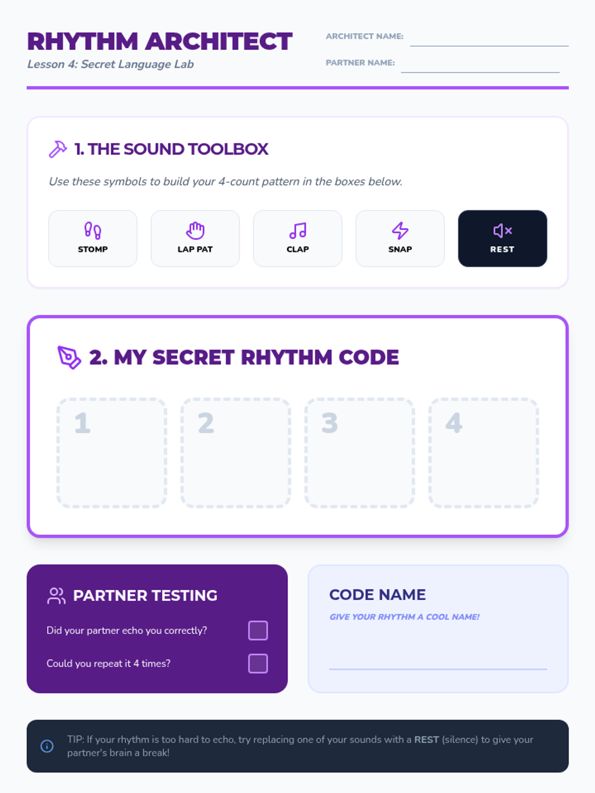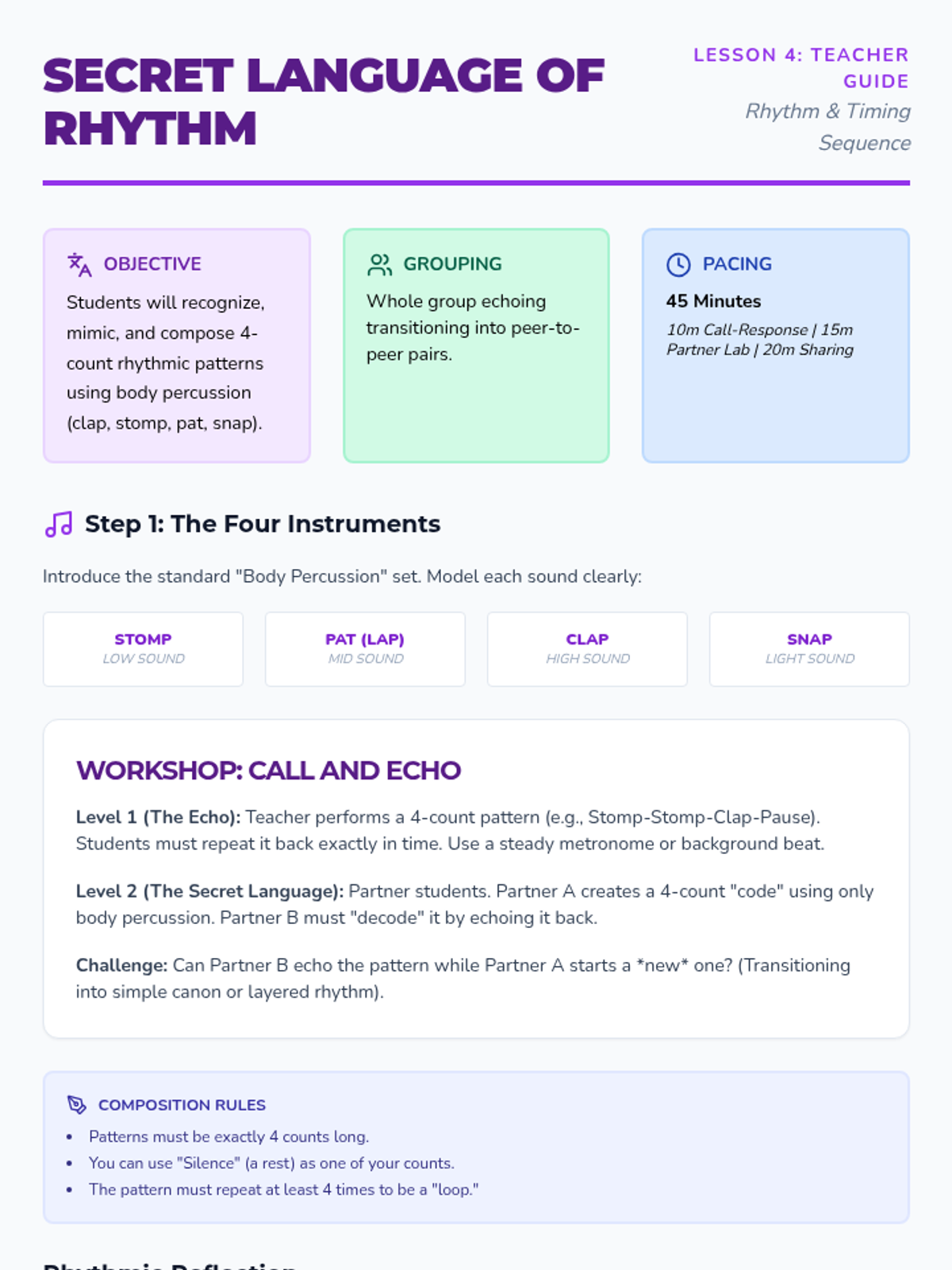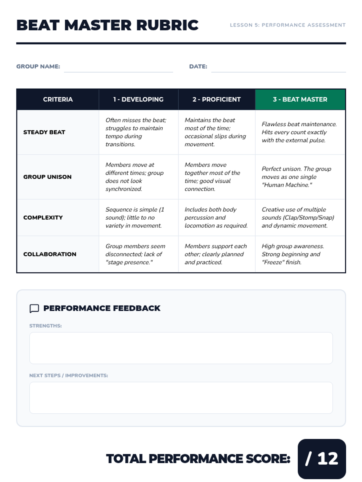 A four-day music and movement unit for K-3 students focused on collaboration, rhythm, and creative choreography. Groups work together to select songs and build original dance routines.