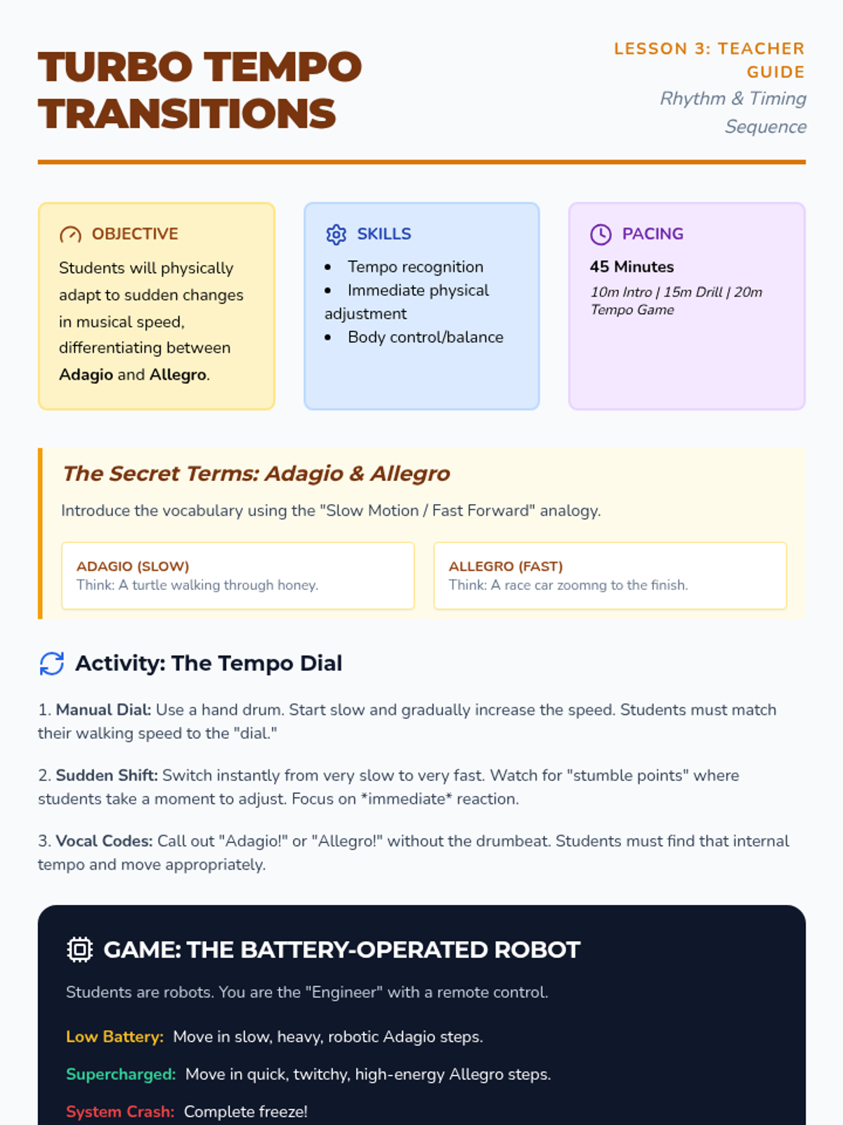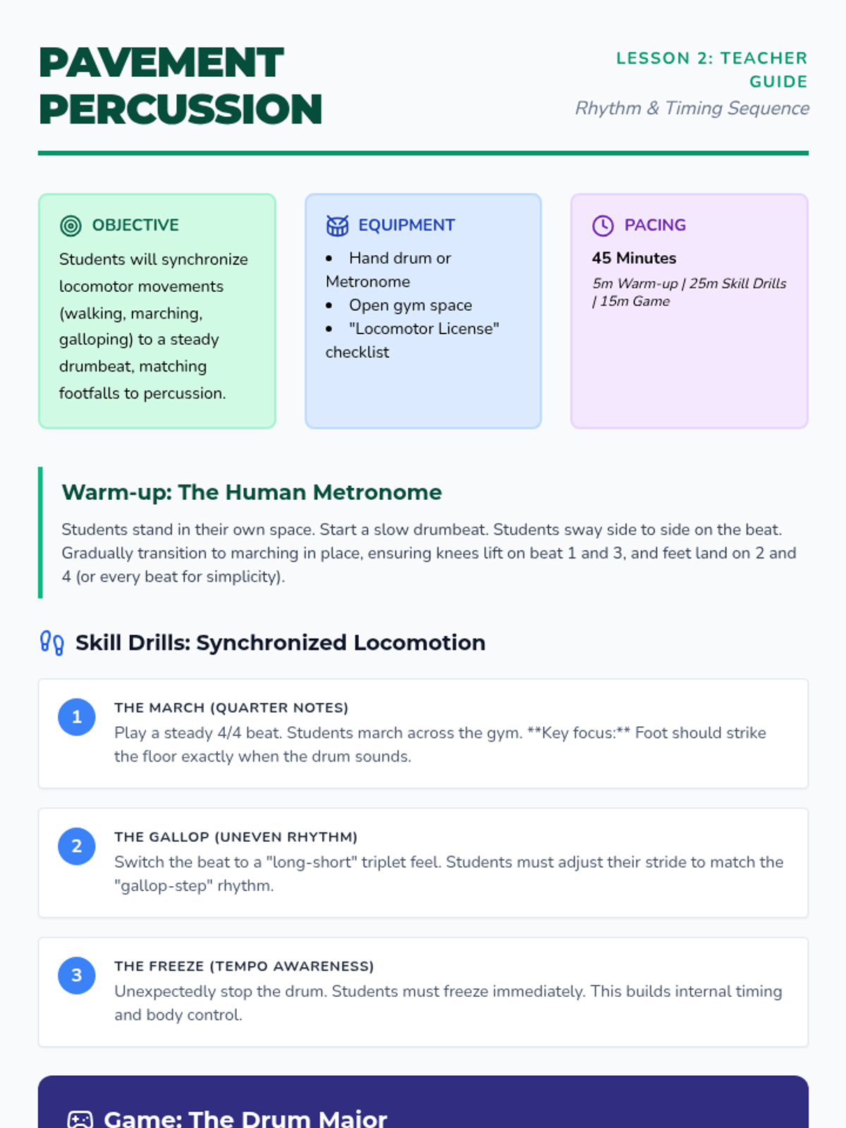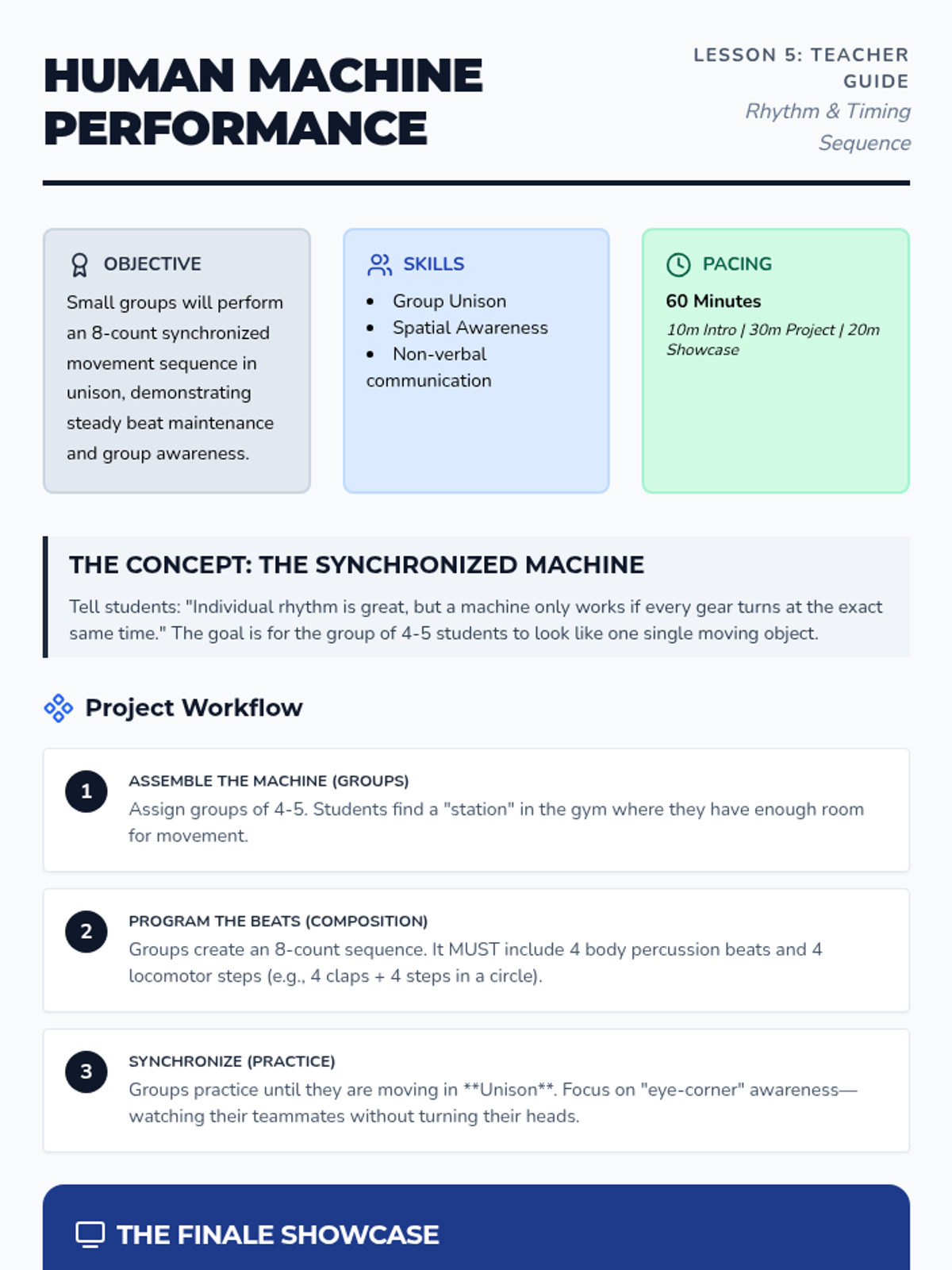 A 5-lesson sequence for 3rd grade students focusing on developing auditory beat recognition, locomotor synchronization, tempo adaptation, and group performance skills in the context of rhythmic movement.