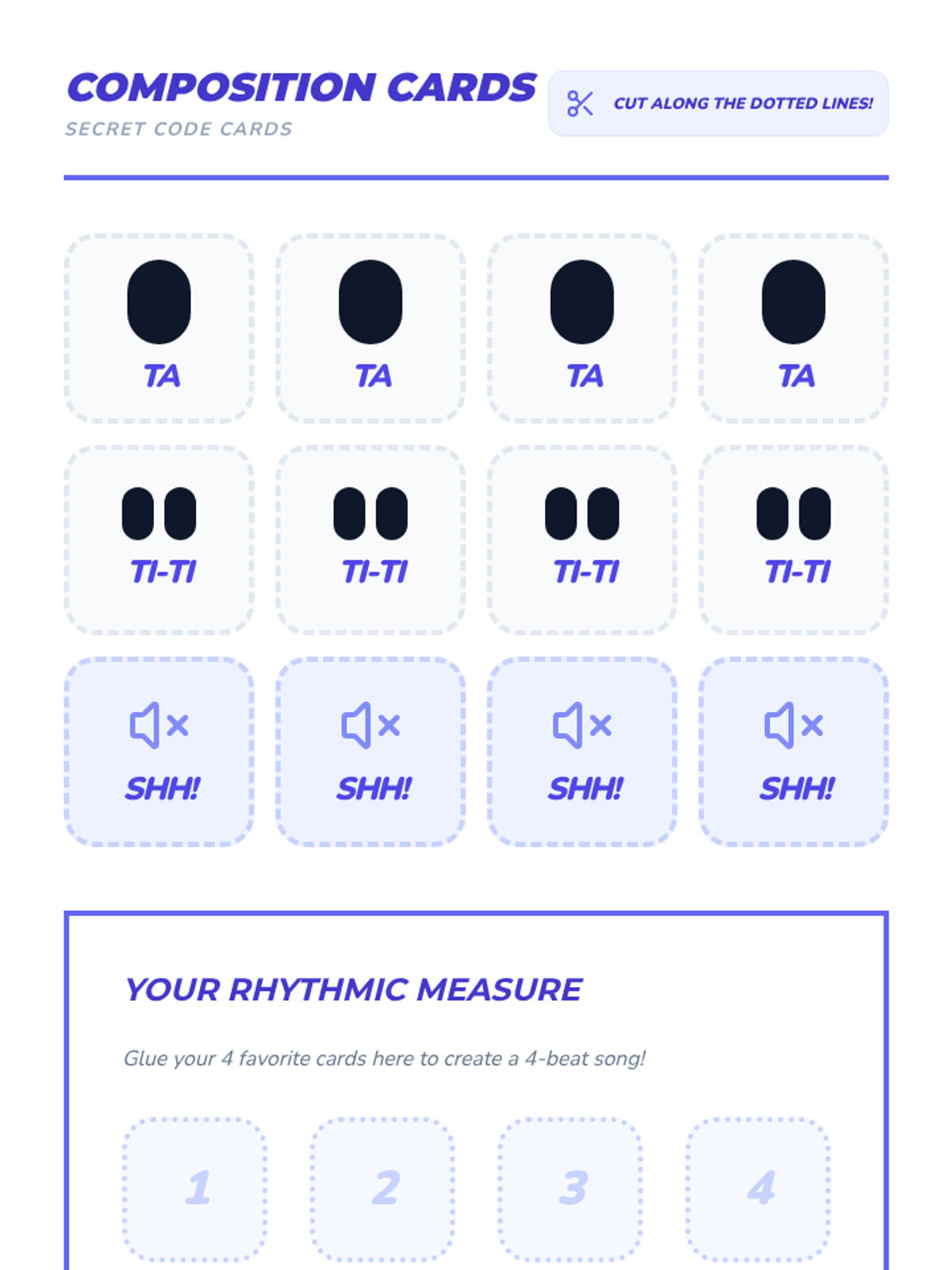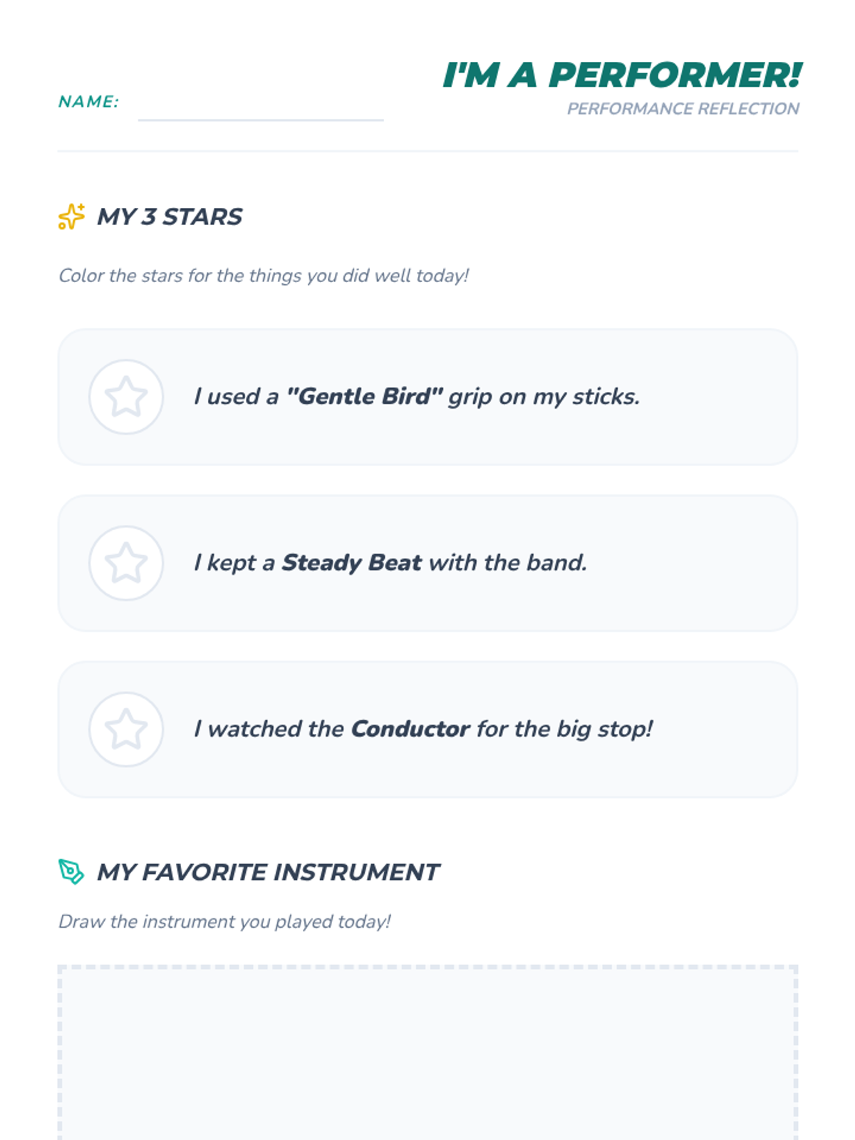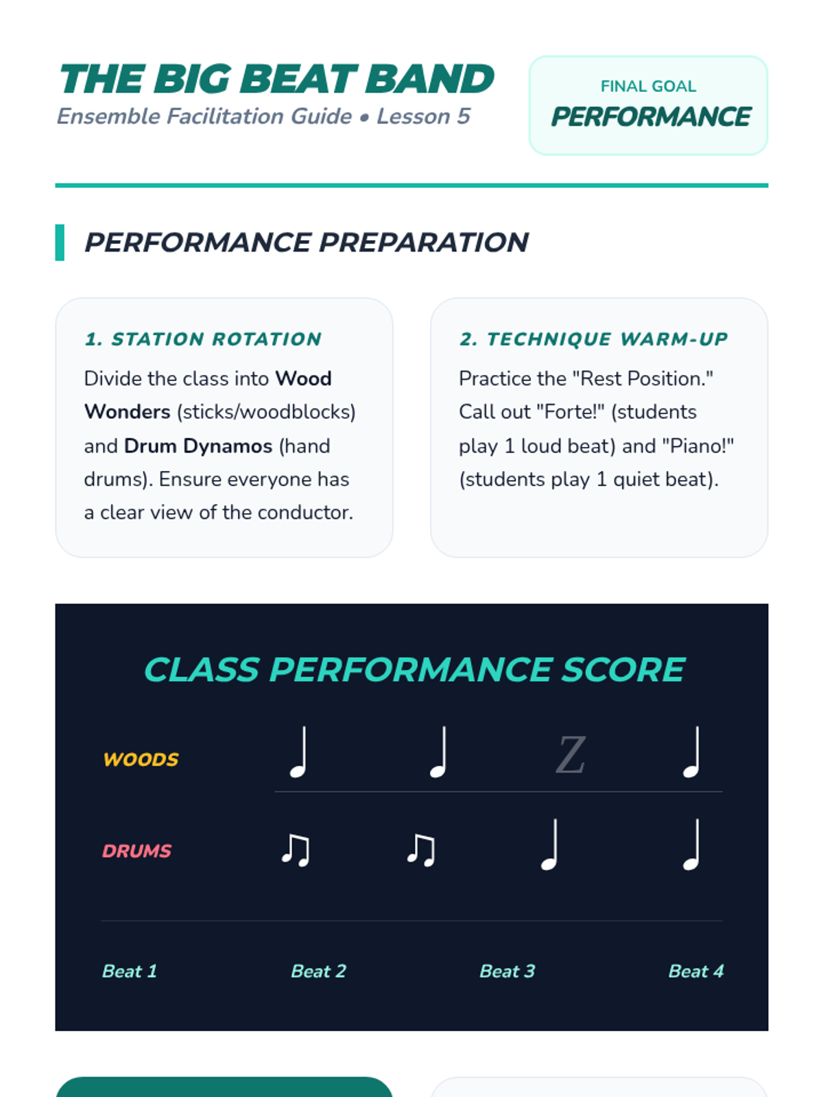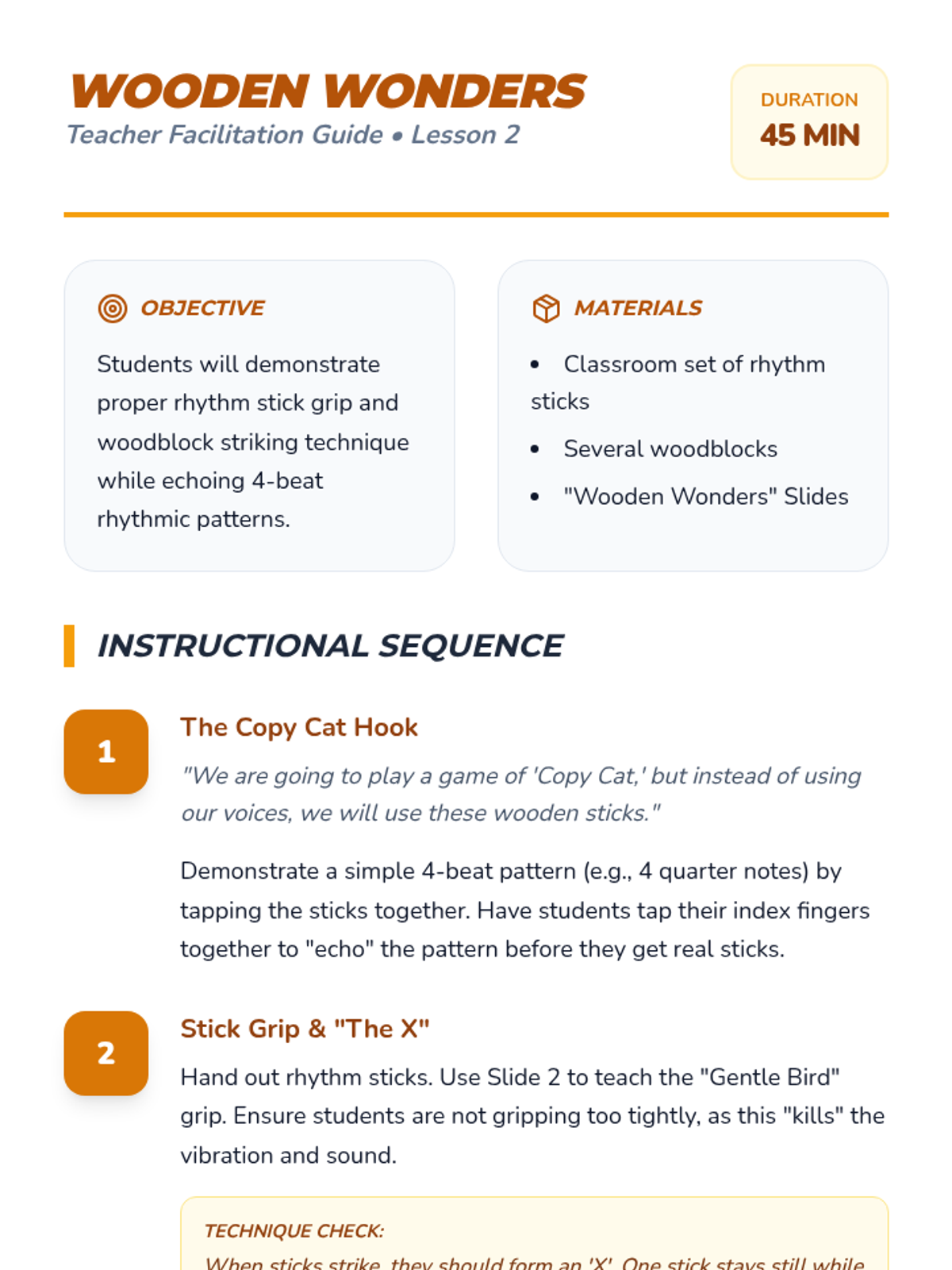 This sequence introduces 1st-grade students to foundational percussion techniques and rhythmic accuracy. Students progress from body percussion and distinguishing beat versus rhythm to playing wood and membrane instruments with proper technique and reading basic notation.
