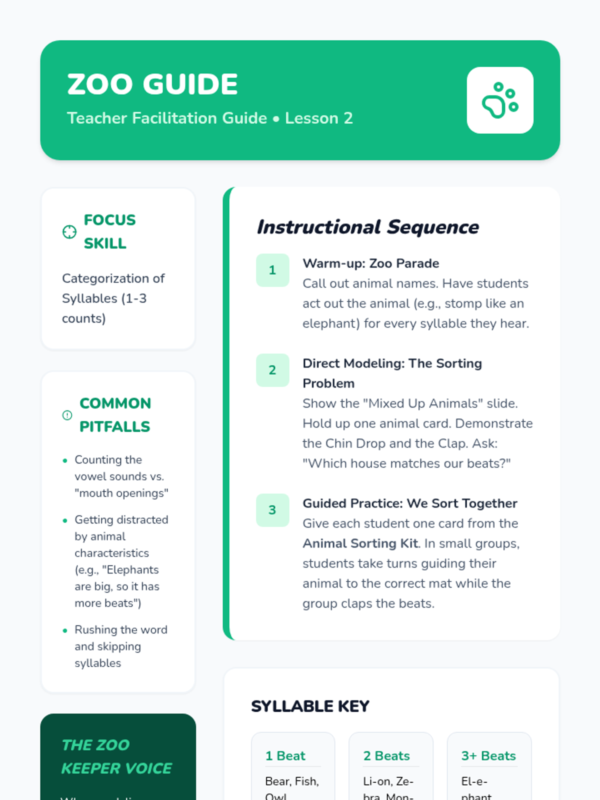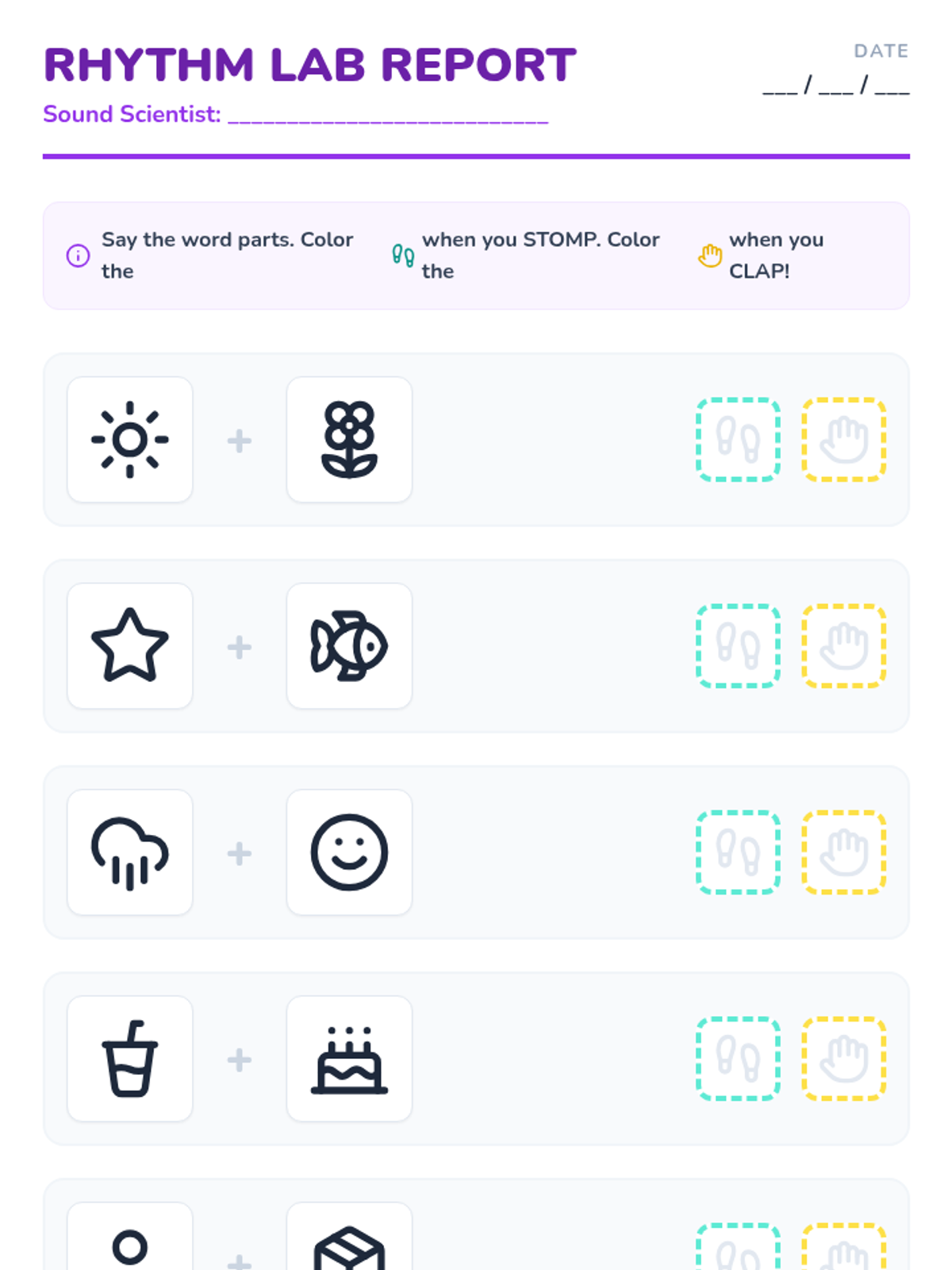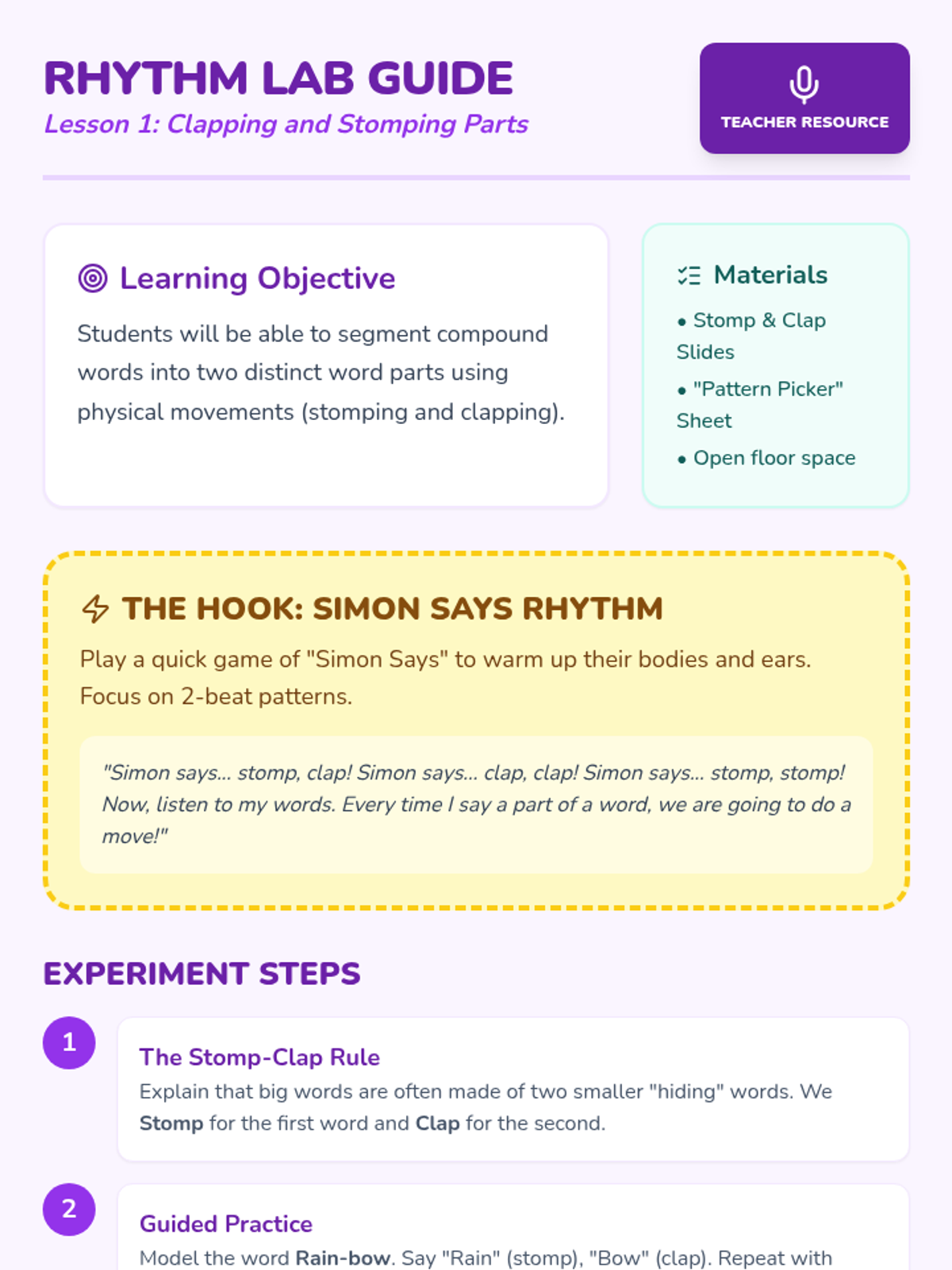 A Kindergarten phonological awareness sequence focused on auditory syllable segmentation. Students learn to hear, count, and manipulate word parts through movement, games, and tactile activities, moving from simple names to complex compound words.