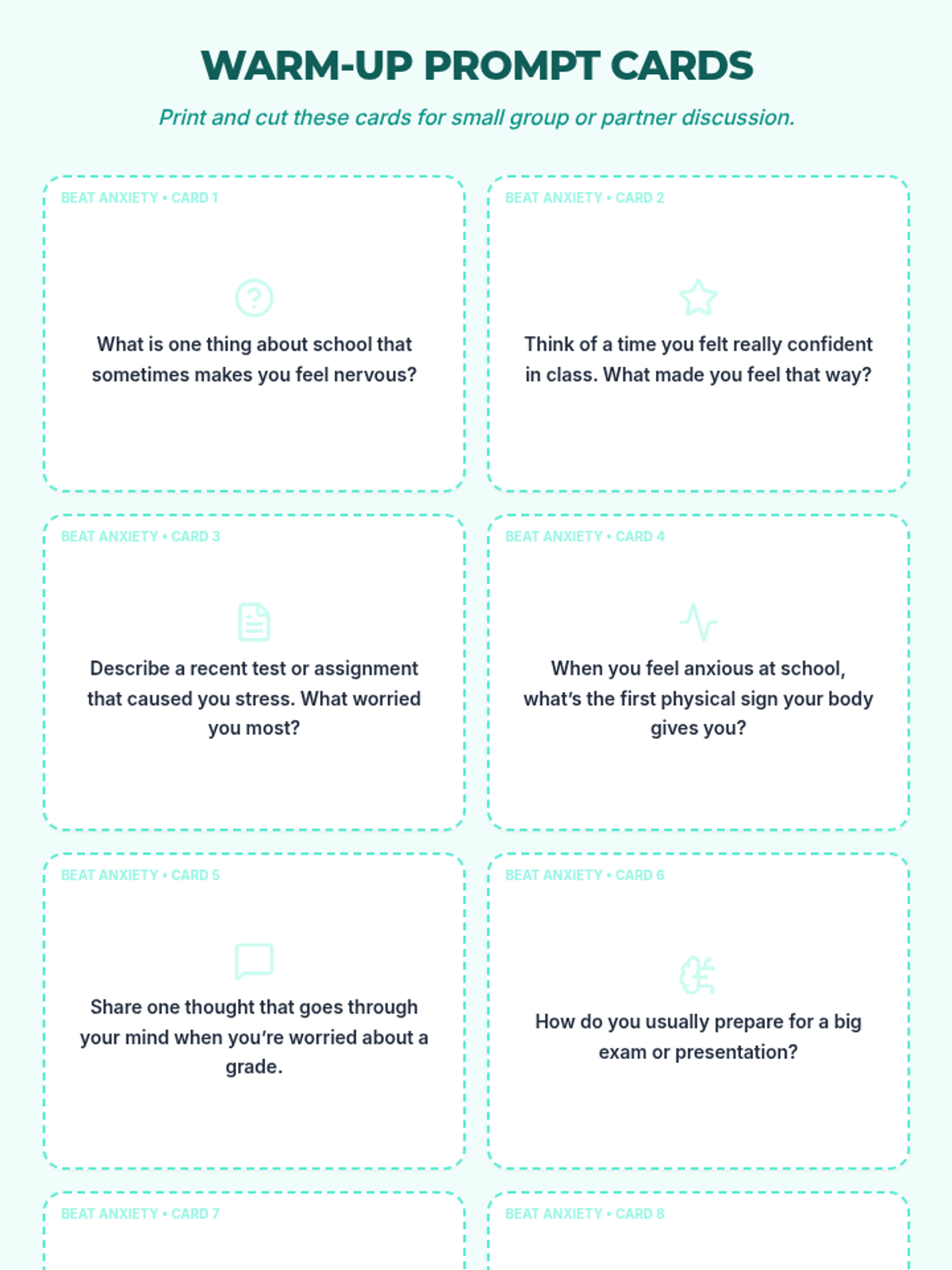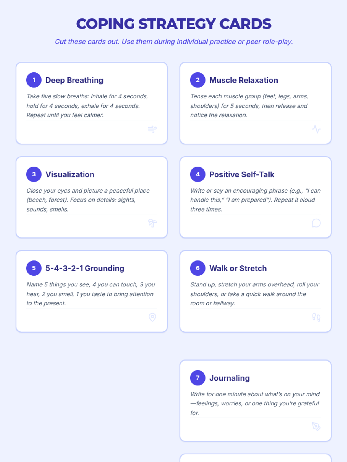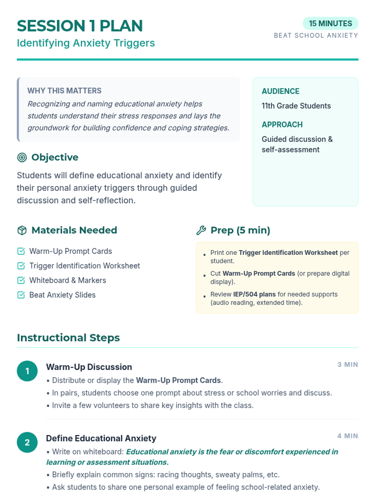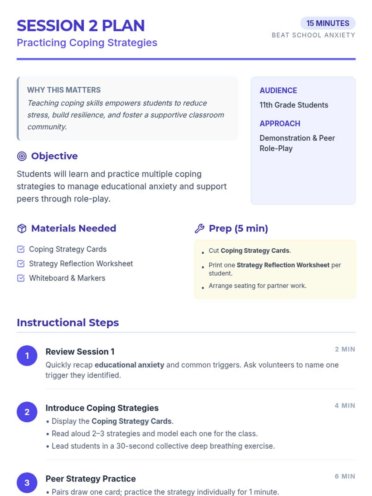 A two-part intervention sequence for 11th graders to identify anxiety triggers and implement effective coping strategies for academic success.