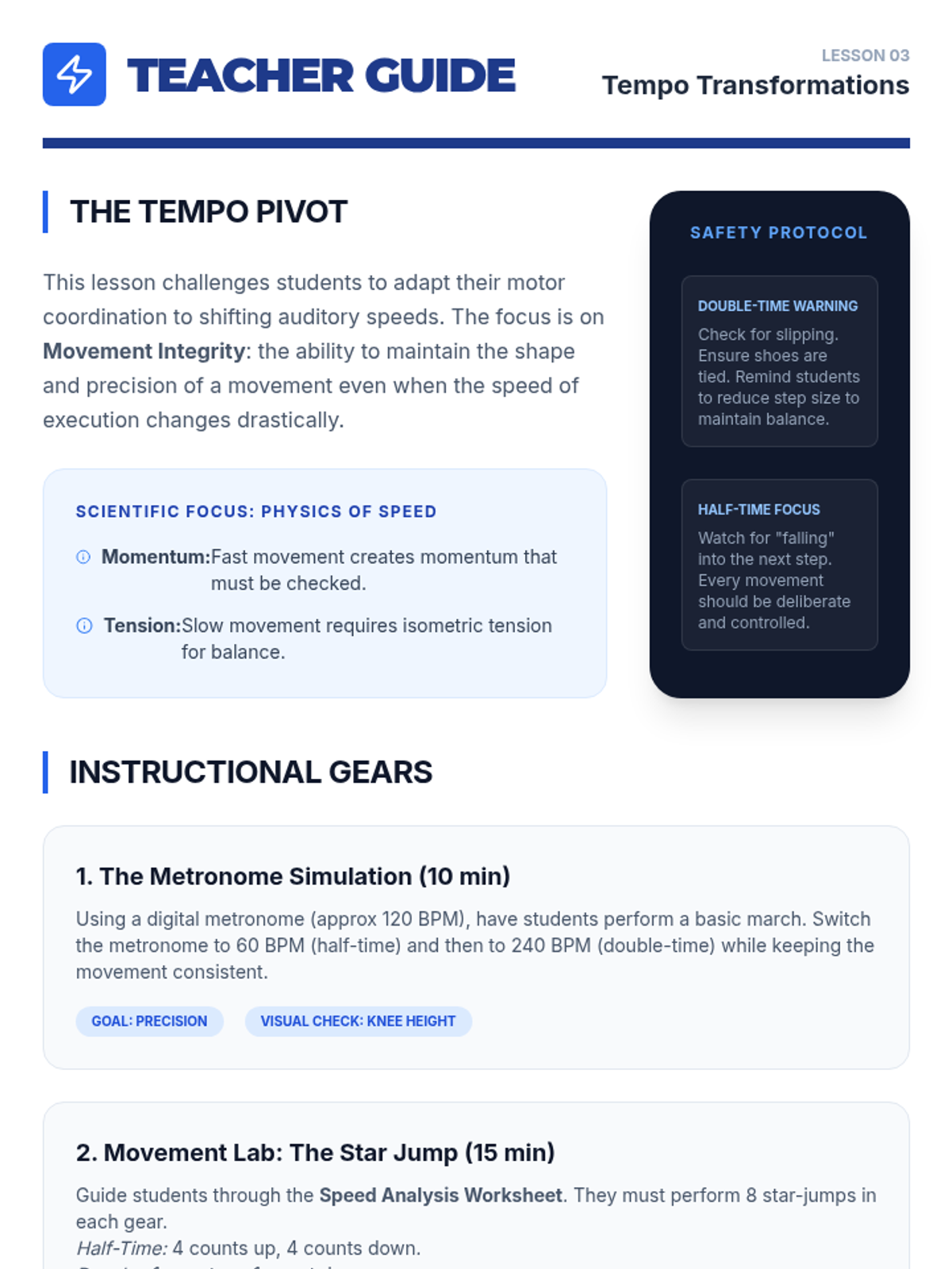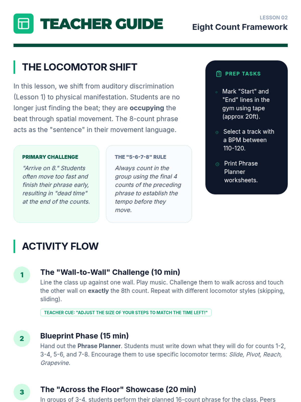 A comprehensive sequence for 9th Grade Physical Education focusing on beat identification, 8-count phrasing, tempo variations, and group synchronization. Students progress from basic auditory discrimination to performing complex rhythmic movements in unison.