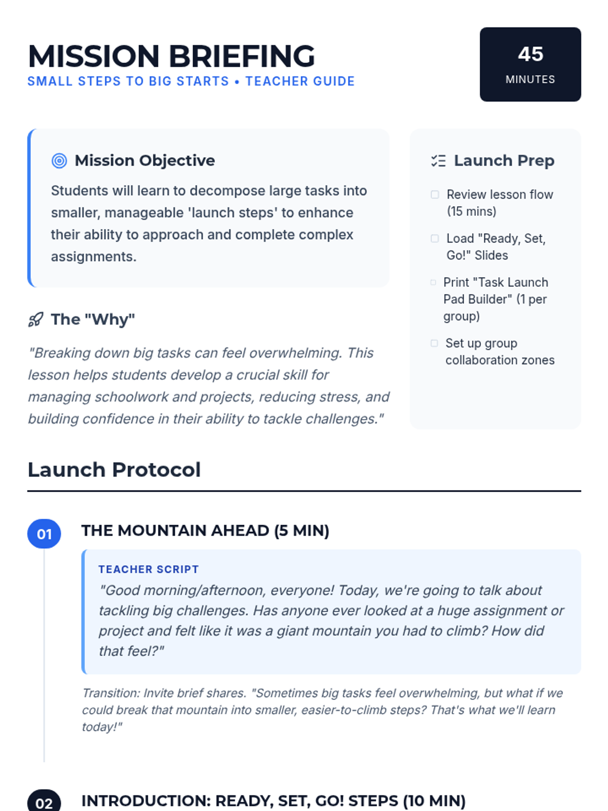 A two-part series designed to help middle school students overcome procrastination by understanding the psychology of starting and mastering the art of breaking large projects into manageable steps.