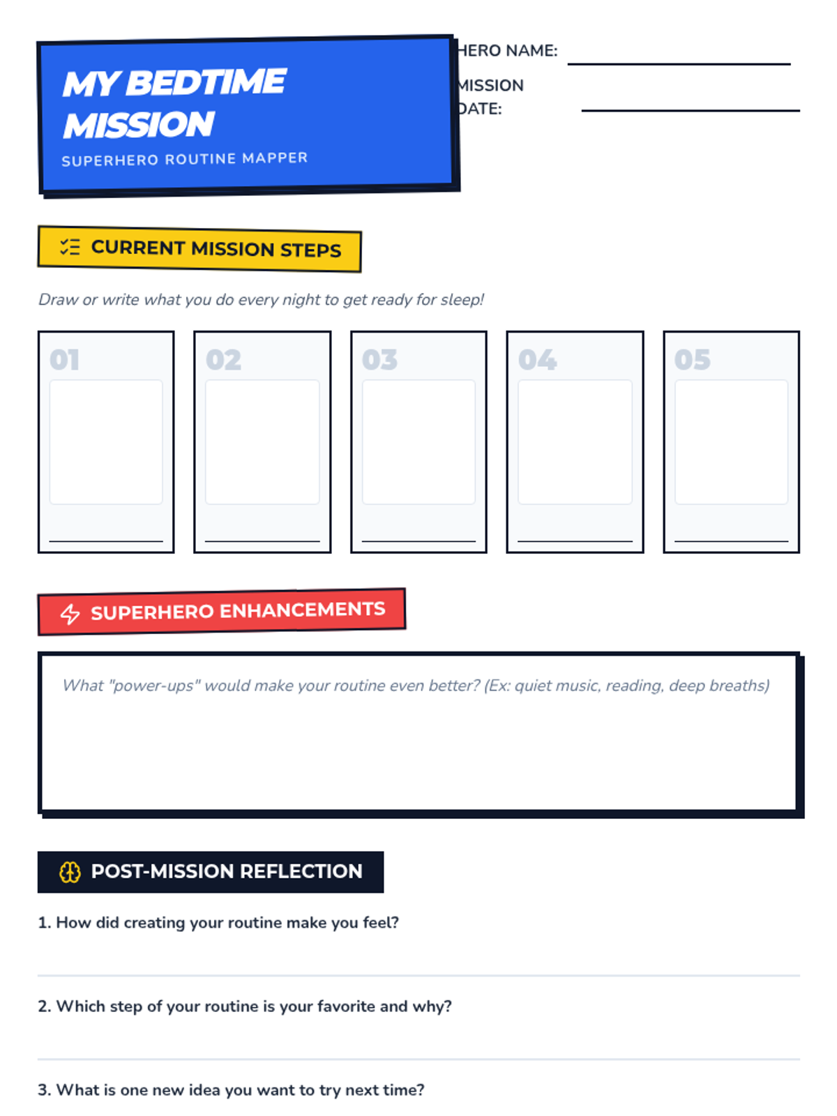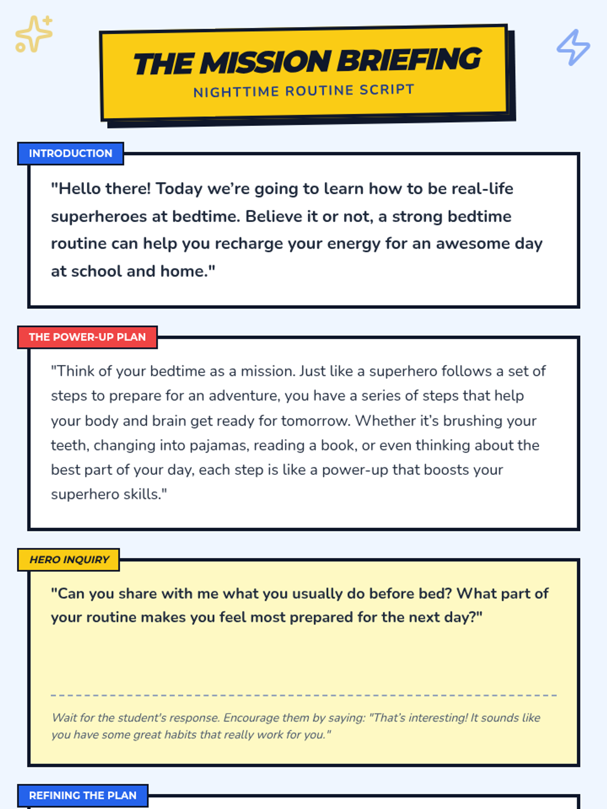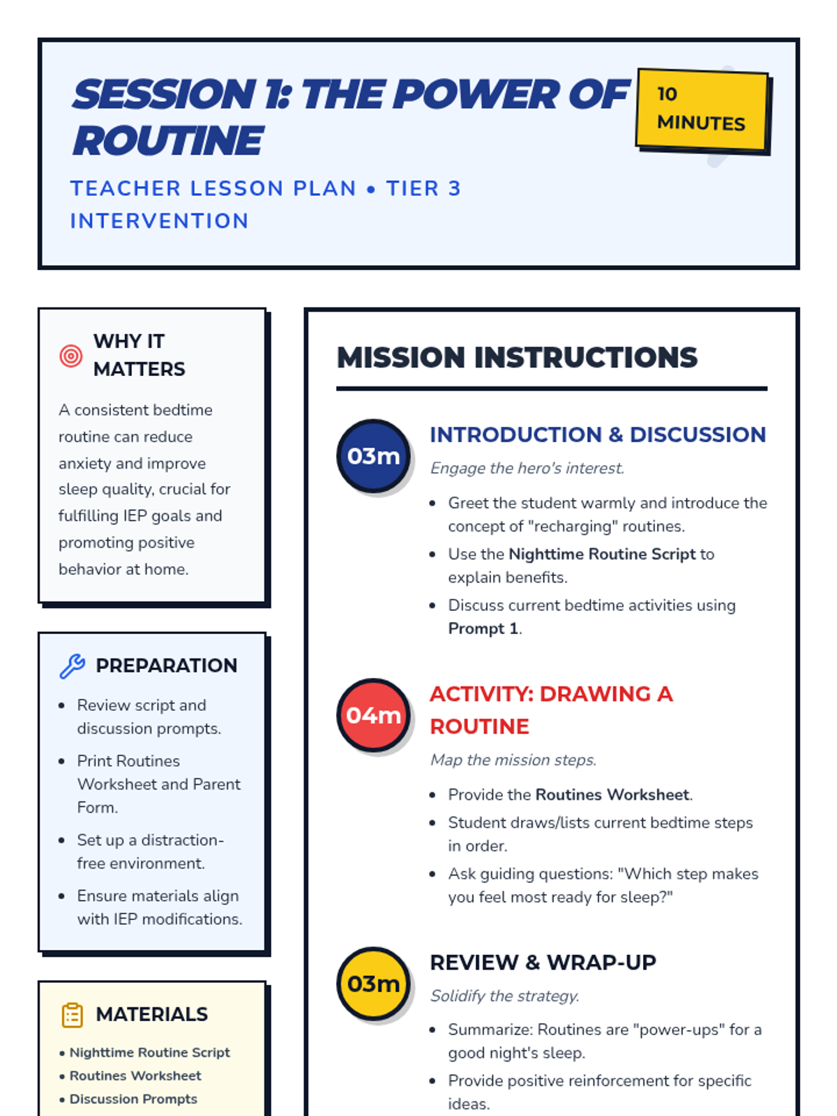 A 5-session Tier 3 intervention for a 2nd-grade student to improve bedtime routines and nighttime behaviors using a superhero-themed approach. Each session focuses on a different aspect of self-regulation and organization to promote better sleep and positive behavior.