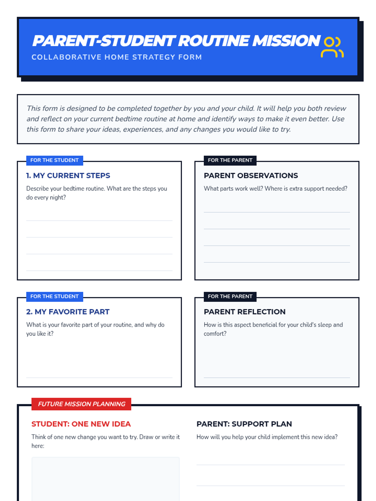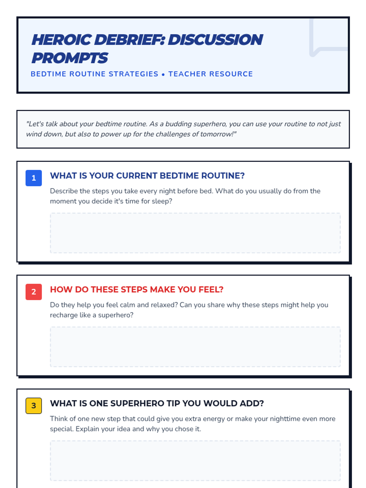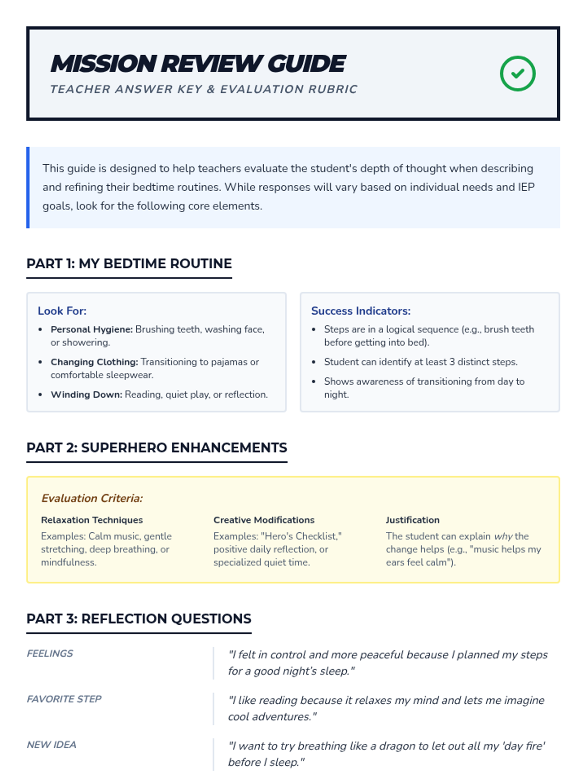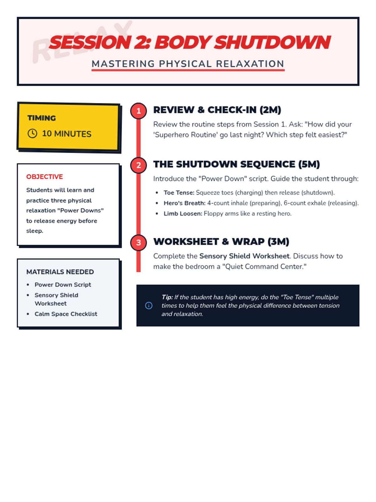 A 5-session Tier 3 intervention for a 2nd-grade student to improve bedtime routines and nighttime behaviors using a superhero-themed approach. Each session focuses on a different aspect of self-regulation and organization to promote better sleep and positive behavior.