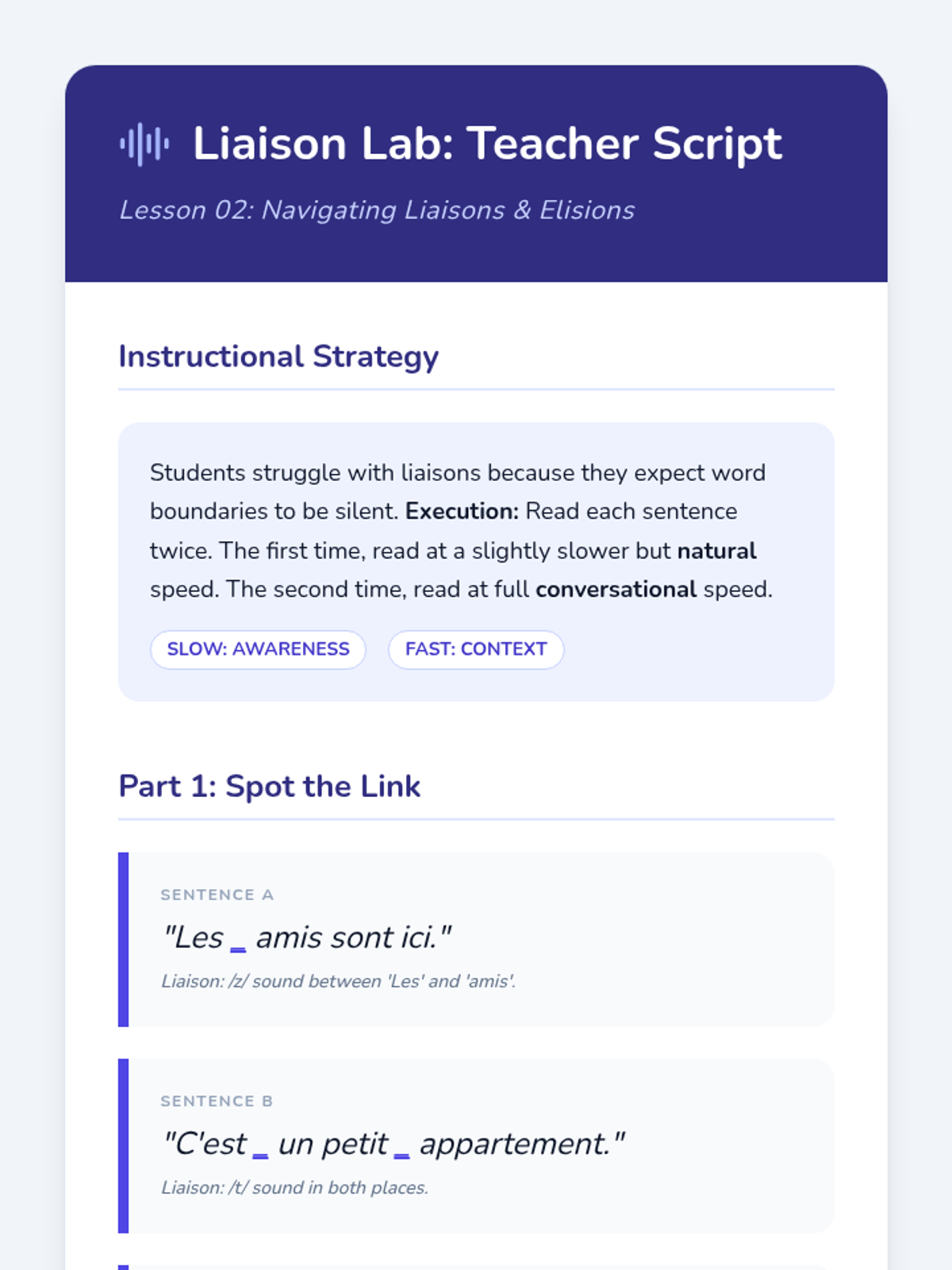 A foundational sequence for beginner French students focusing on phonetics, nasal sounds, liaisons, and intonation to improve listening comprehension and transcription skills.