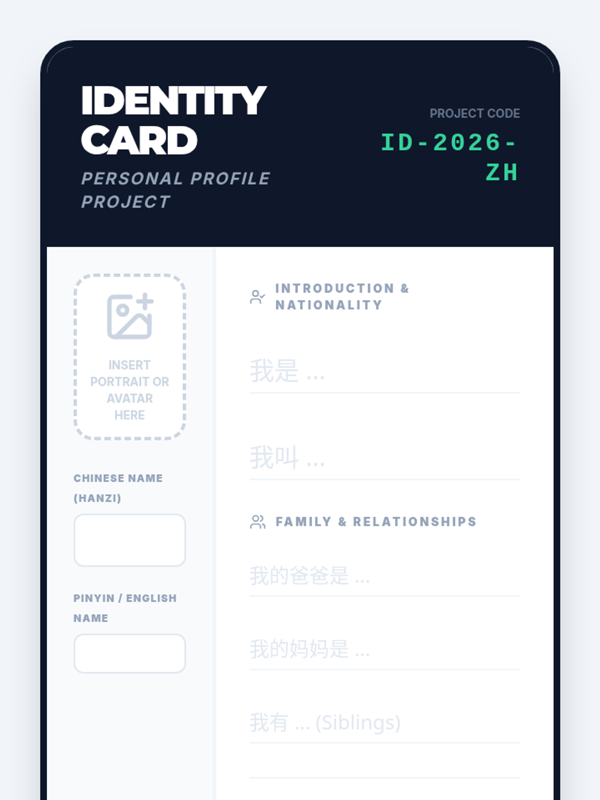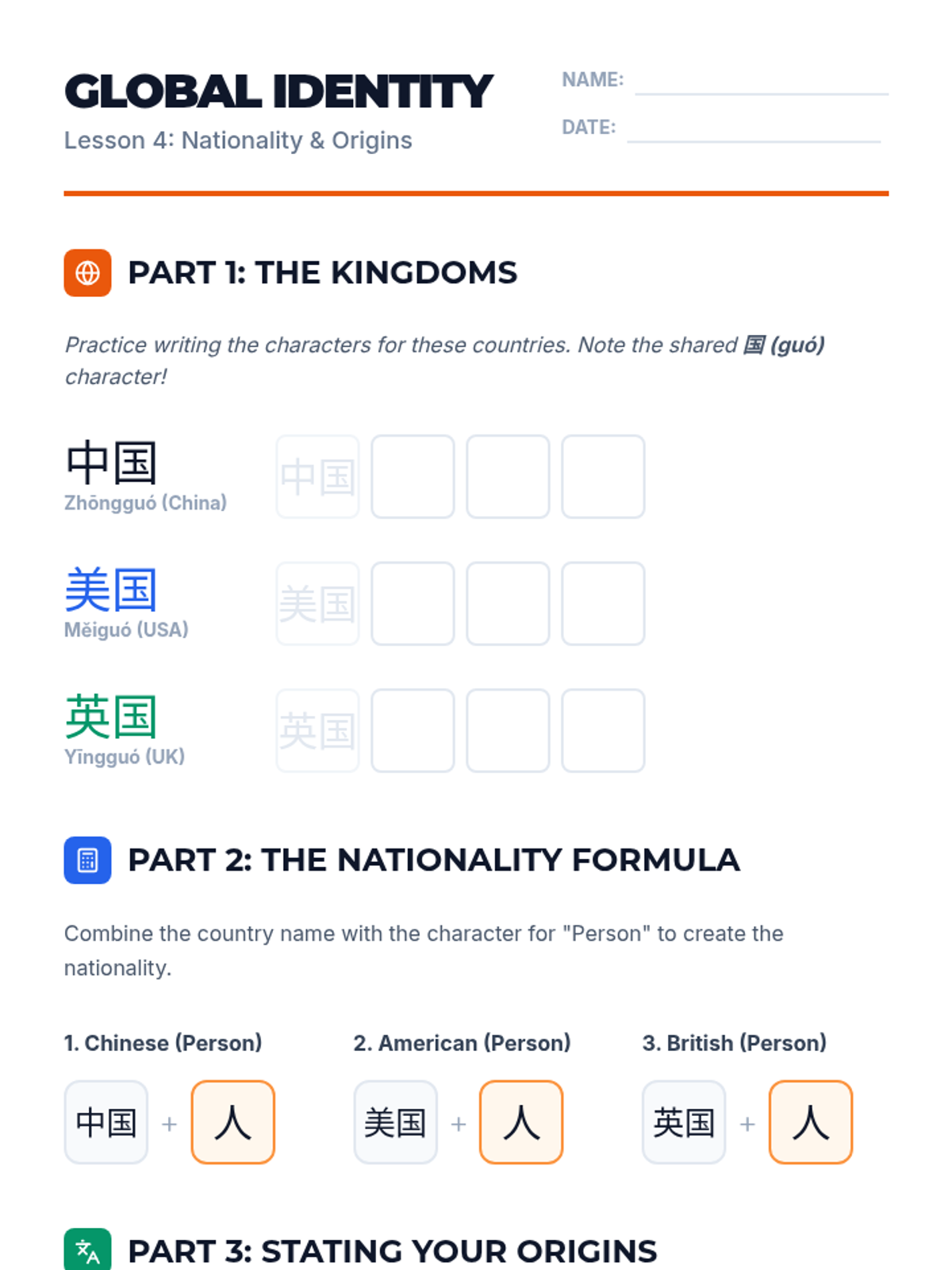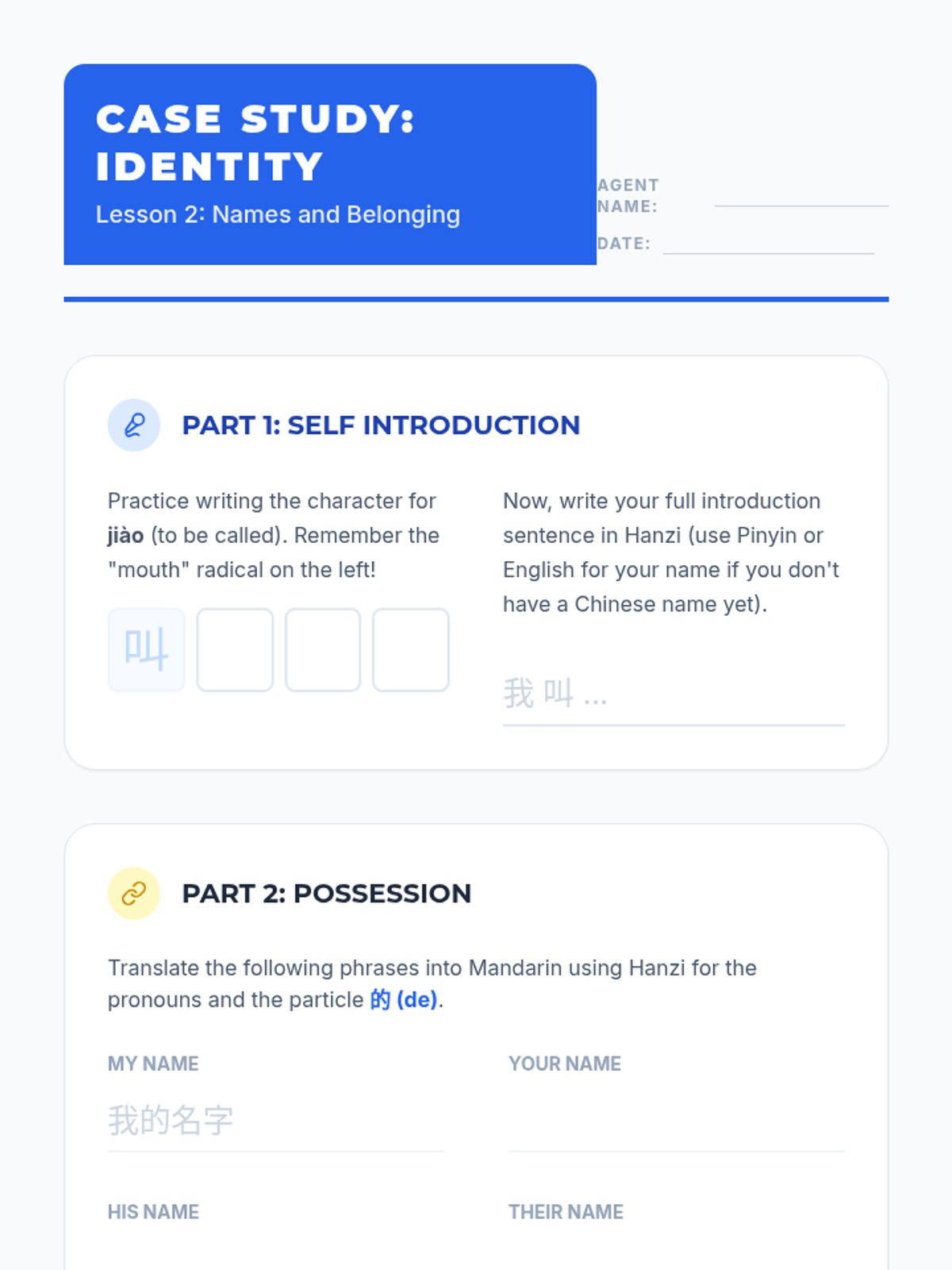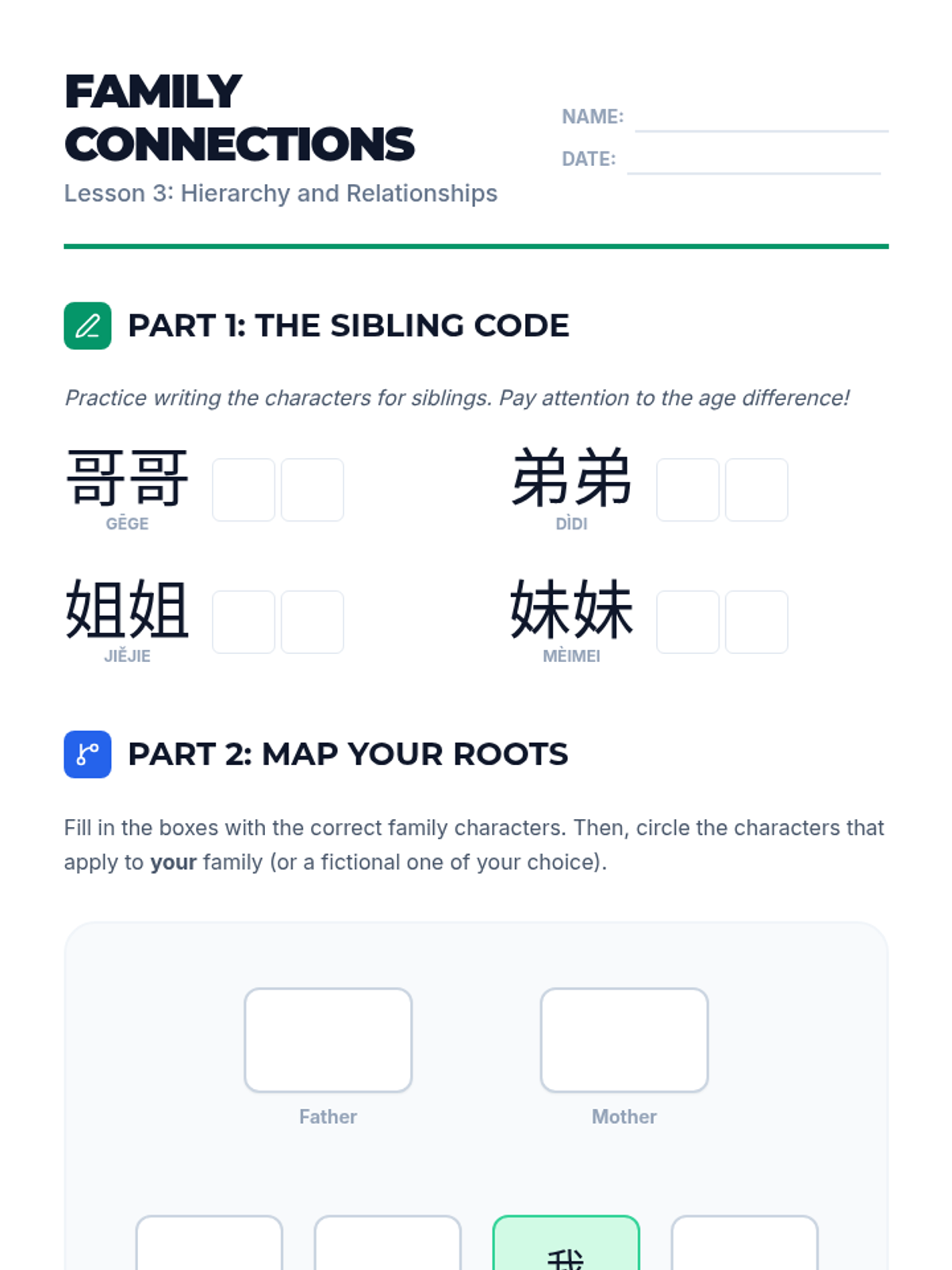 A beginner's sequence for 8th Grade students focused on writing high-frequency Mandarin characters for pronouns, family, and nationality. Students develop the ability to introduce themselves and describe their social circles in written Hanzi.