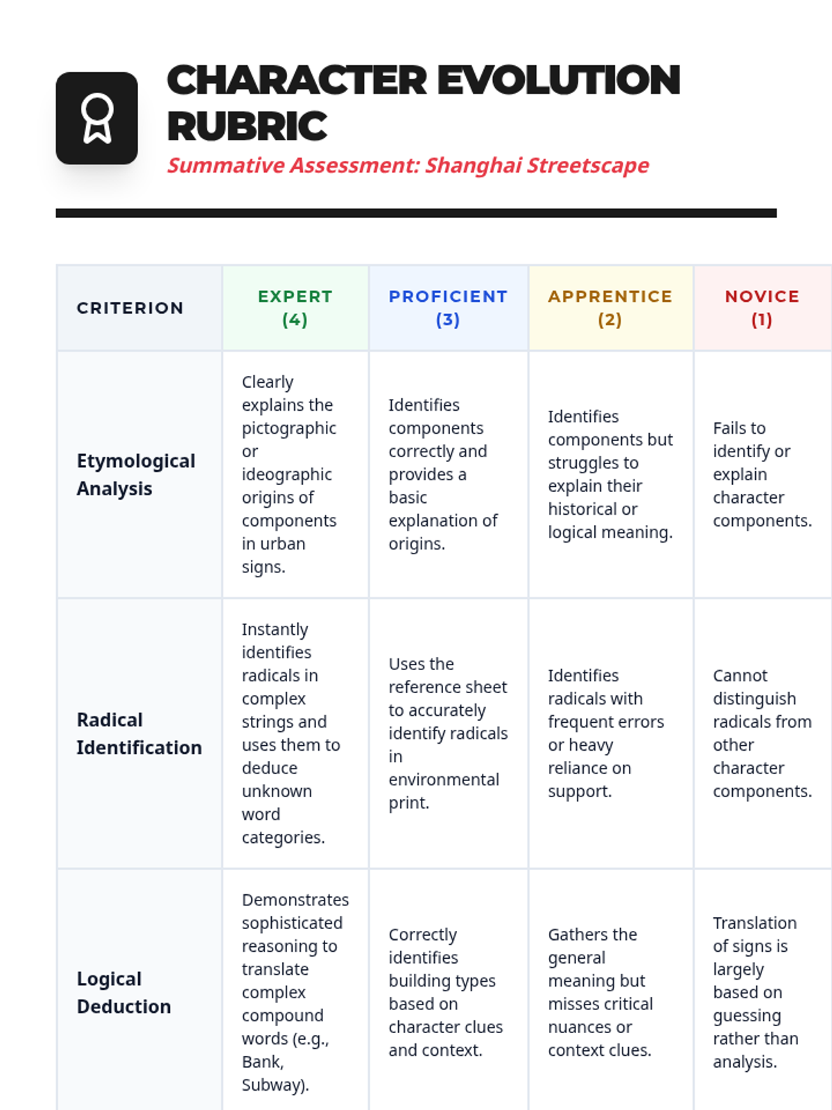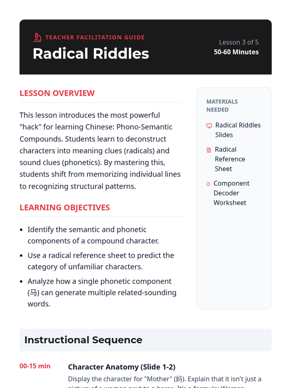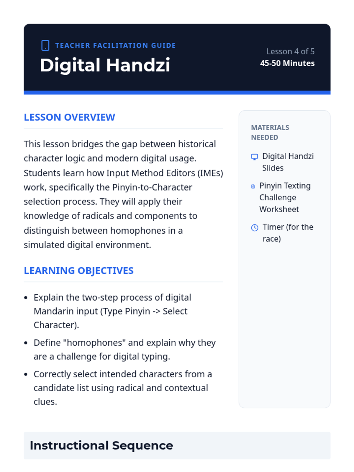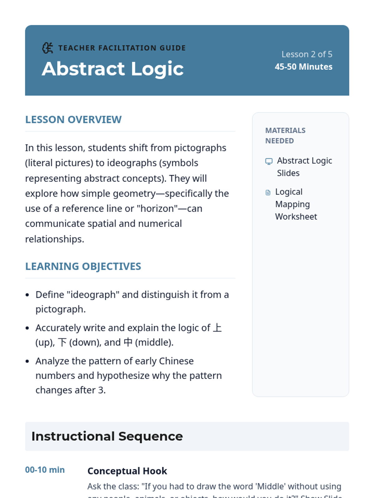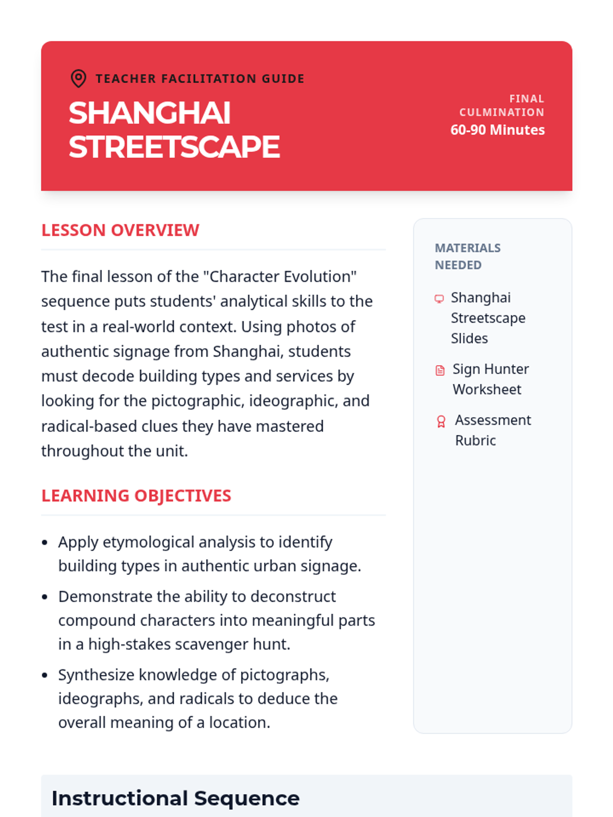 This sequence explores the etymological evolution of Mandarin Chinese characters from ancient Oracle Bone Script to modern digital input. Students analyze pictographs, ideographs, and phono-semantic compounds to understand the logic of the written language and apply this knowledge to real-world environmental print.