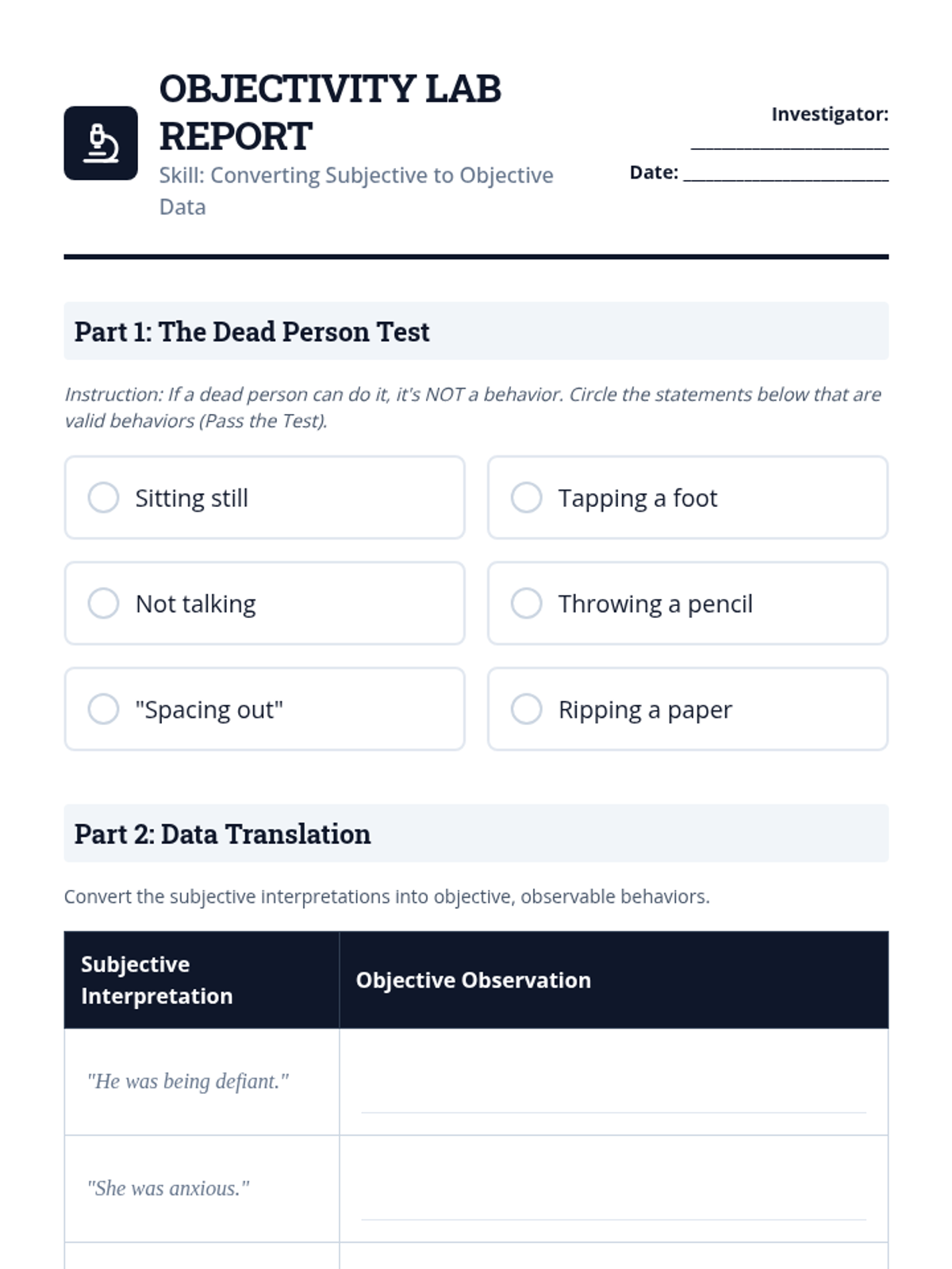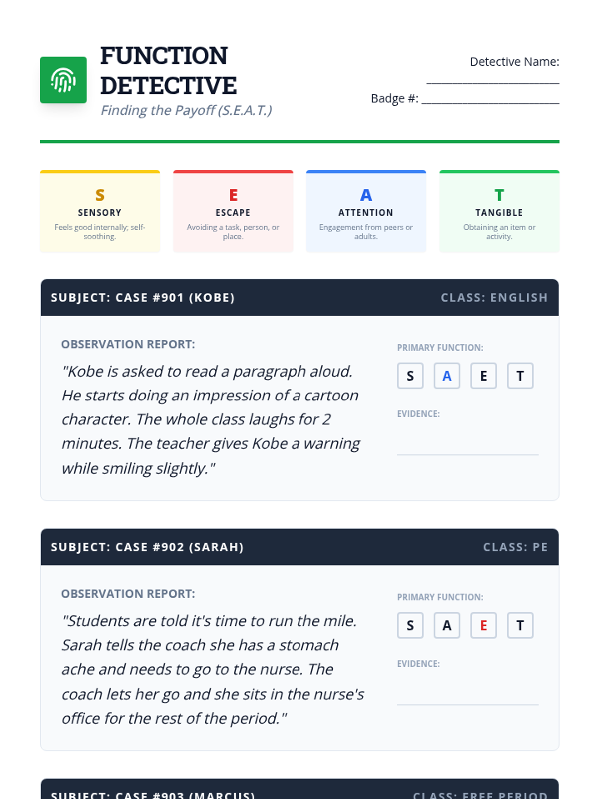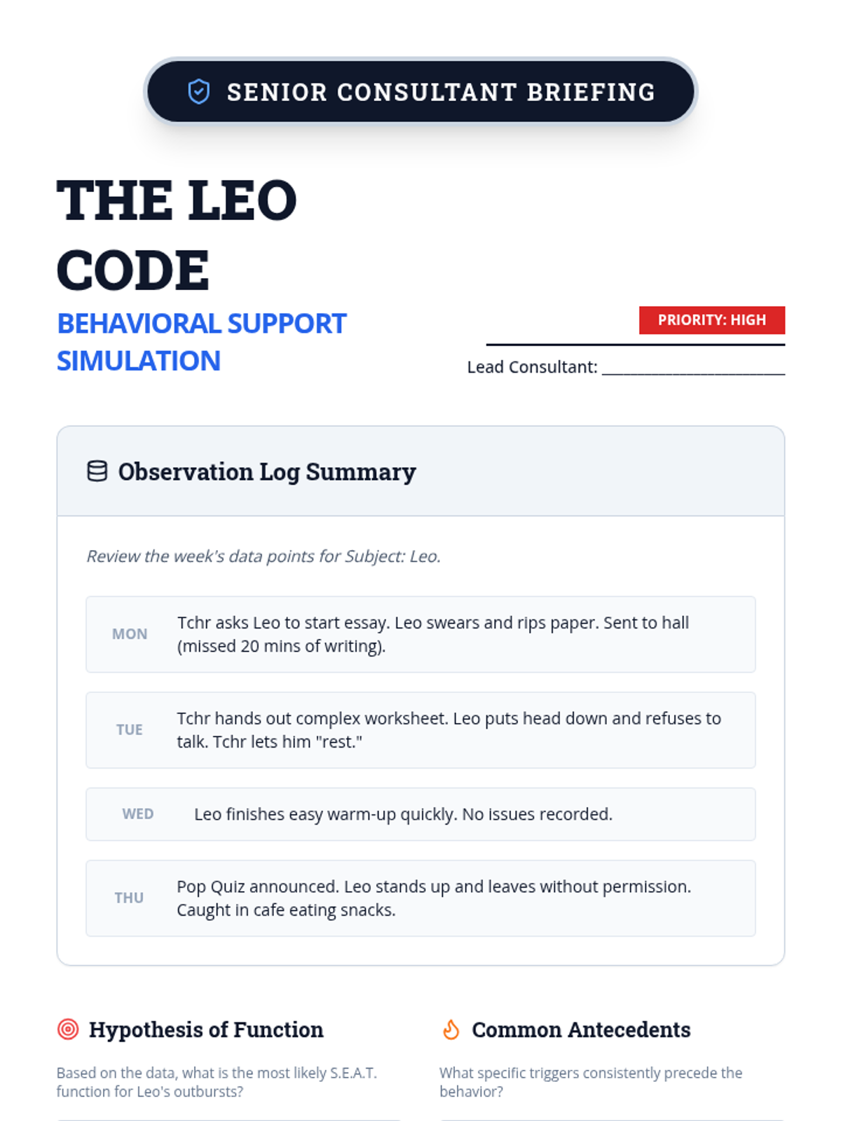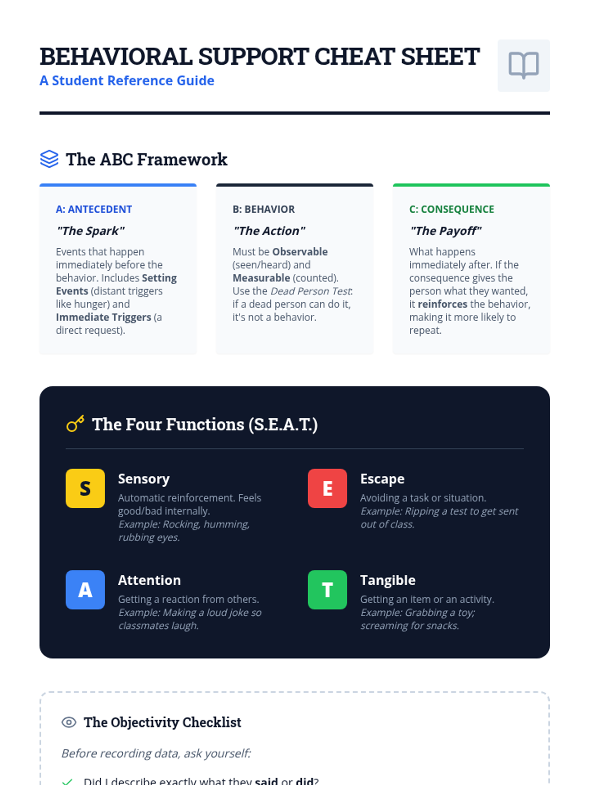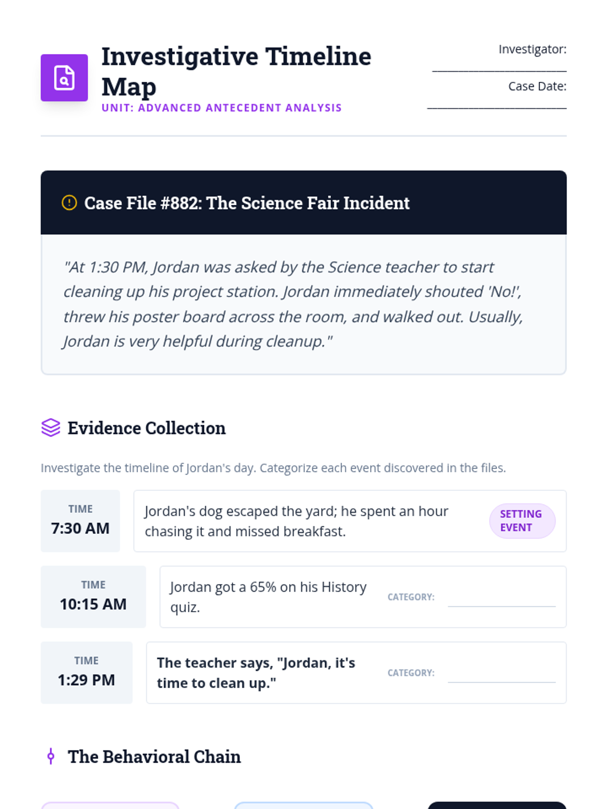 A comprehensive sequence for 9th-grade students to master behavioral analysis using the ABC framework. Students move from basic categorization to objective observation, contextual analysis of antecedents, and determining the function of behavior to create support plans.