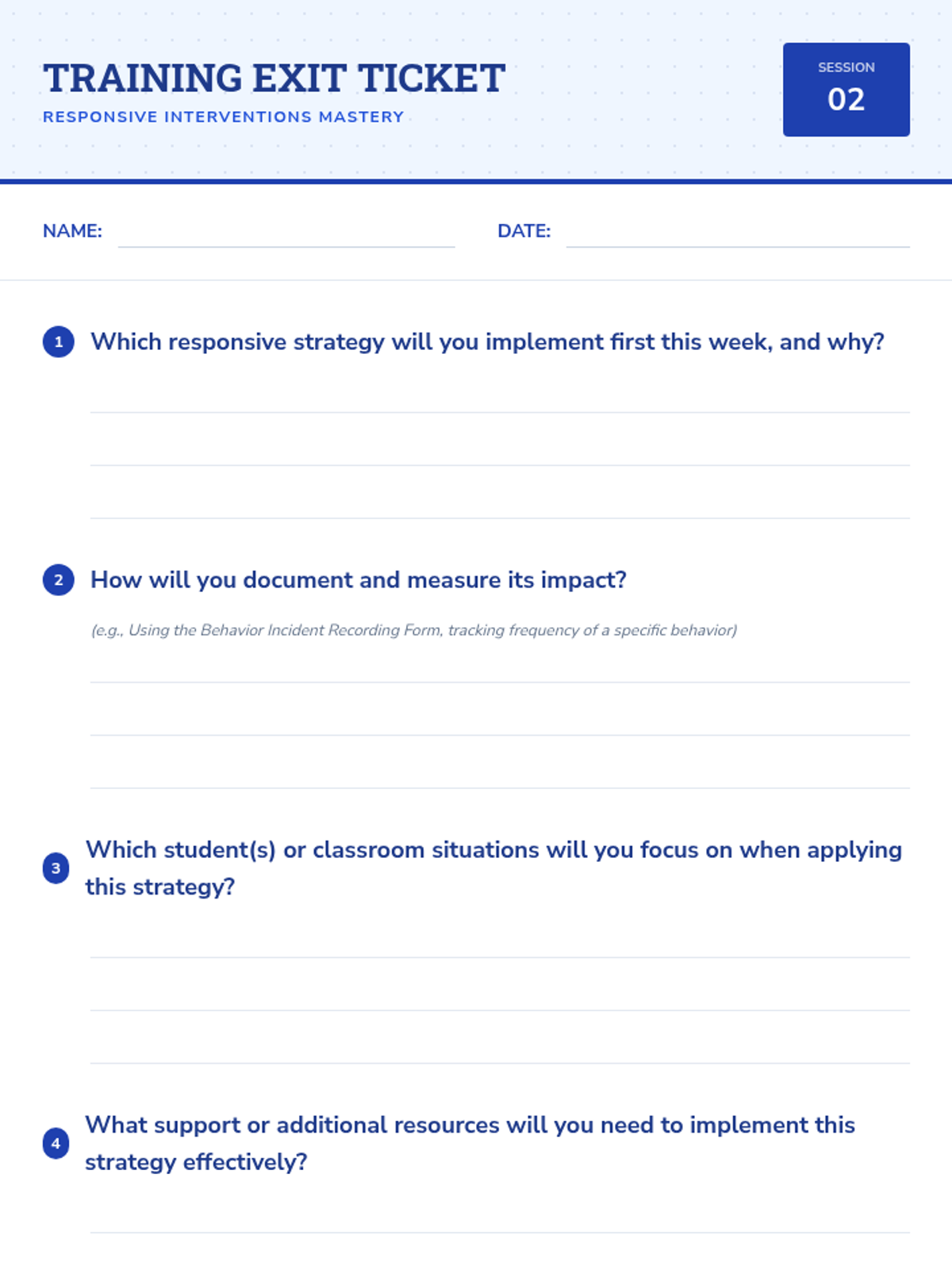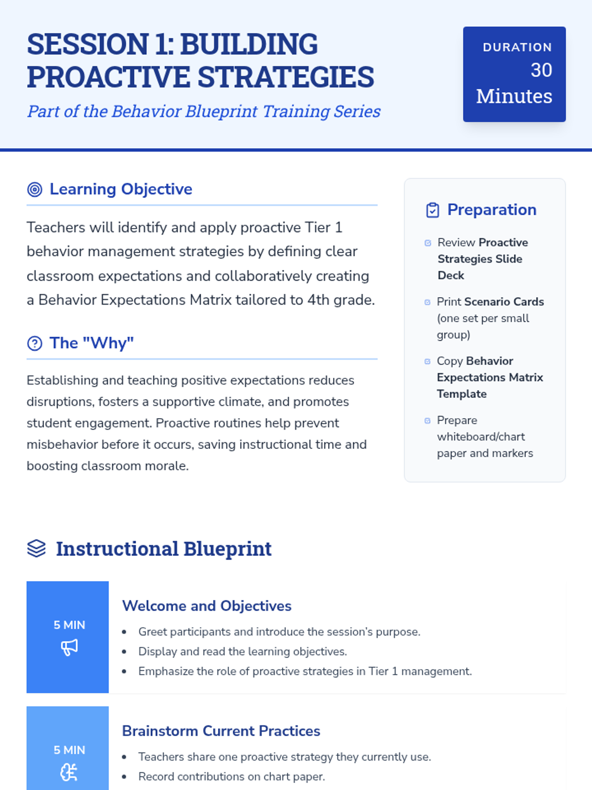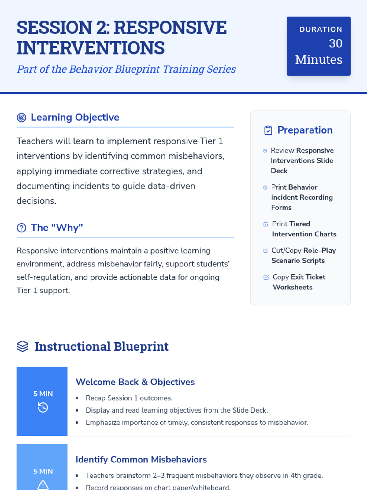 A two-session teacher training program for 4th-grade educators, focusing on proactive routines and responsive Tier 1 behavior management interventions.