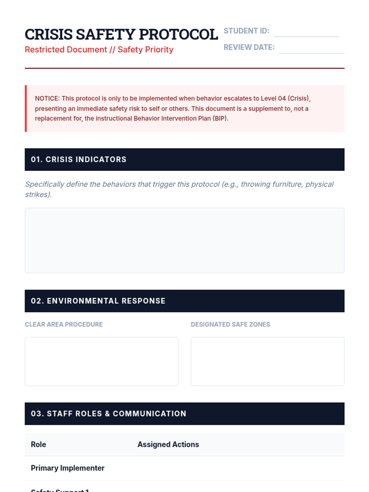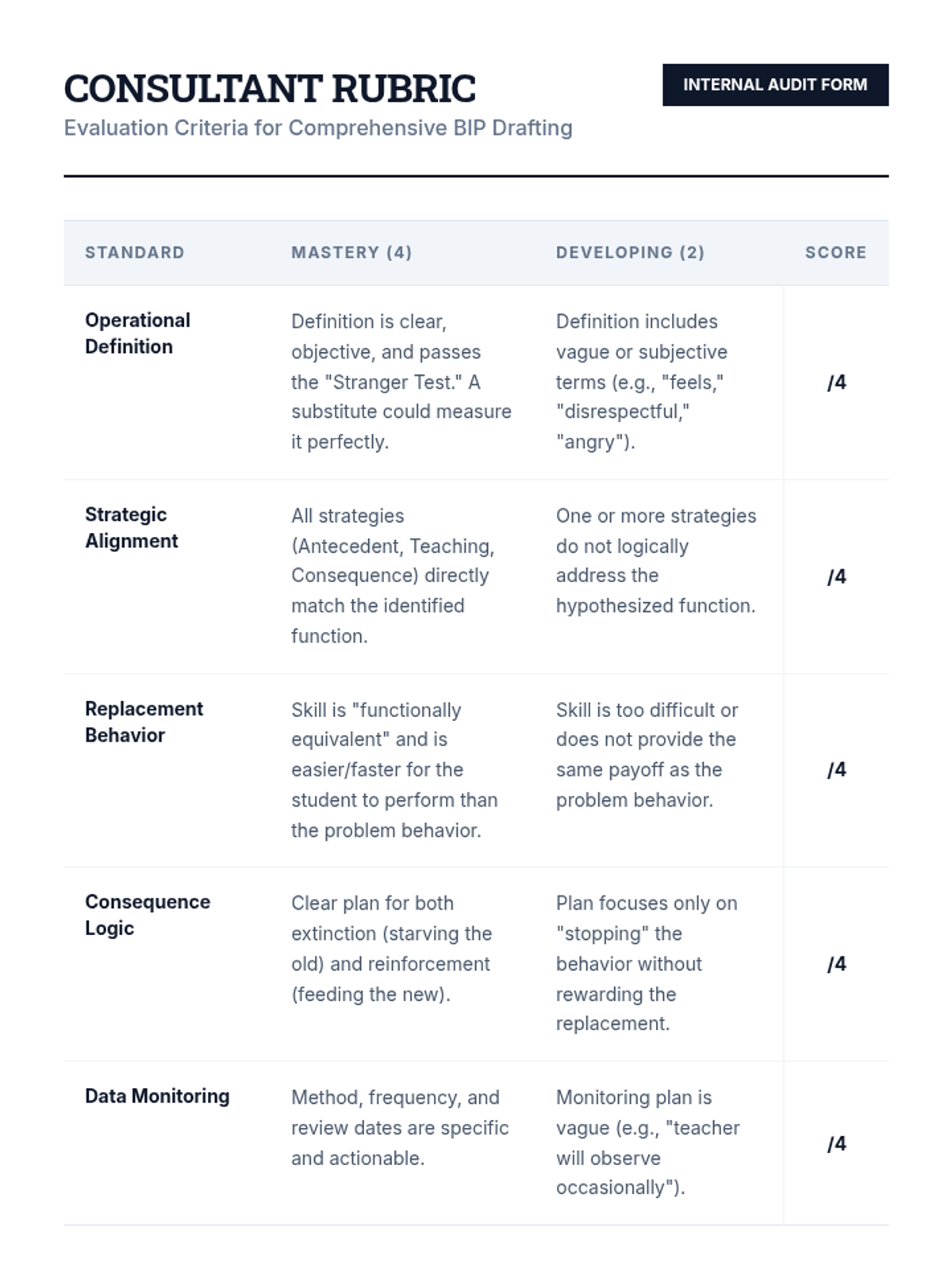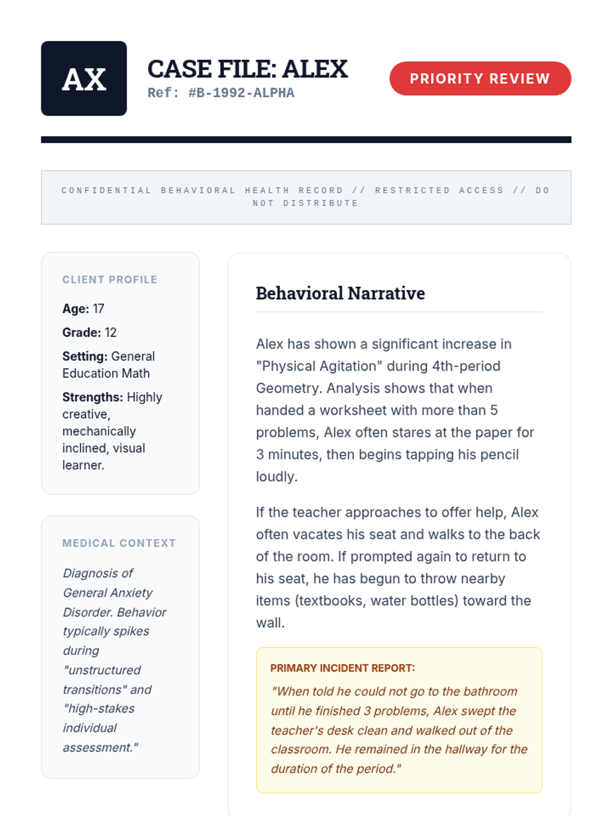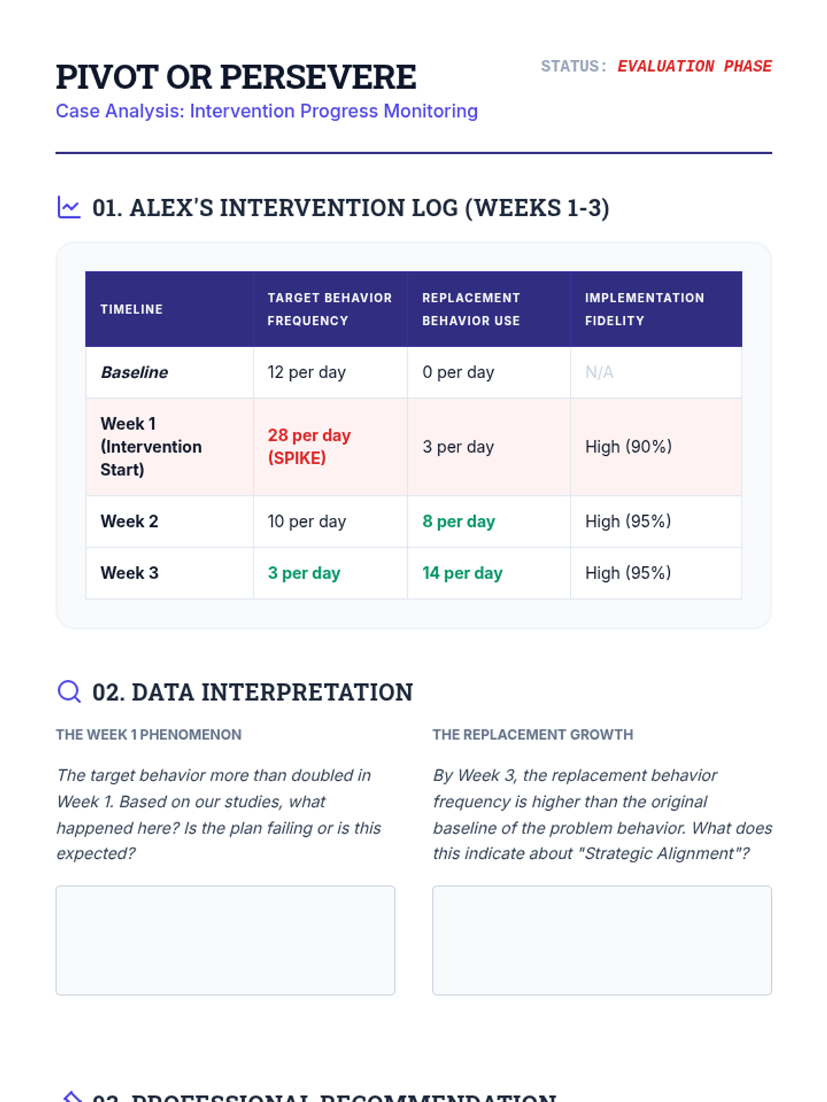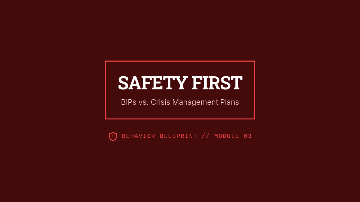 An advanced 12th-grade sequence on developing Comprehensive Behavior Intervention Plans (BIPs). Students transition from theoretical knowledge to professional application, following a complex case study through hypothesis, prevention, skill teaching, consequence strategies, and data-based decision making.