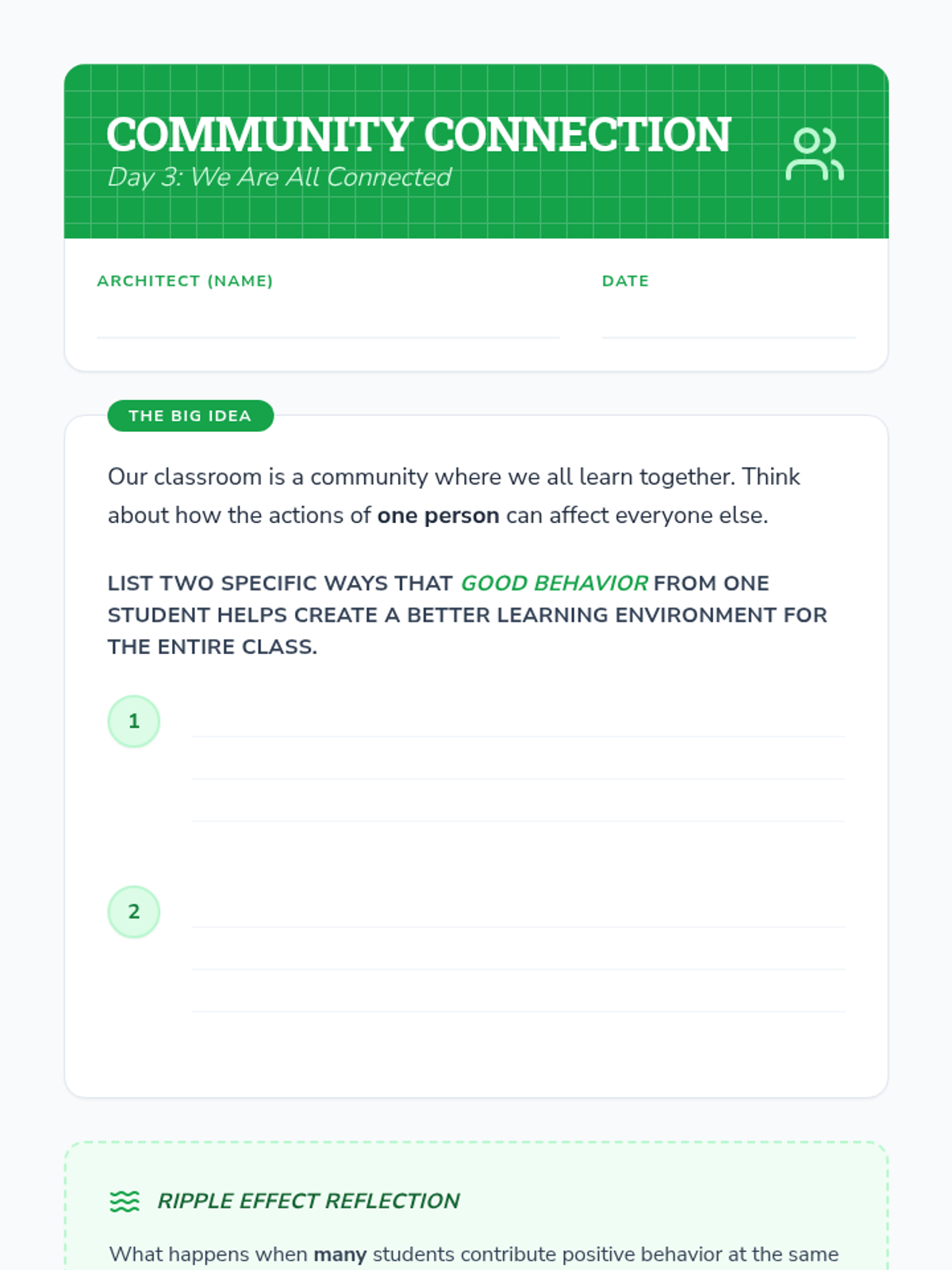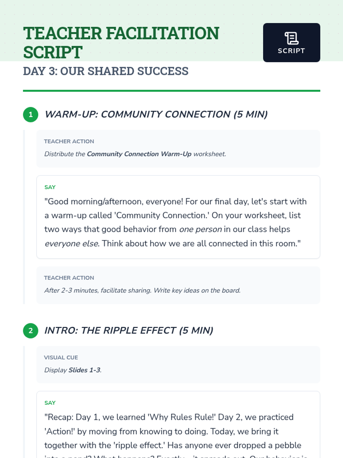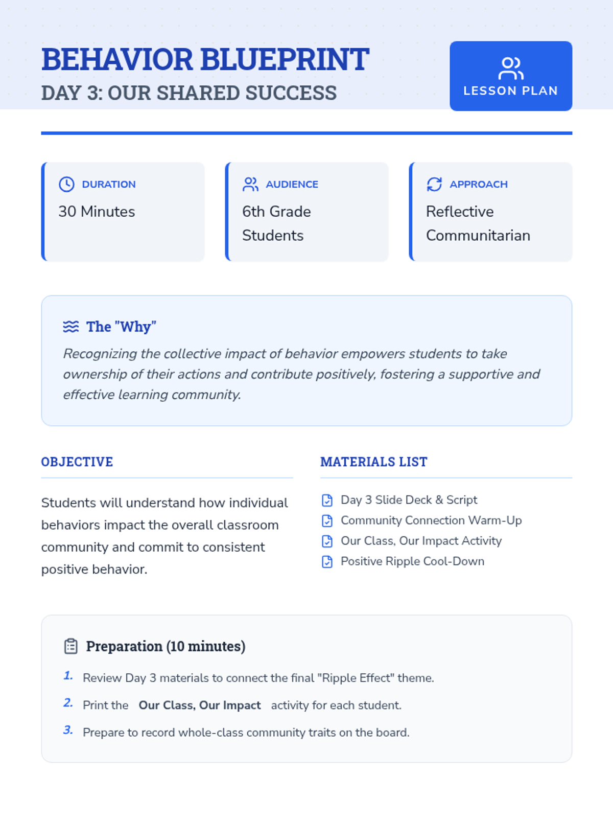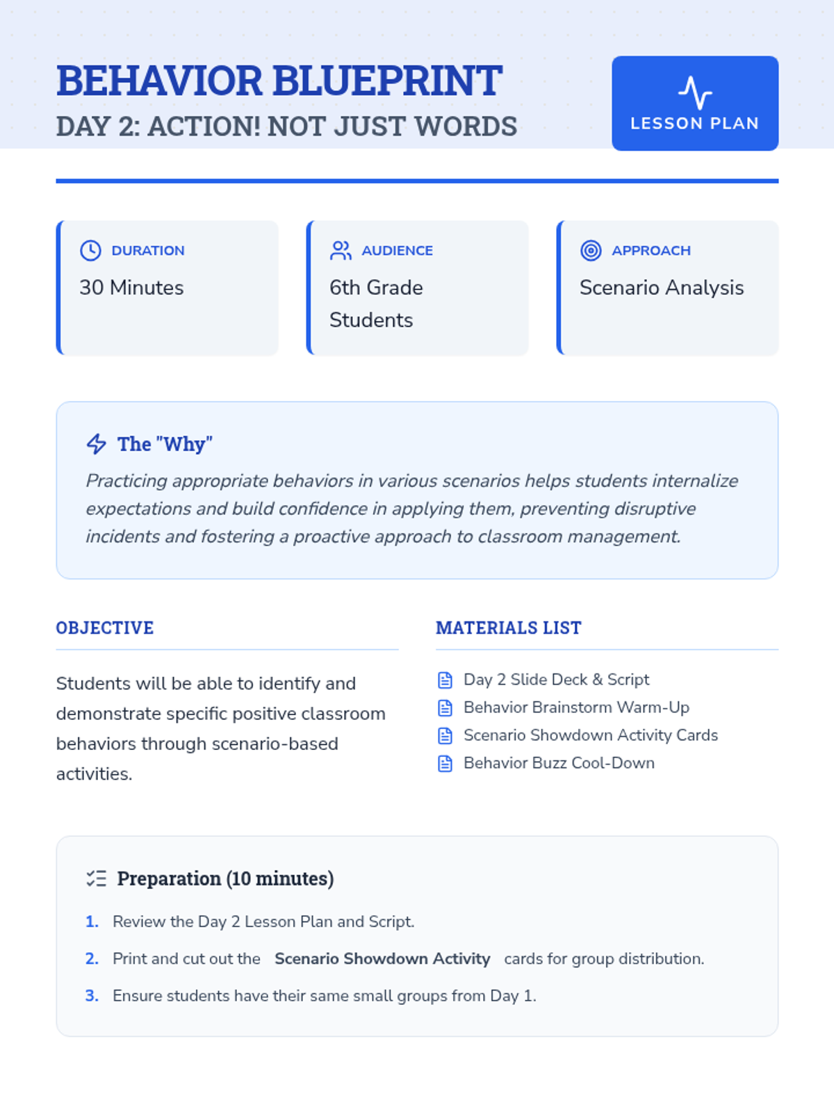A 3-day guidance sequence for 6th-grade students to understand the purpose of rules, practice positive behaviors through scenarios, and build a cohesive classroom community.