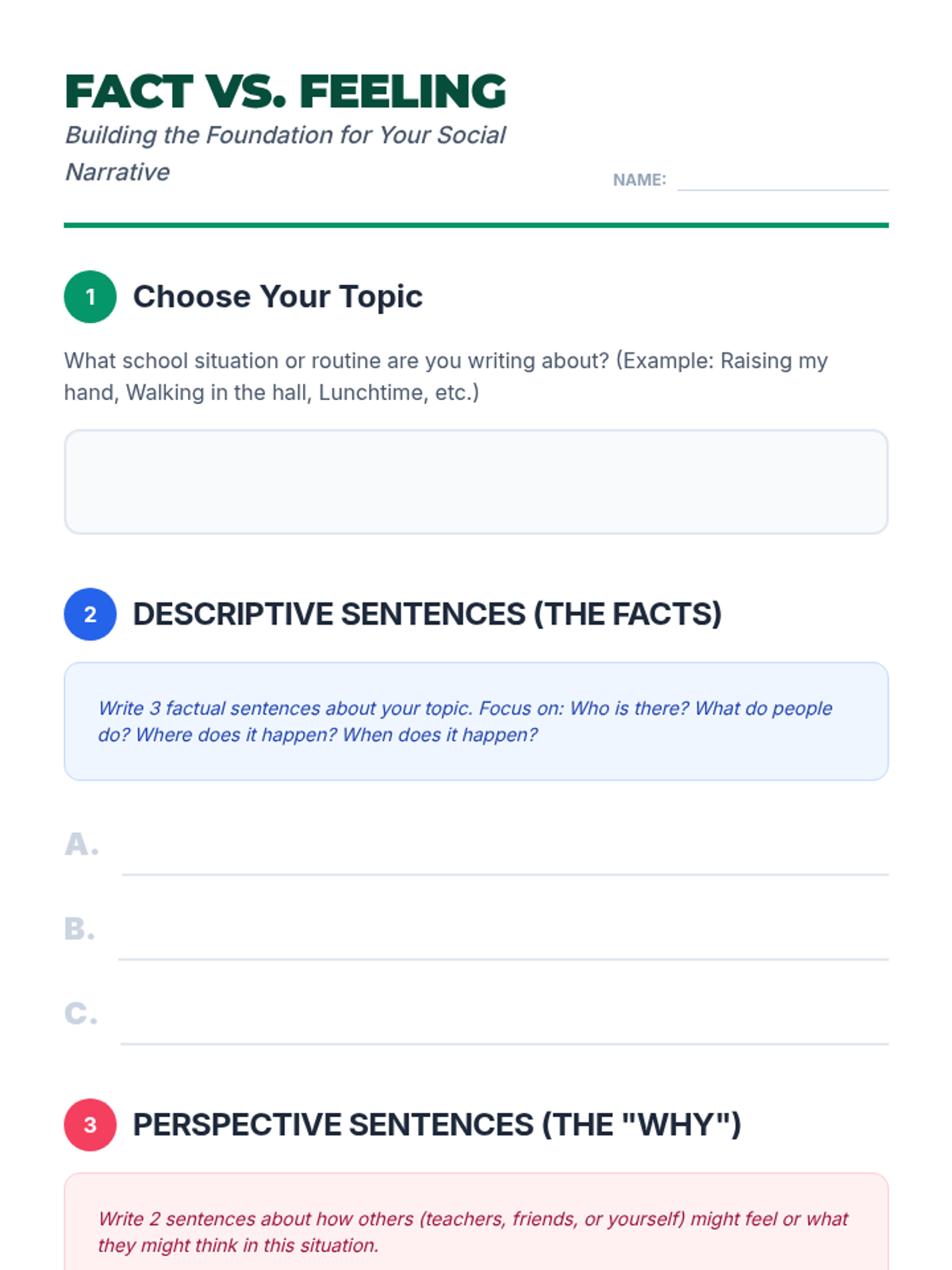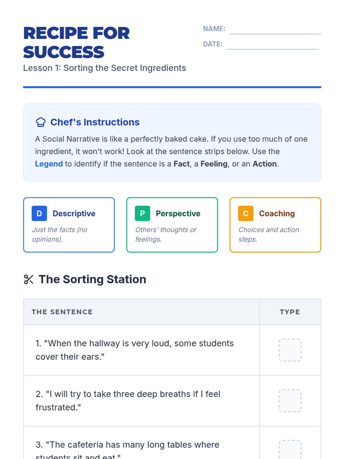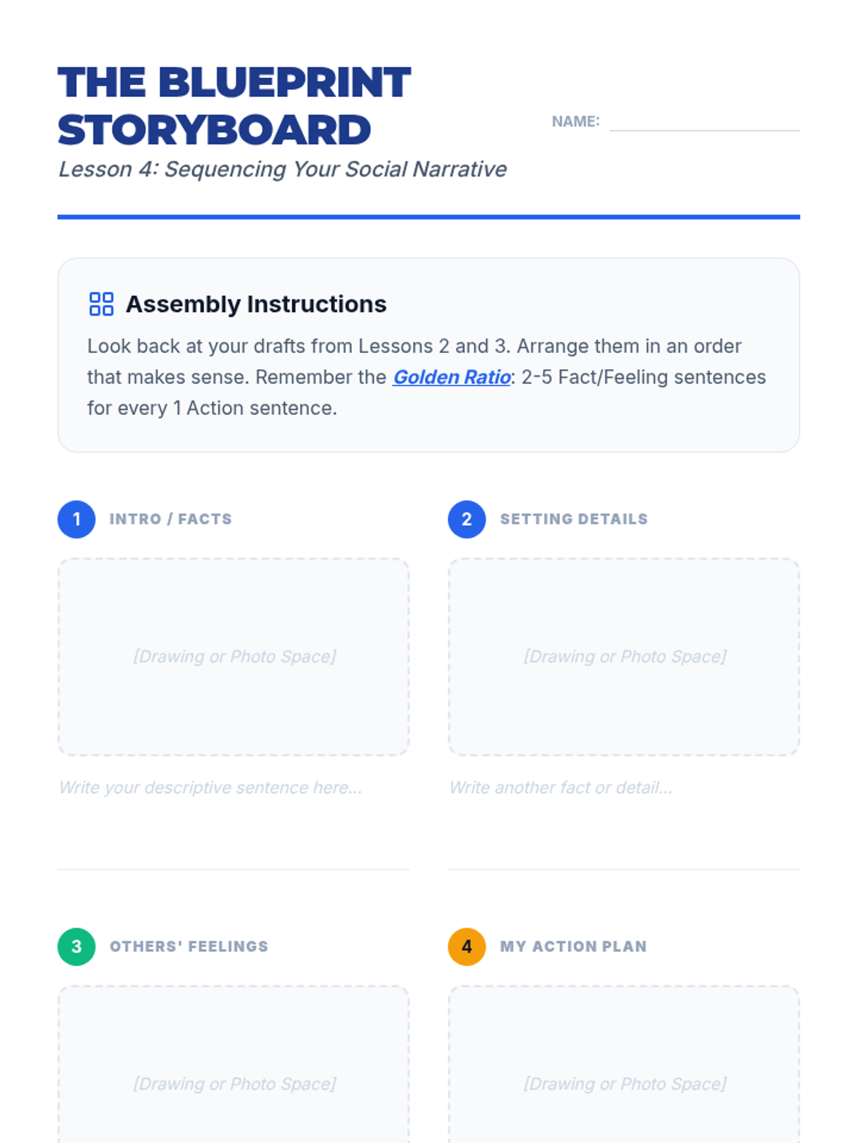 A comprehensive workshop sequence where students learn to draft, refine, and publish their own social narratives using Carol Gray's sentence ratios to support self-regulation and goal attainment.