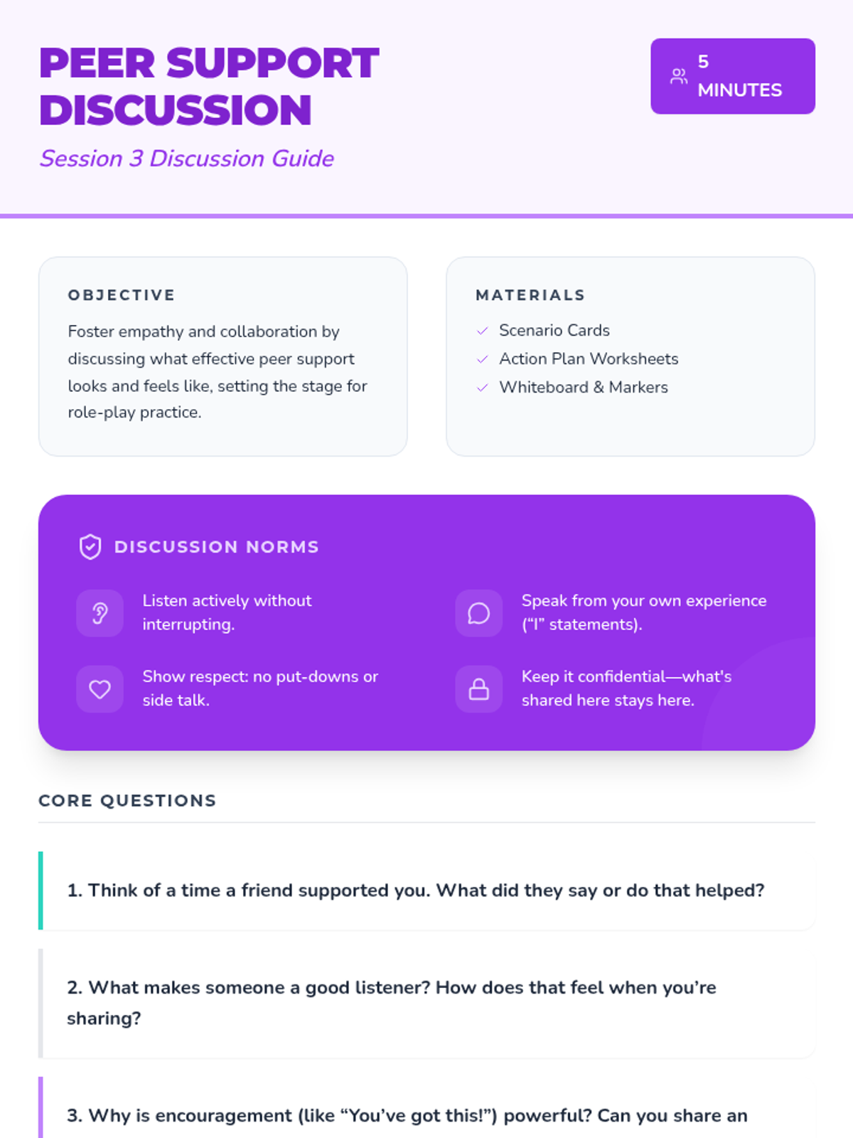 A comprehensive 8-session program designed for youth ages 9-18, focusing on essential life skills including self-esteem, resilience, time management, and conflict resolution through interactive role-plays and guided instruction.