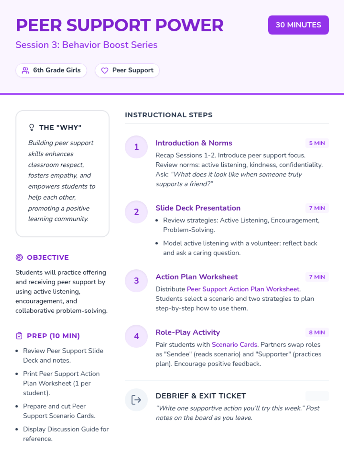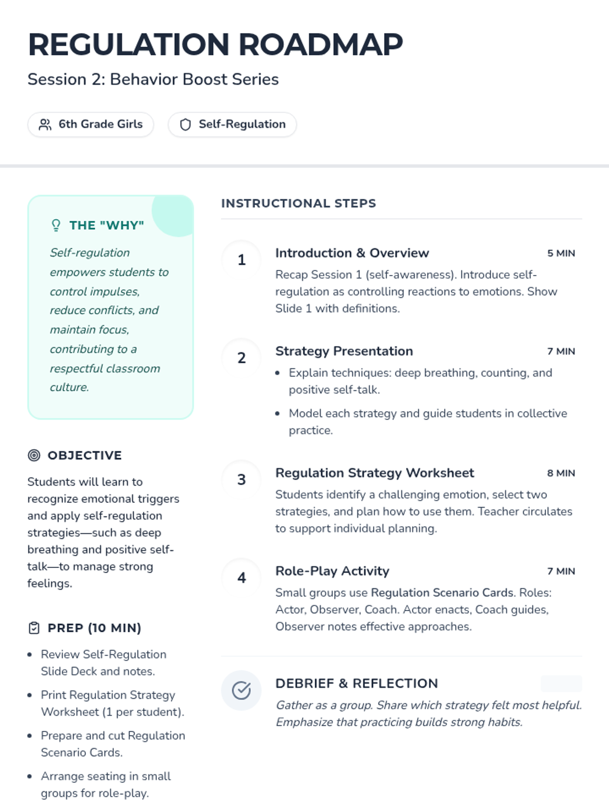 A 3-session group series for 6th-grade girls focused on building self-awareness, self-regulation, and peer support skills to foster a respectful classroom culture.