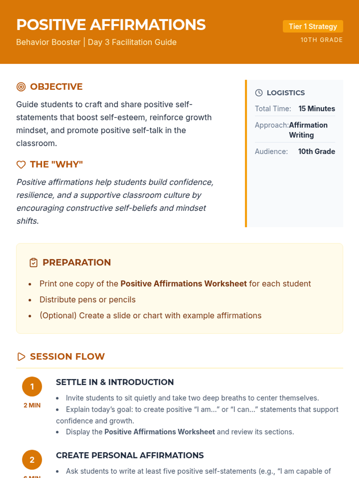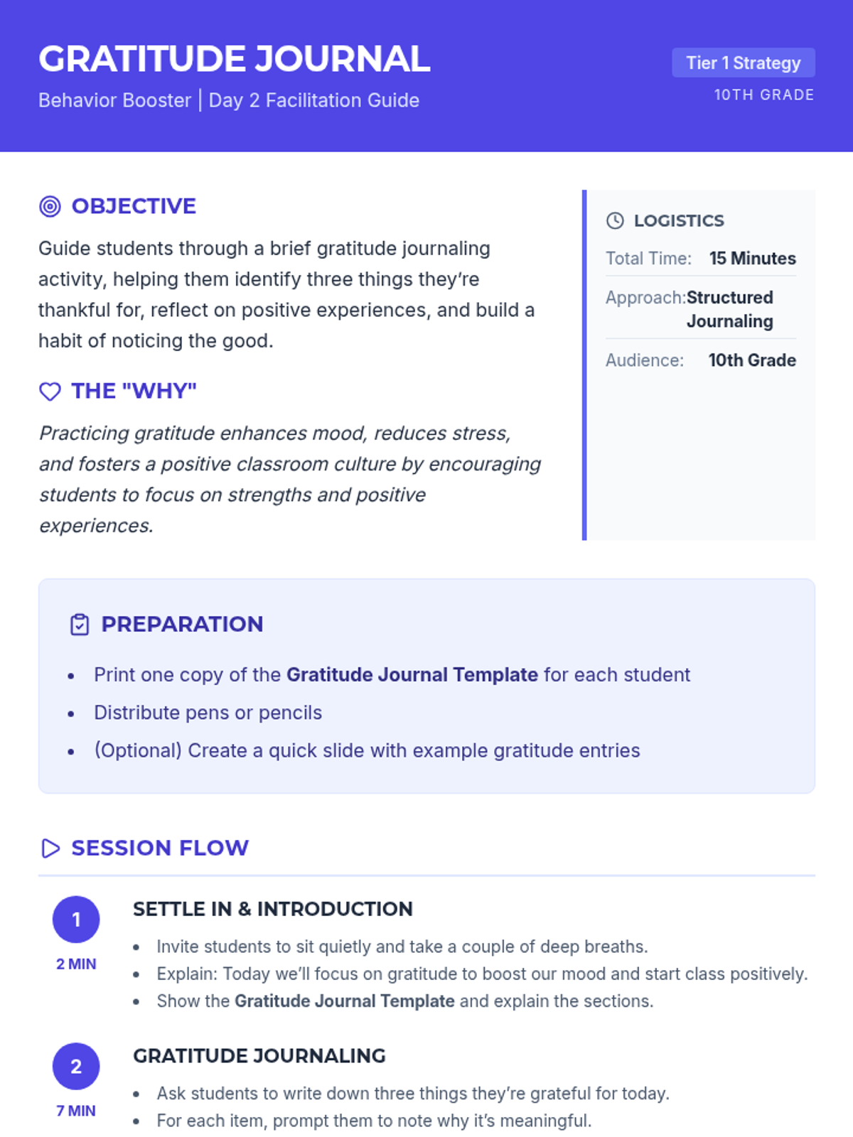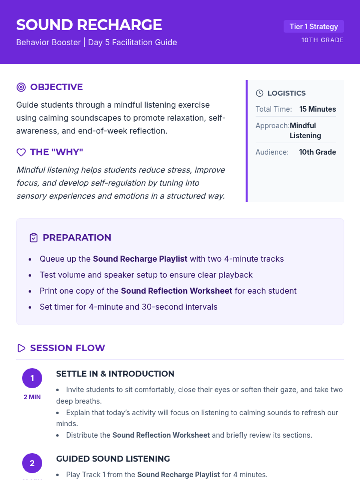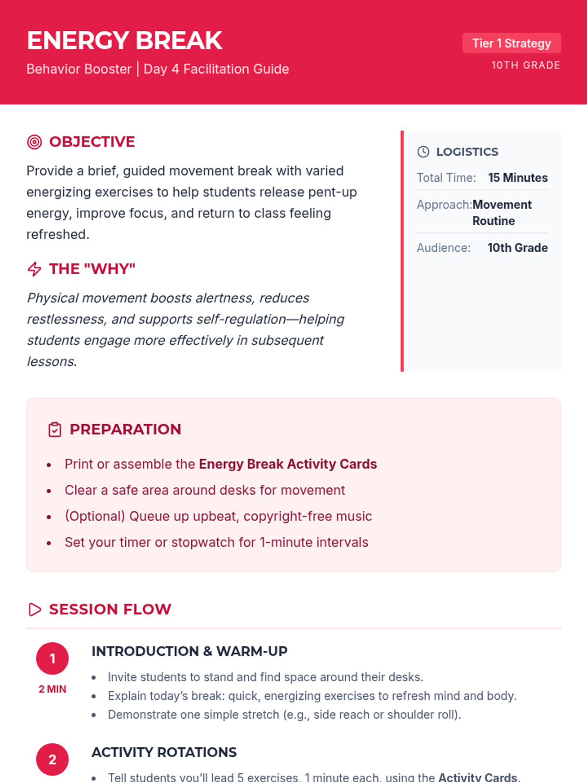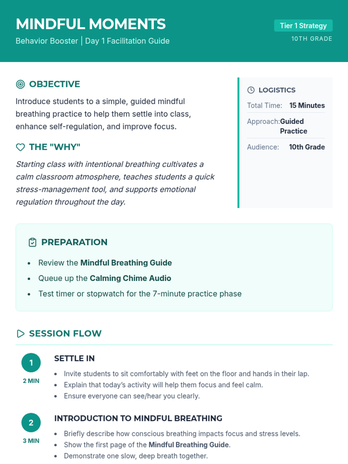 A week-long series of 15-minute daily activators designed for 10th-grade students to promote self-regulation, positive behavior, and social-emotional skills. these Tier 1 routines help students start class with focus and calm.