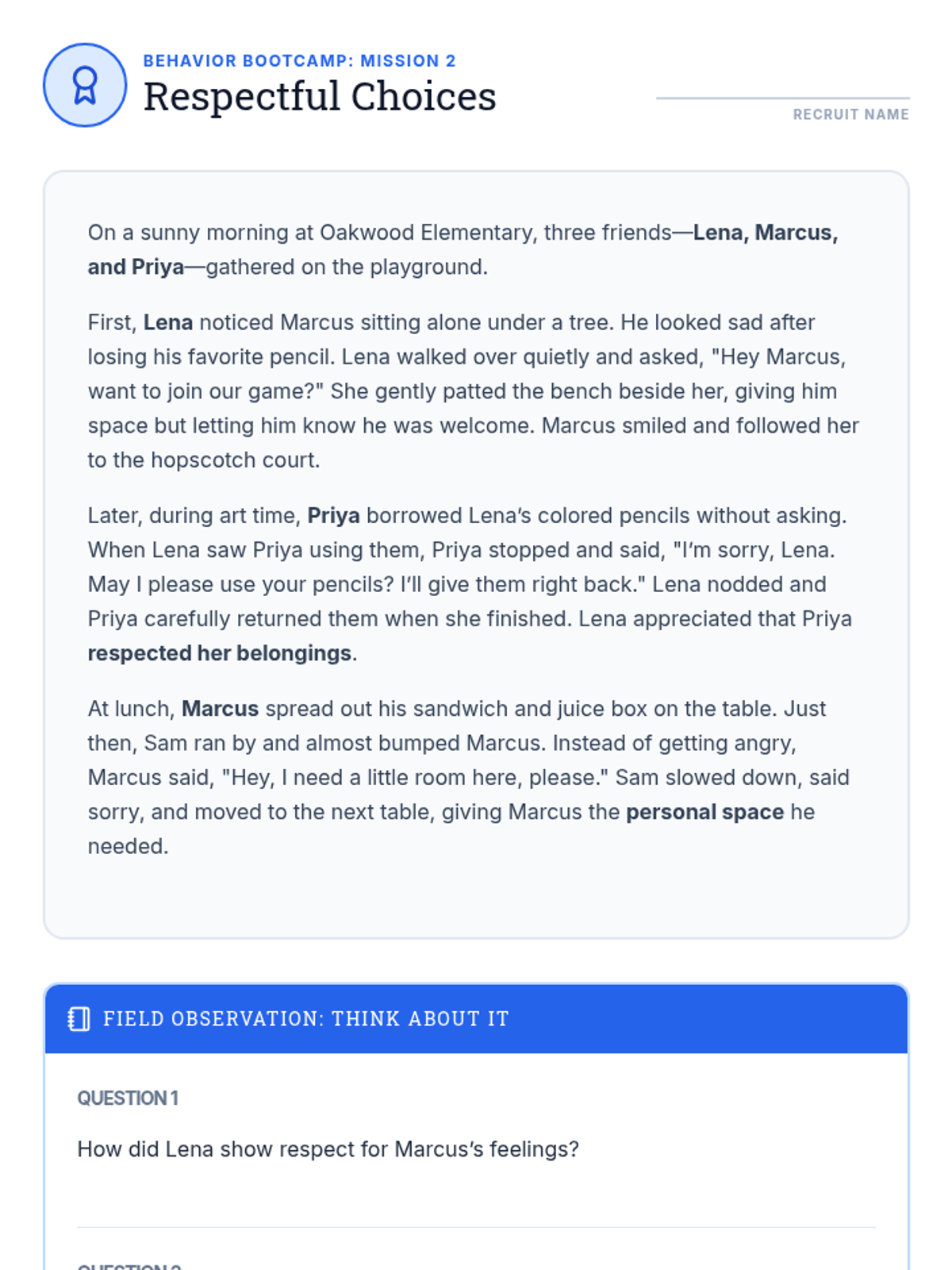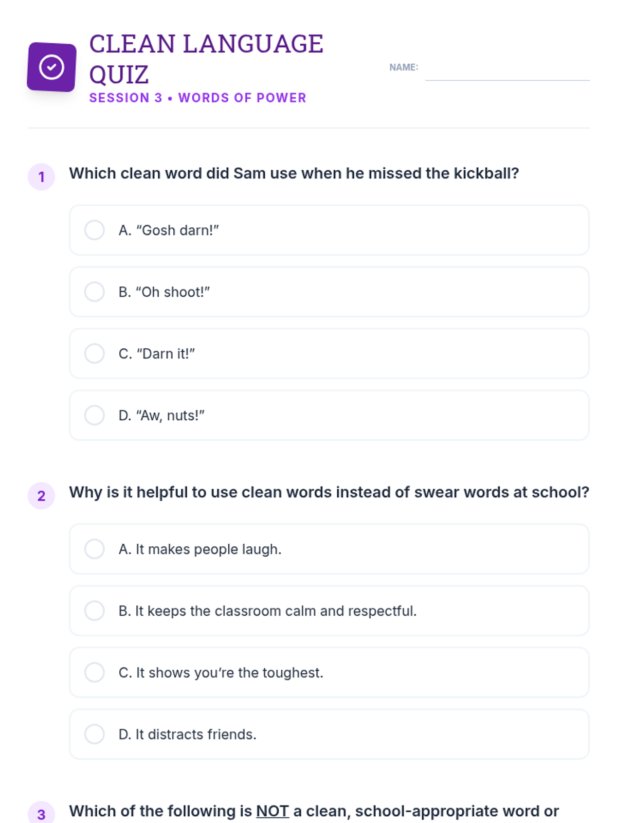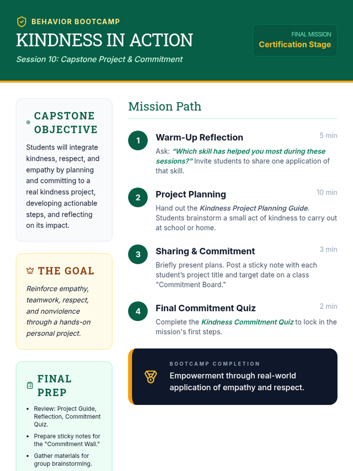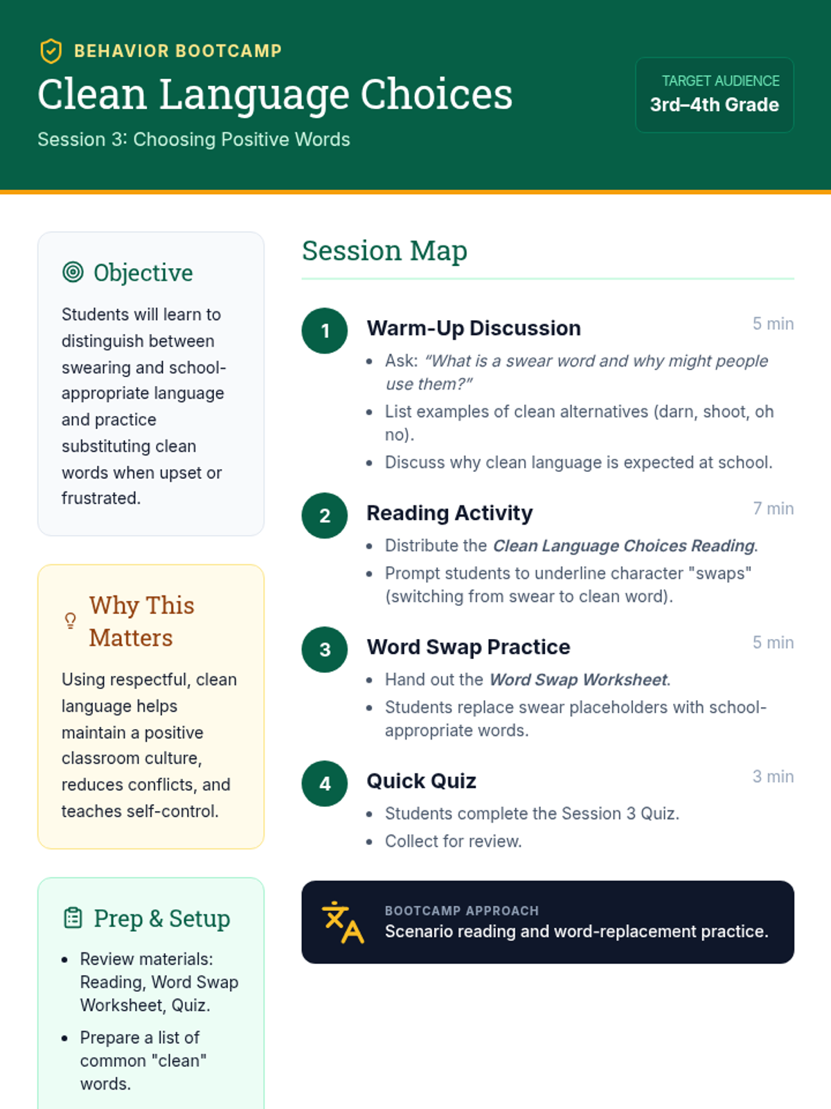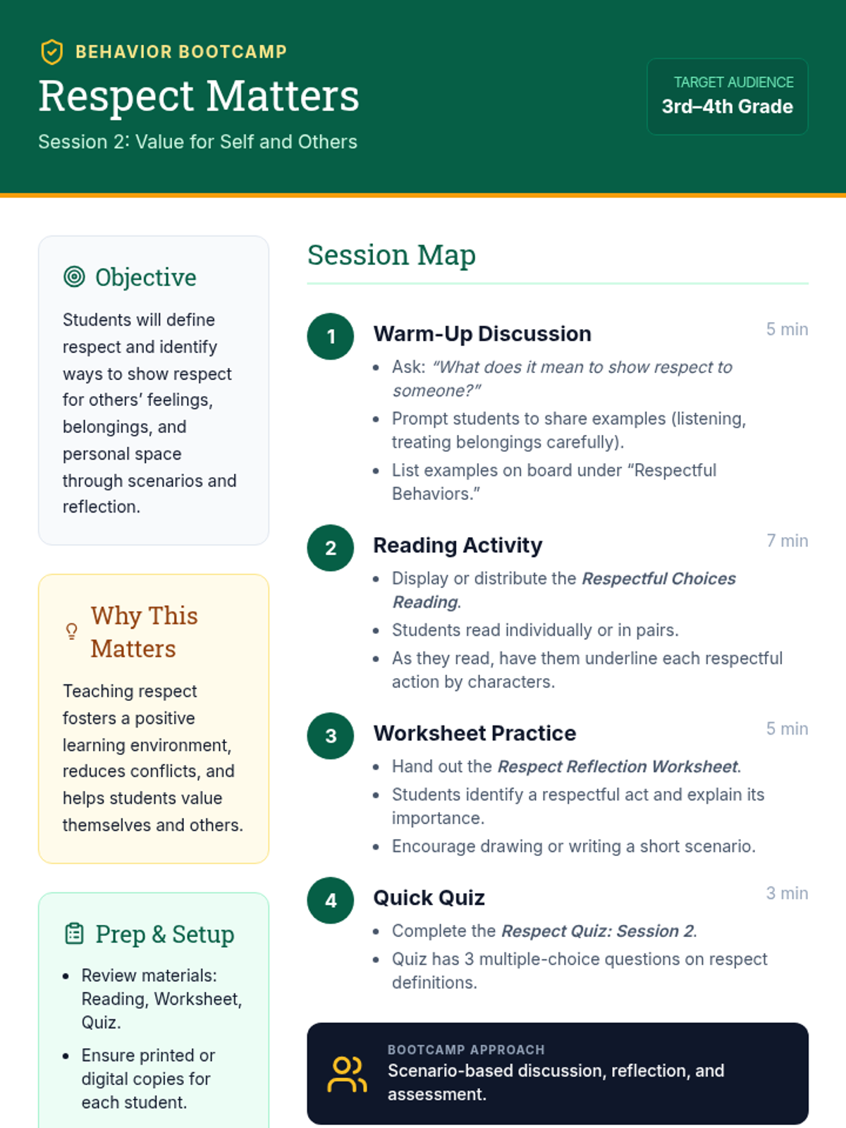 A 10-session individual self-paced intervention for 3rd–4th graders focusing on kindness, respect, appropriate language, and nonviolence to reduce swearing, aggression, and prejudice.
