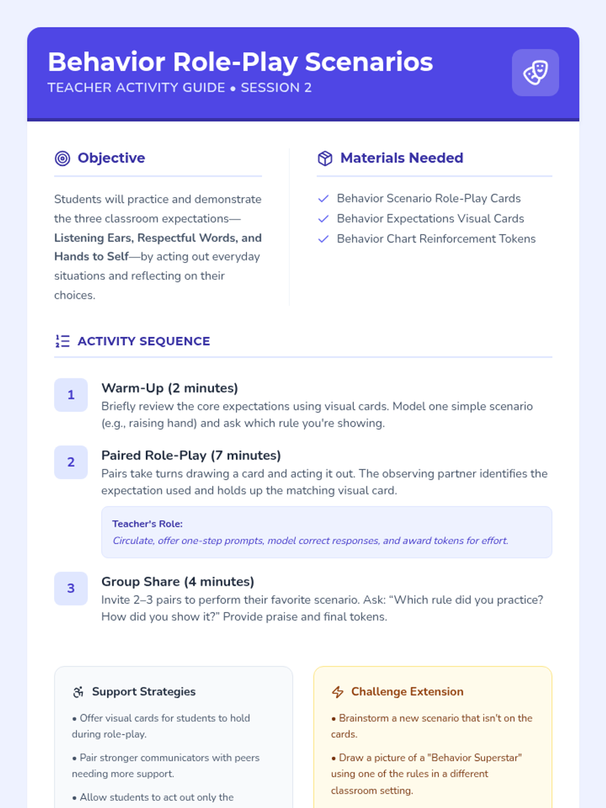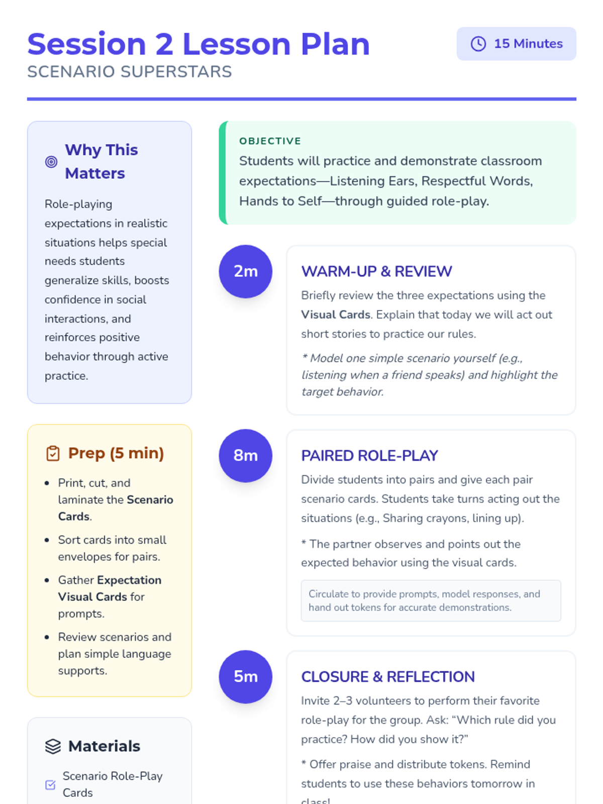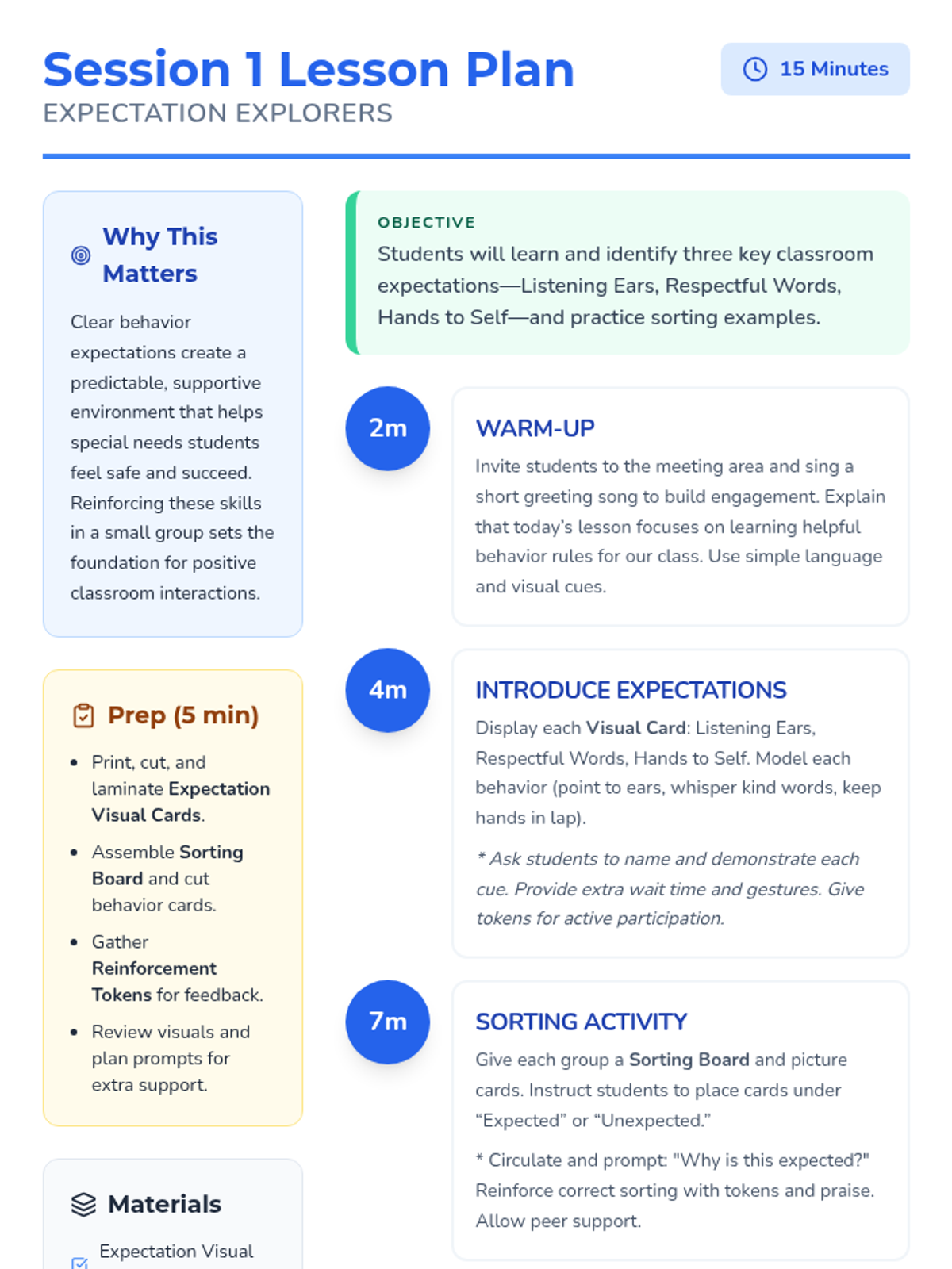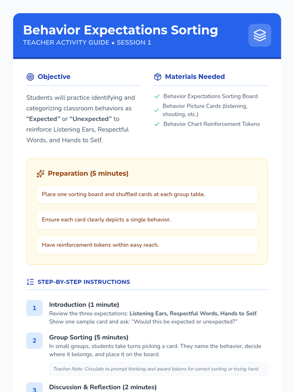 A two-session Tier 2 behavior intervention for special needs students, focusing on key classroom expectations like Listening Ears, Respectful Words, and Hands to Self through visual sorting and guided role-play.