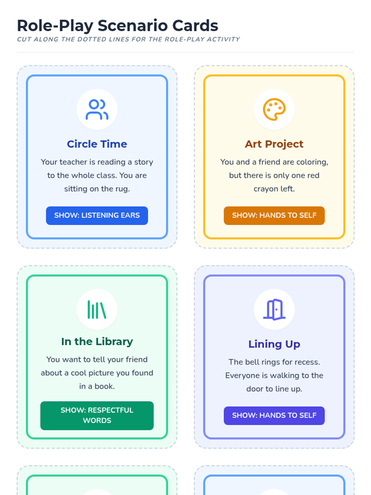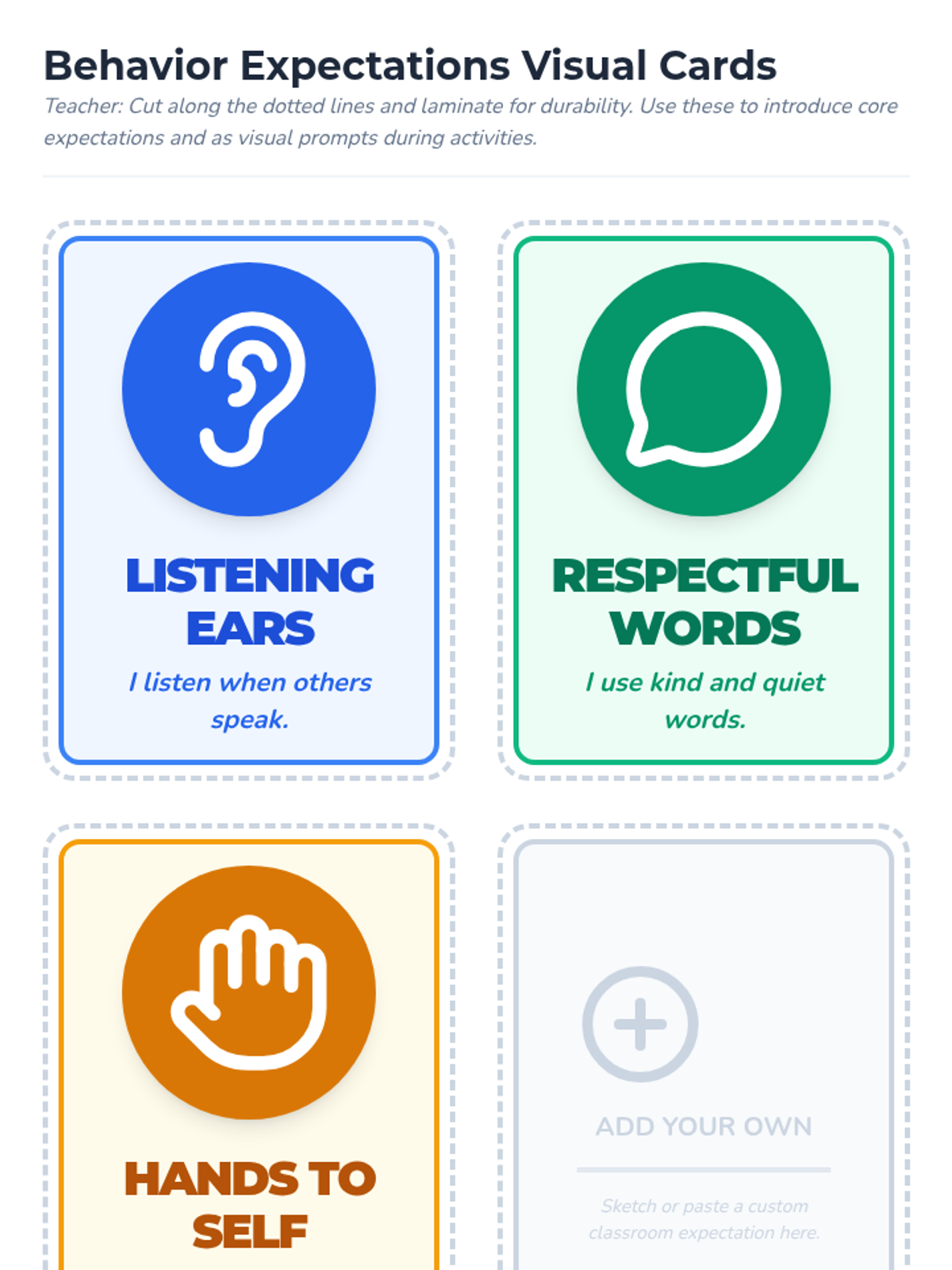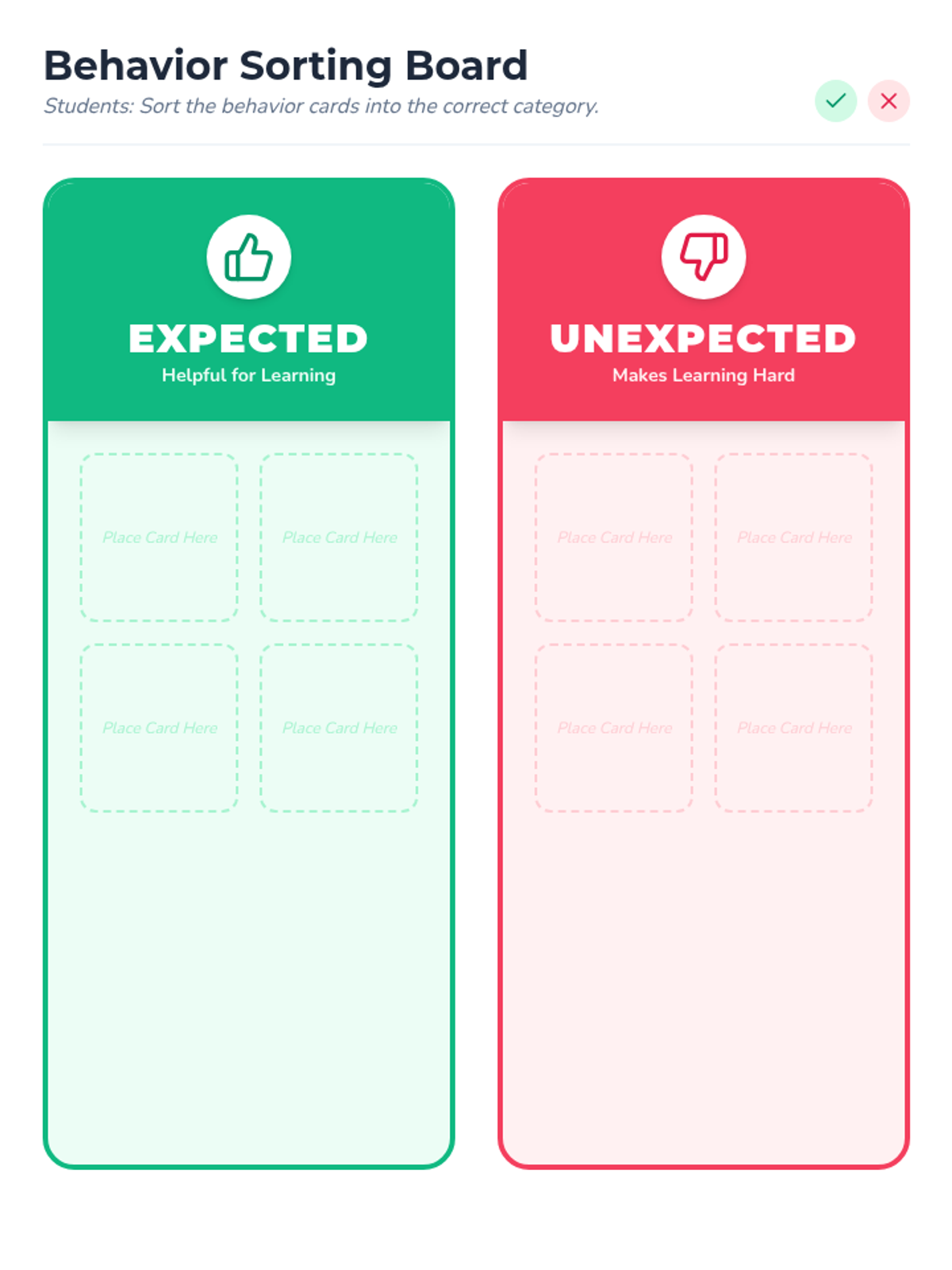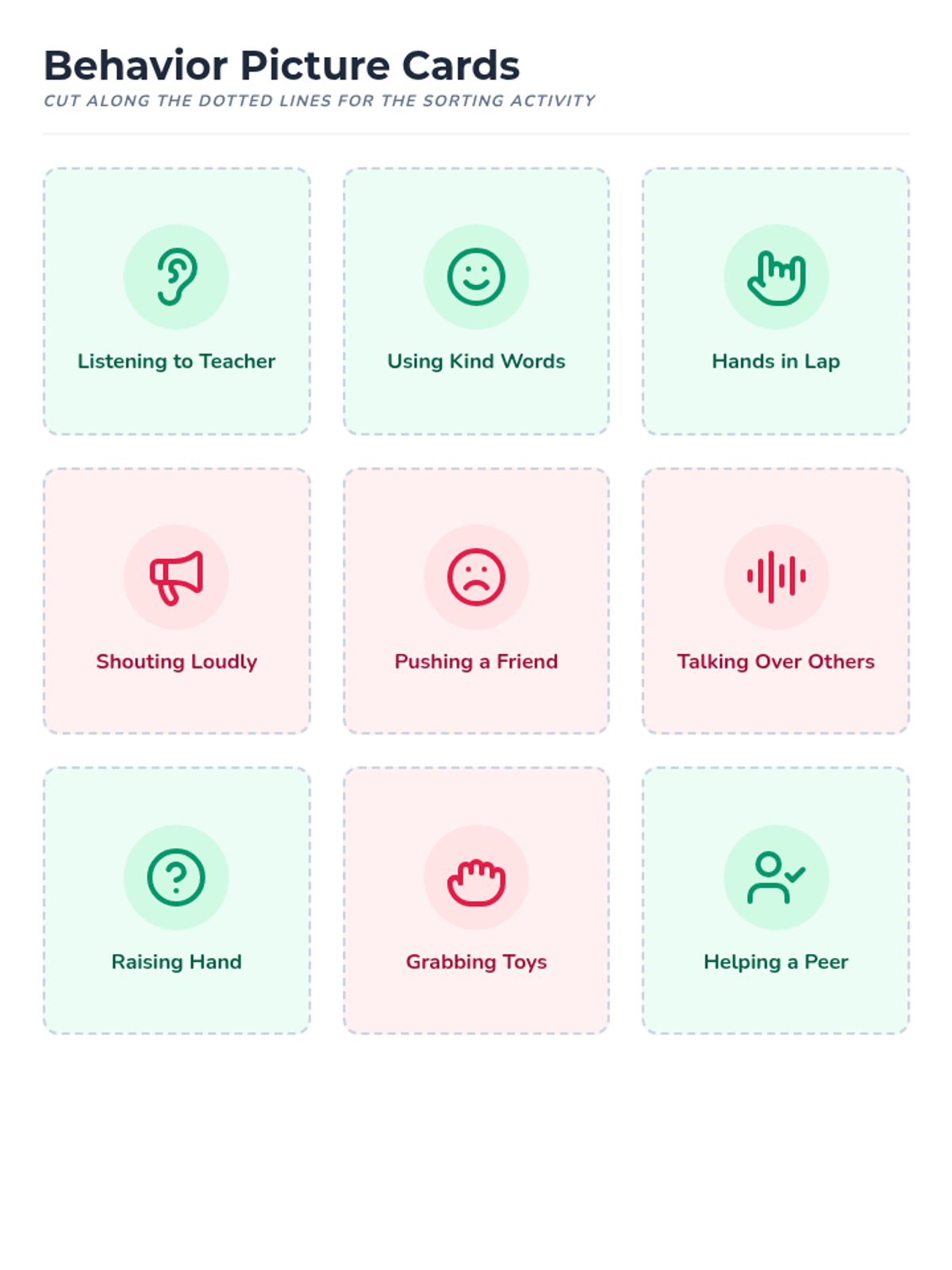 A two-session Tier 2 behavior intervention for special needs students, focusing on key classroom expectations like Listening Ears, Respectful Words, and Hands to Self through visual sorting and guided role-play.