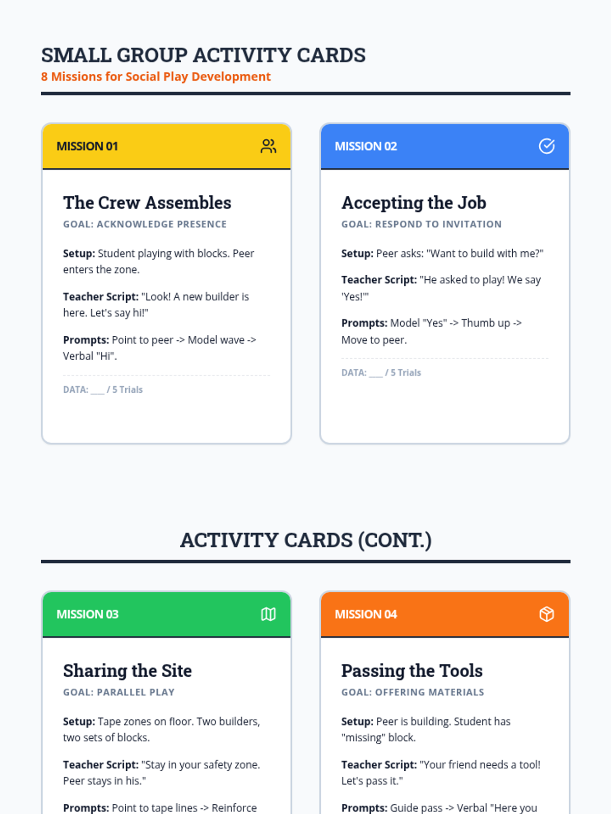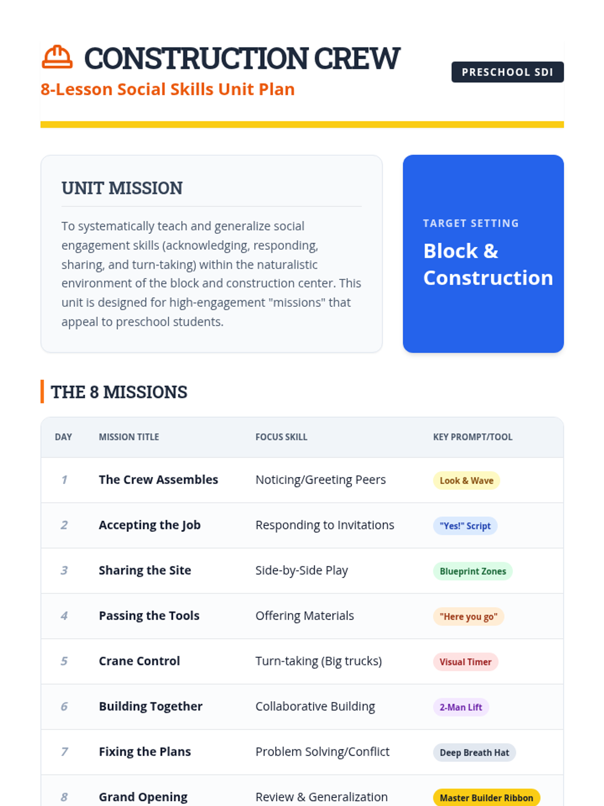 A 8-lesson SDI unit for preschool boys focused on social play skills in the block area, utilizing a construction theme to teach initiation, sharing, and turn-taking.