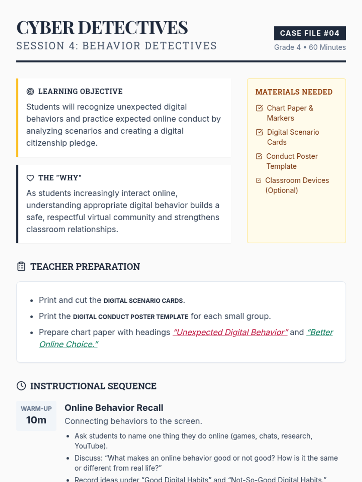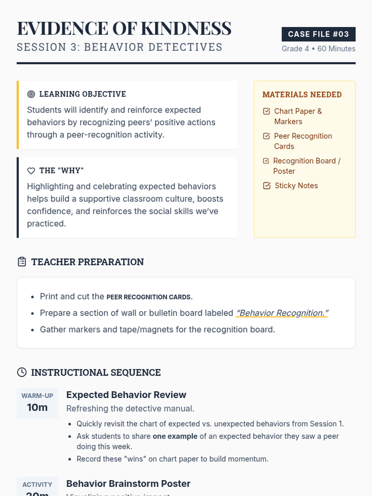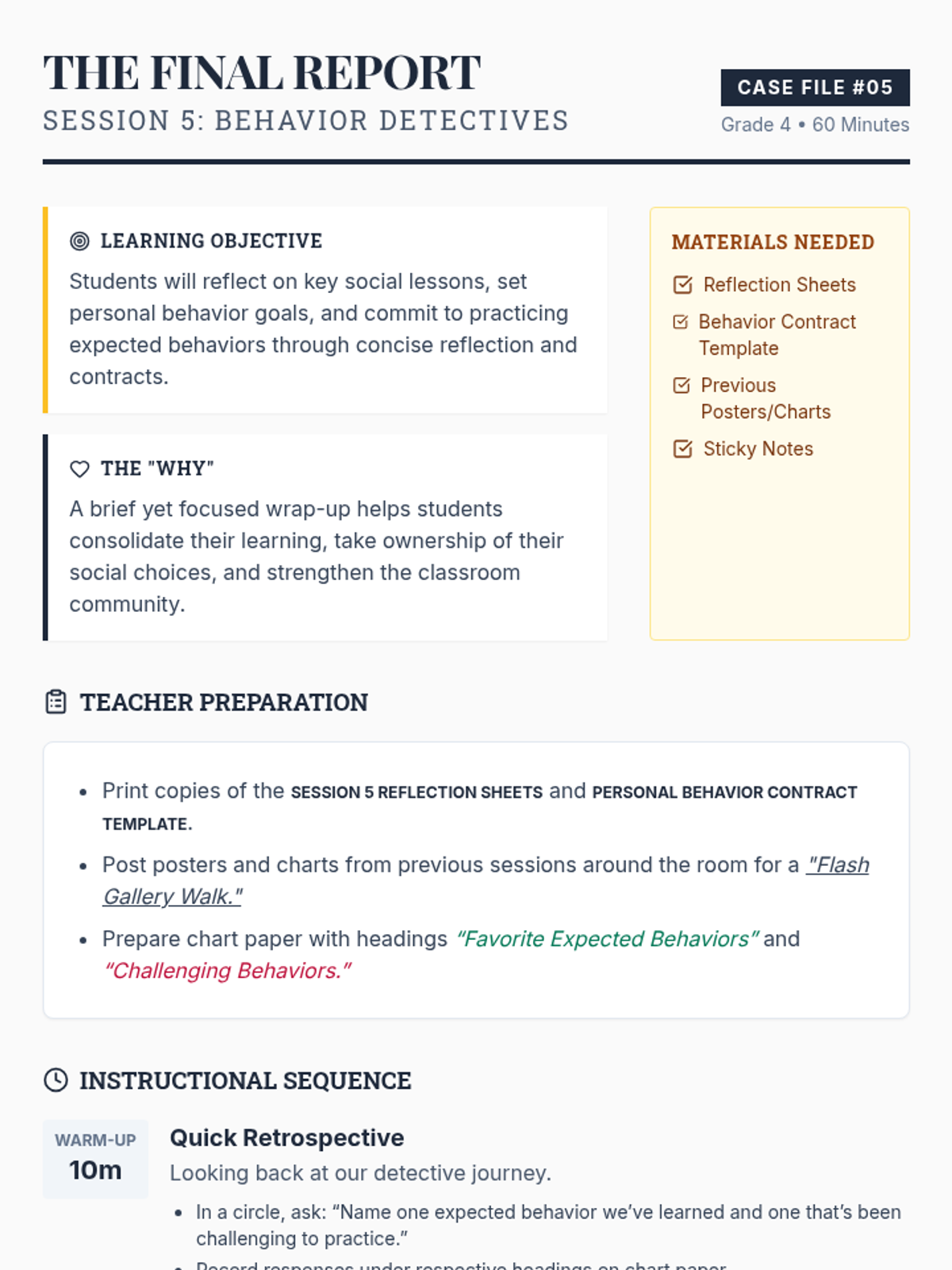 A 5-session Grade 4 classroom sequence where students become 'Behavior Detectives' to explore expected and unexpected behaviors through interactive activities, role-play, and reflection. This Tier 1 series builds social awareness and a positive classroom culture.