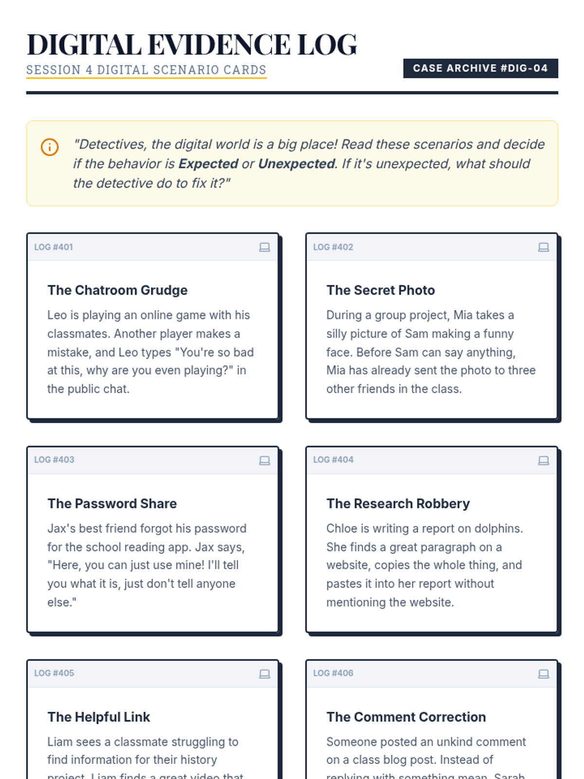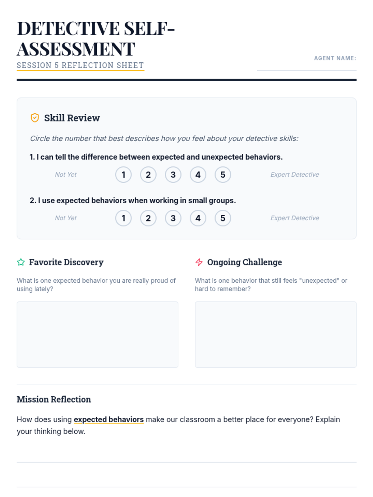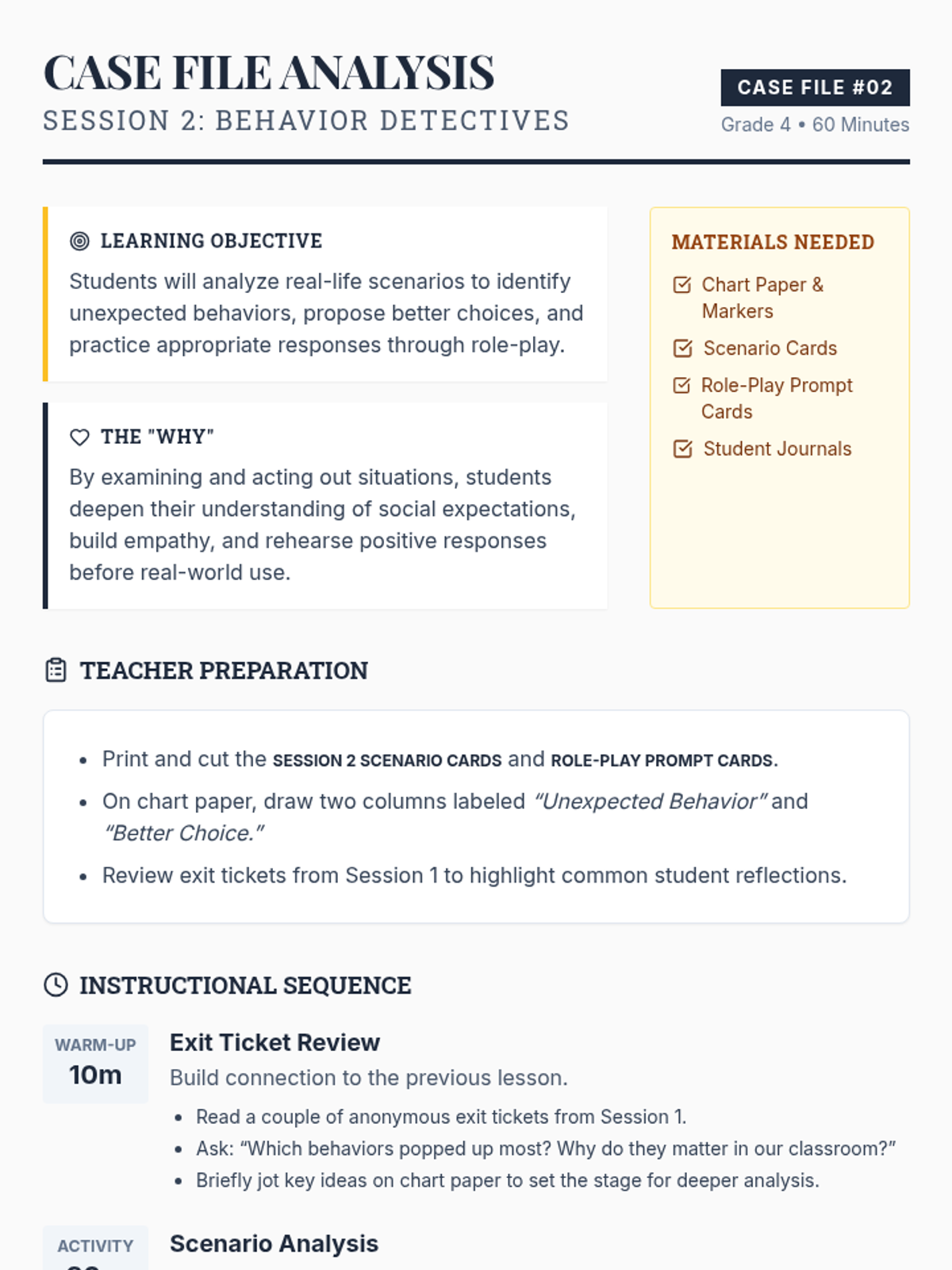 A 5-session Grade 4 classroom sequence where students become 'Behavior Detectives' to explore expected and unexpected behaviors through interactive activities, role-play, and reflection. This Tier 1 series builds social awareness and a positive classroom culture.