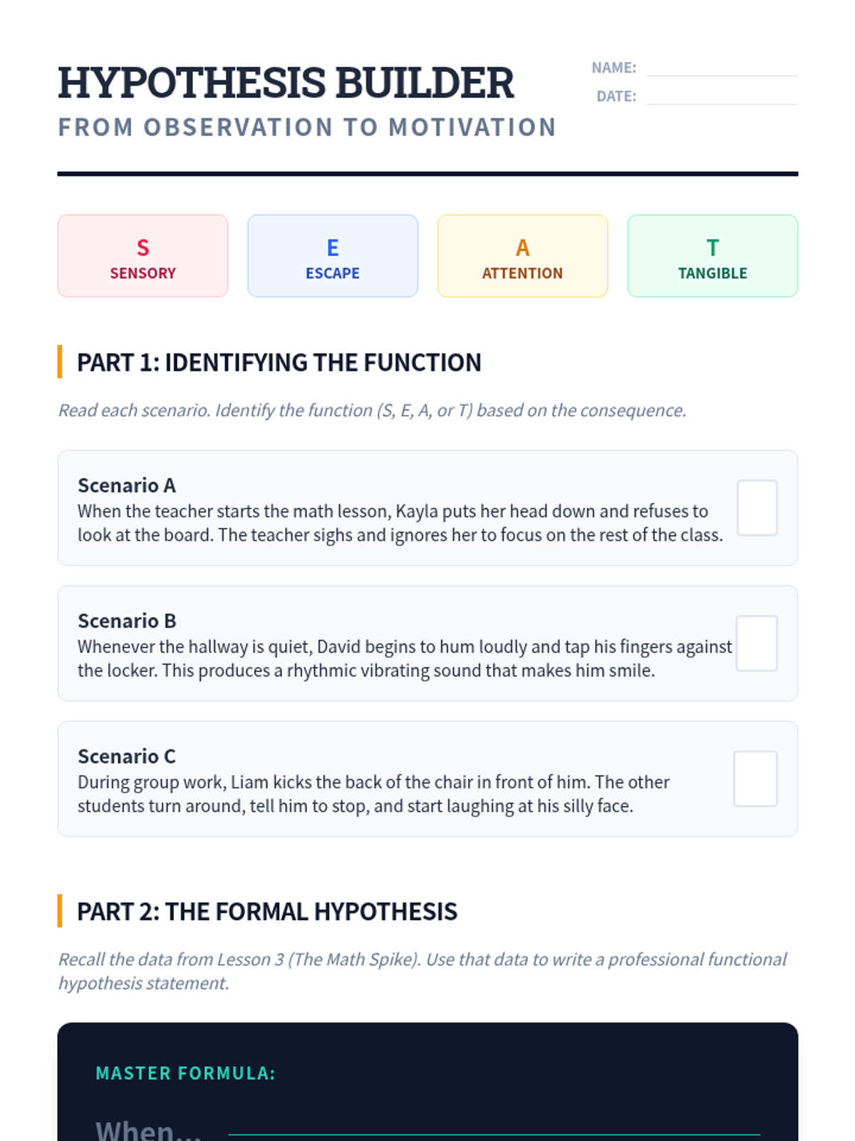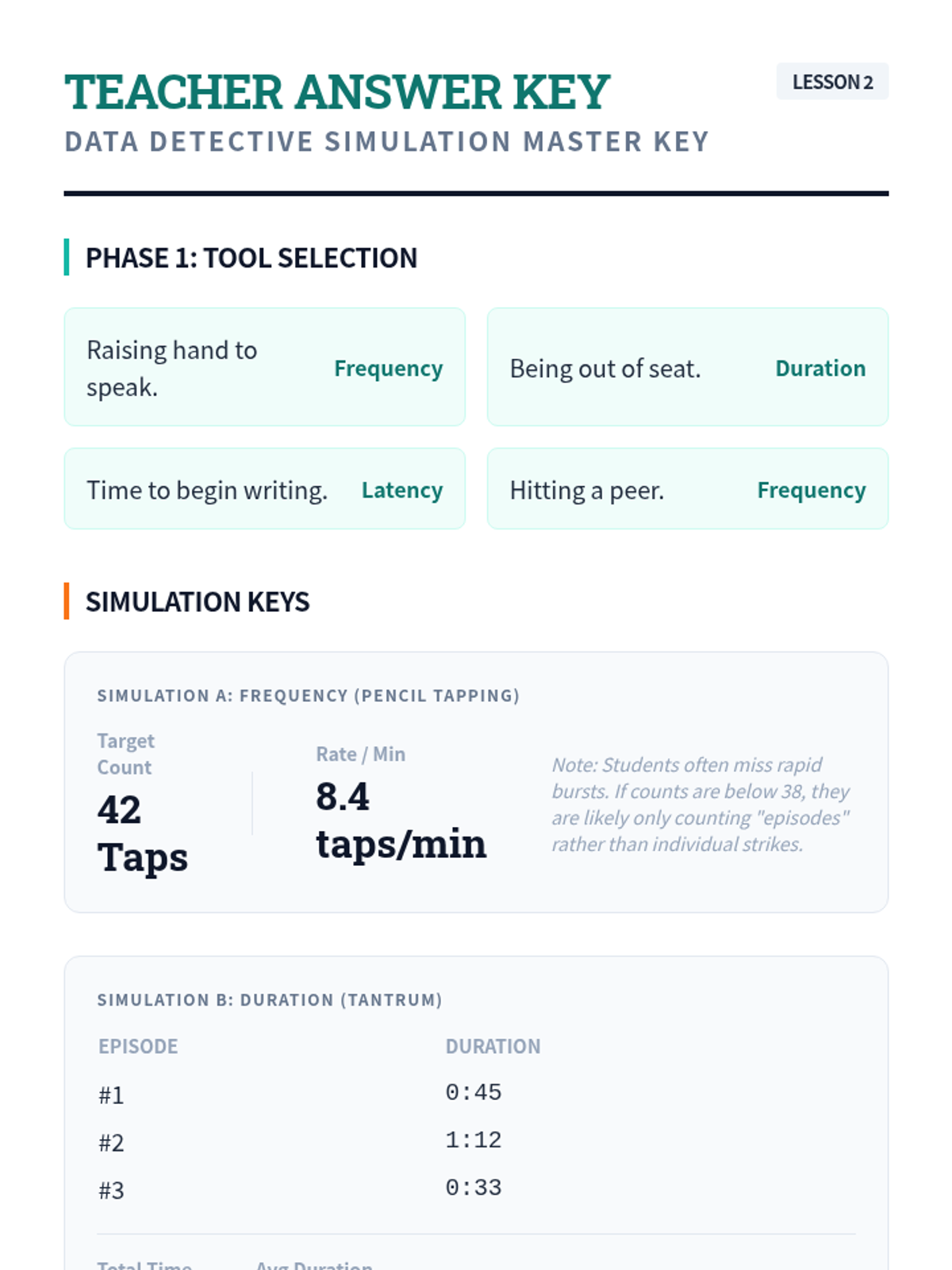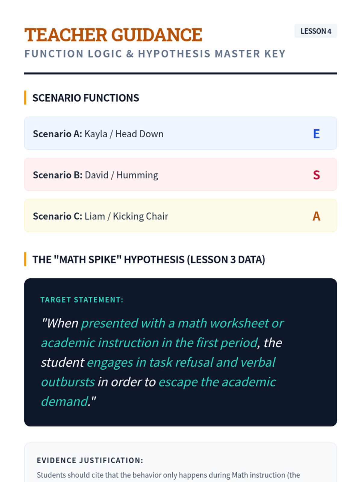 A comprehensive 11th-grade sequence on Functional Behavior Assessment (FBA). Students master the ABC model, quantitative data collection, pattern recognition, and function-matched intervention design to support behavioral growth.