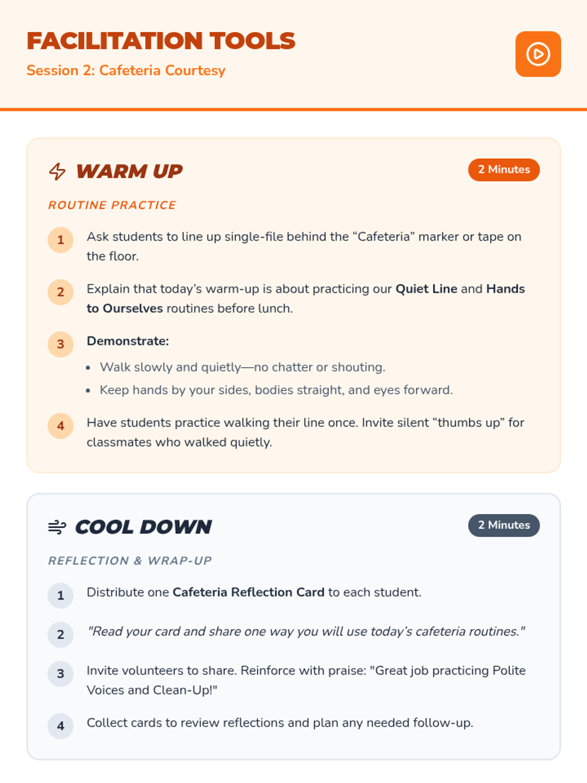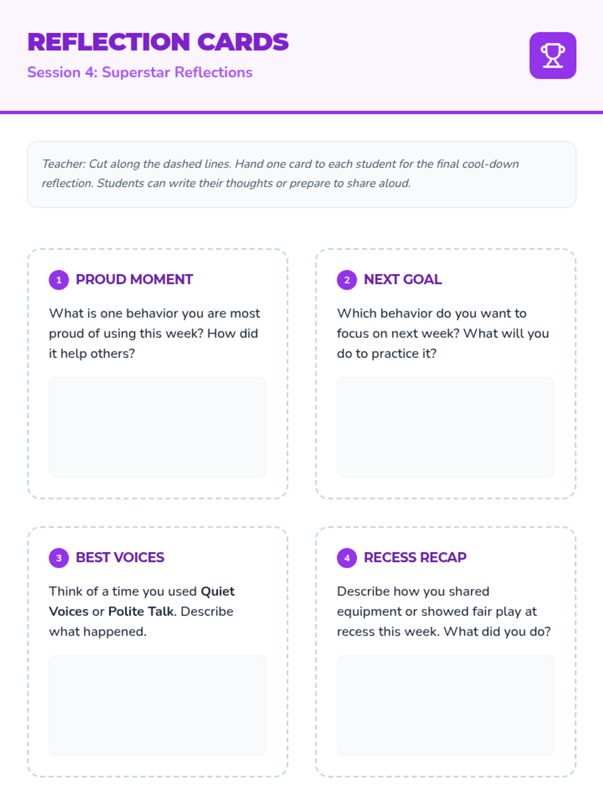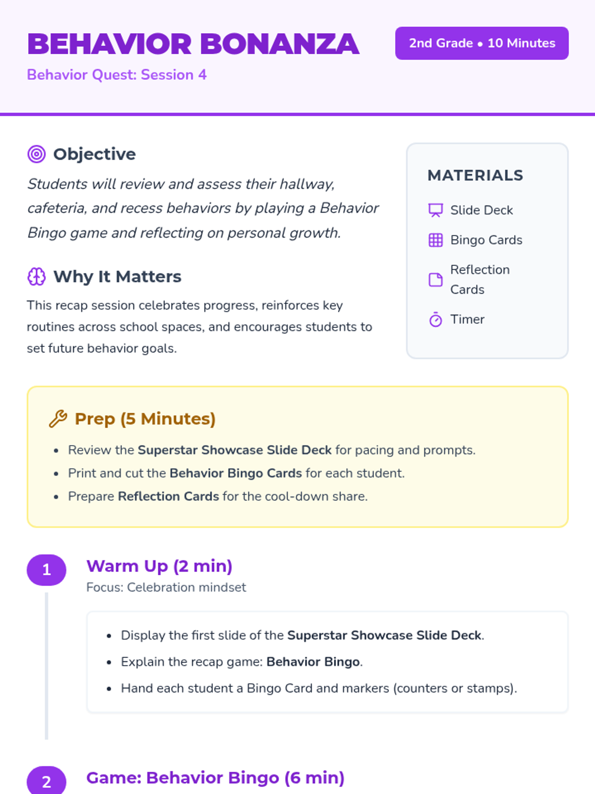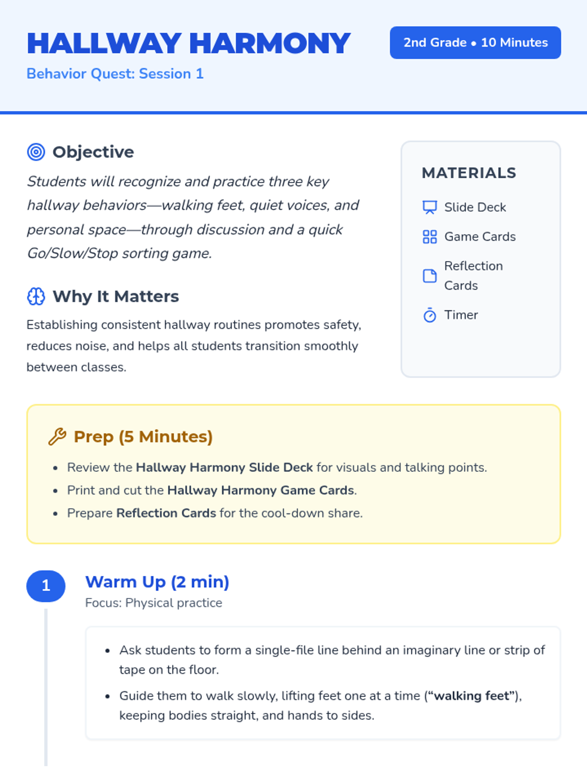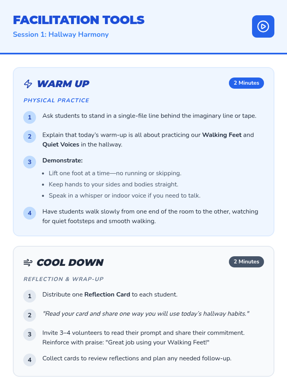 A 4-session classroom series for 2nd graders to learn positive hallway, cafeteria, and recess behaviors through interactive games and reflections.