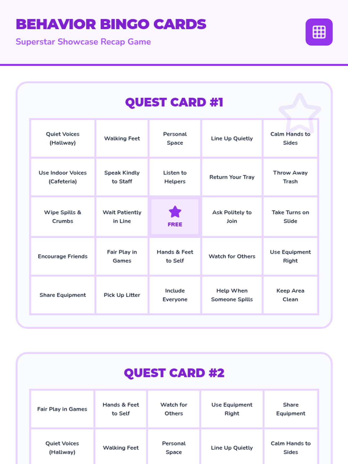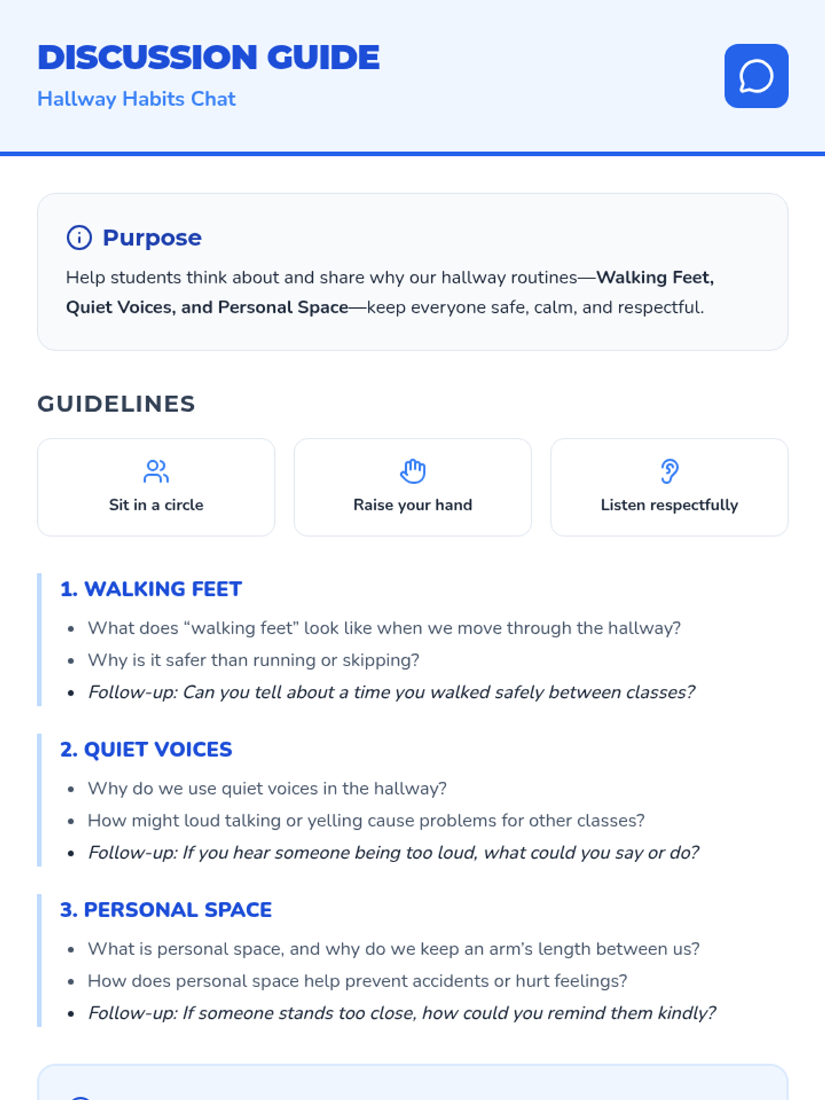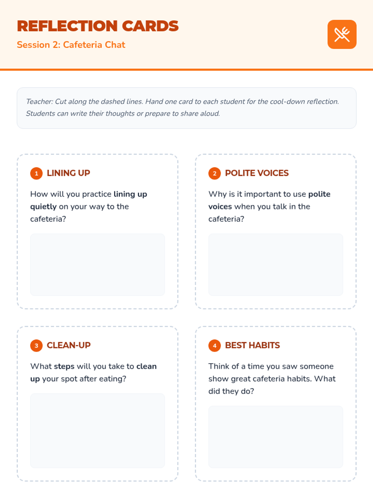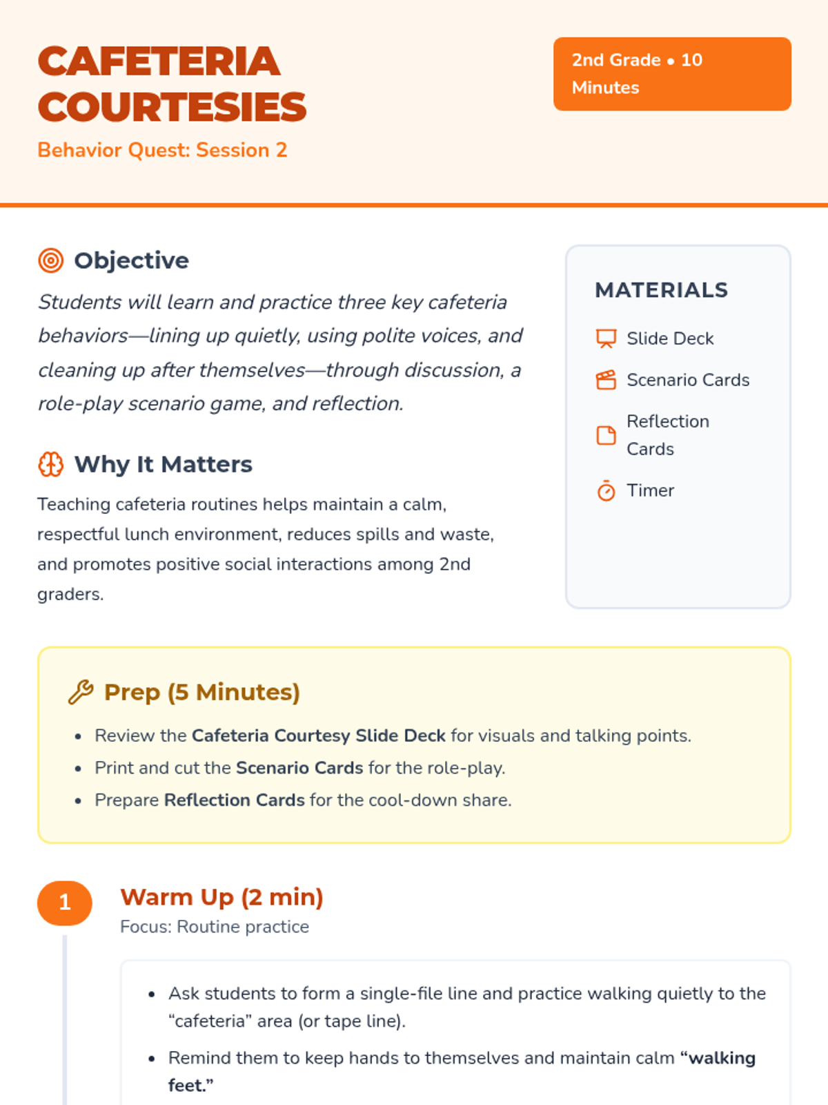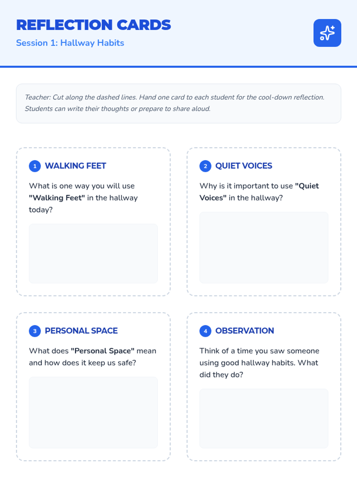A 4-session classroom series for 2nd graders to learn positive hallway, cafeteria, and recess behaviors through interactive games and reflections.