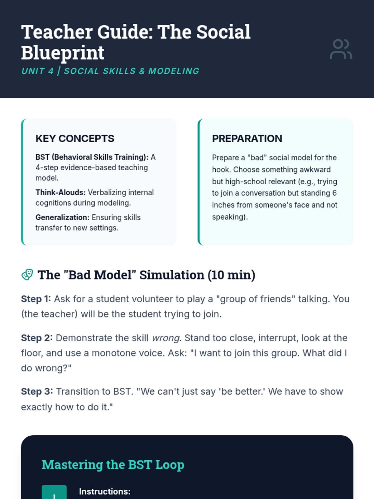 A comprehensive sequence for 11th-grade students on behavioral support, focusing on the 'Fair Pair' rule. Students learn to identify, design, and implement functionally equivalent replacement behaviors (FERBs) to empower individuals to meet their needs pro-socially.