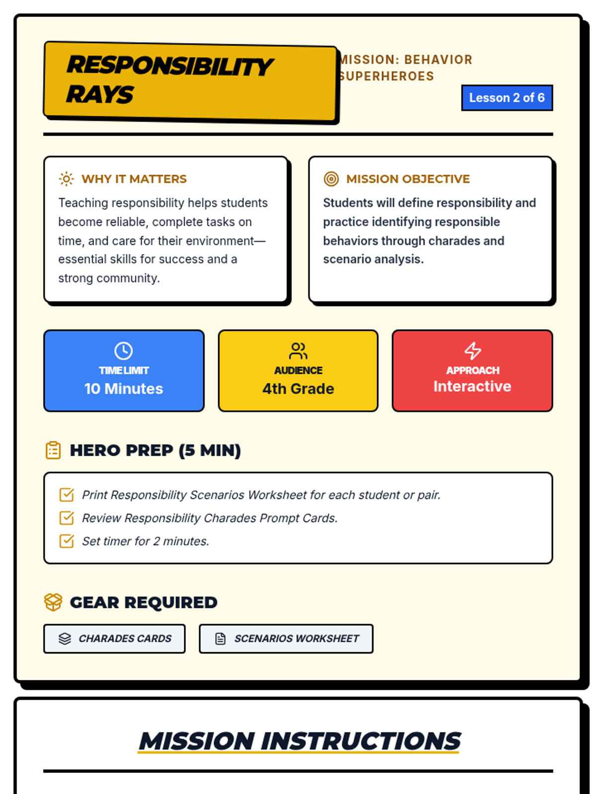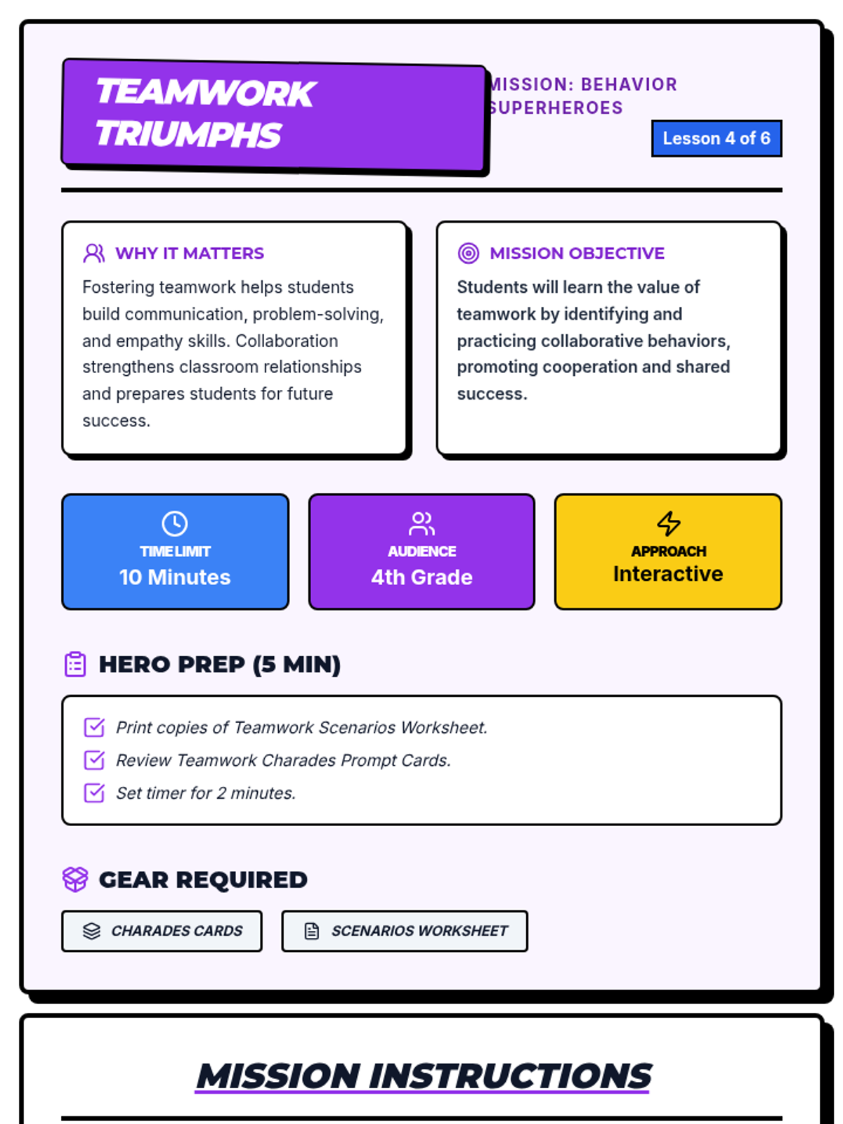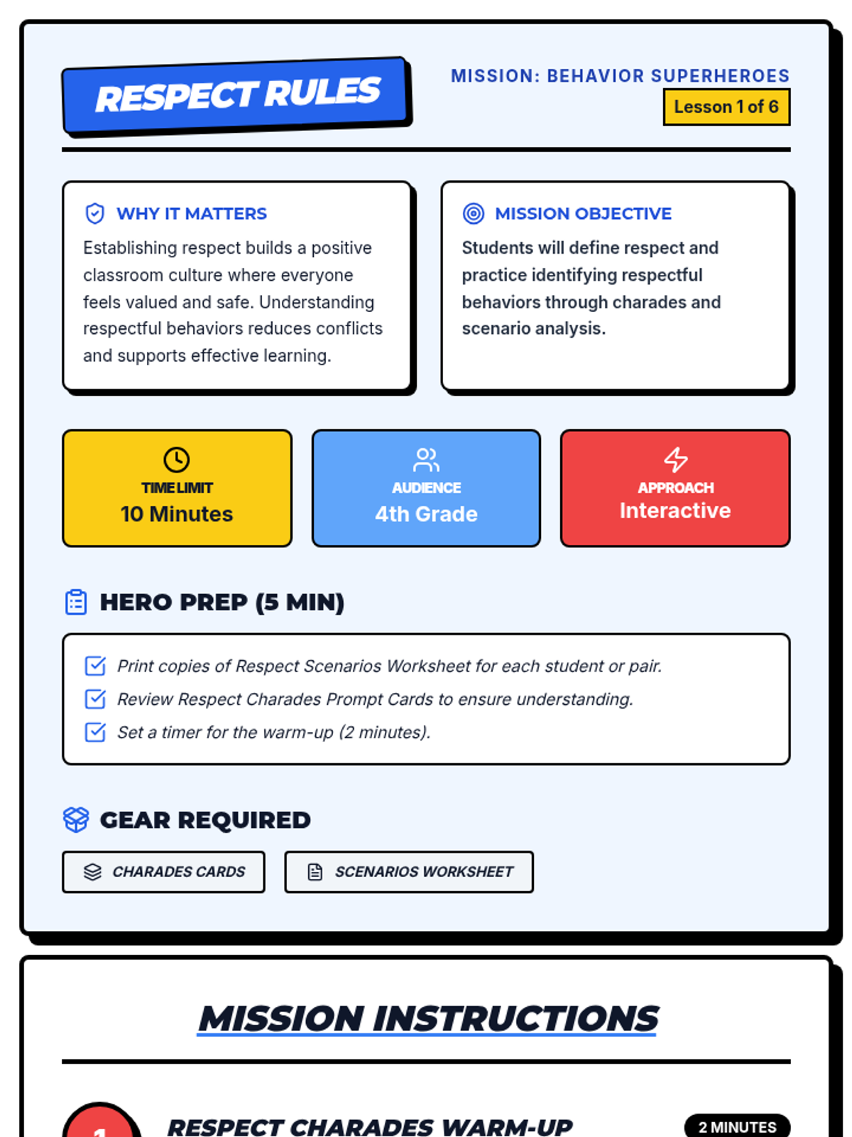 A 6-session mini-series for 4th graders teaching key behavior expectations through interactive lessons, scenarios, and superhero-themed activities.