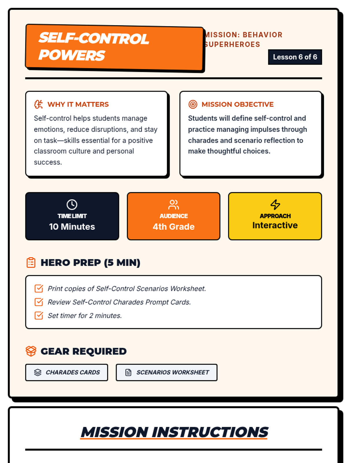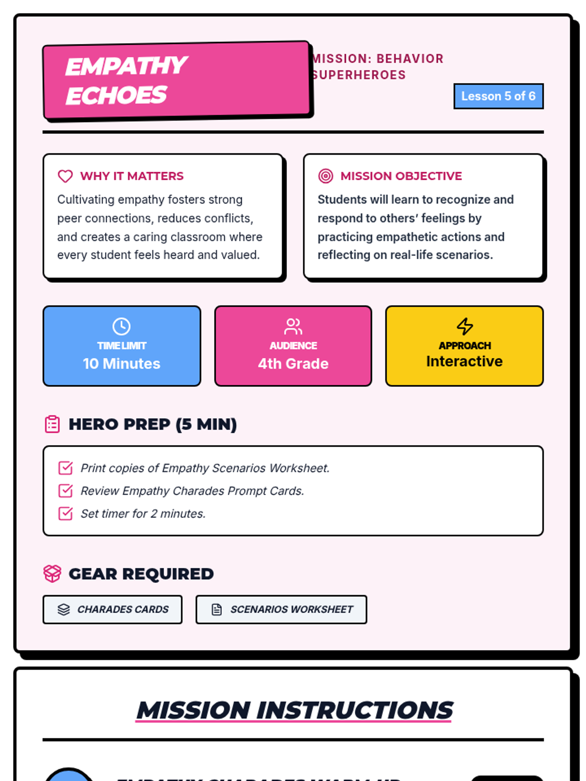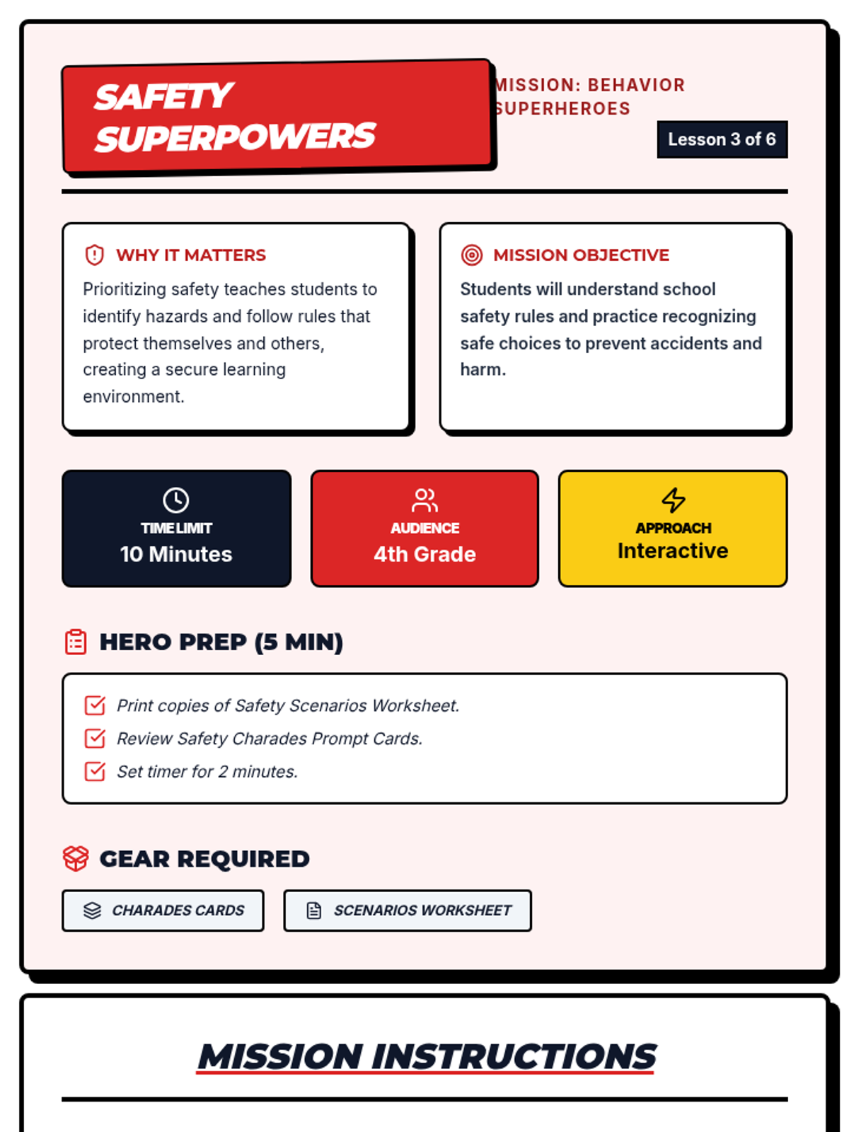 A 6-session mini-series for 4th graders teaching key behavior expectations through interactive lessons, scenarios, and superhero-themed activities.