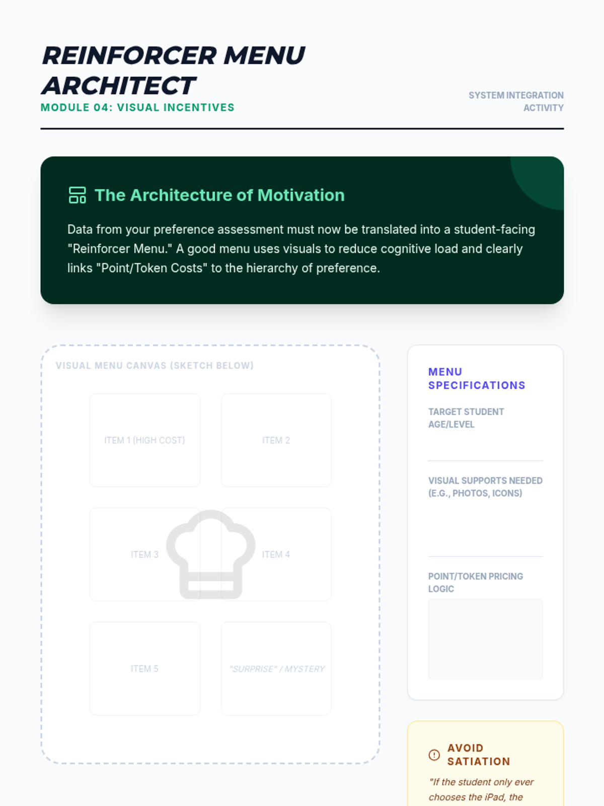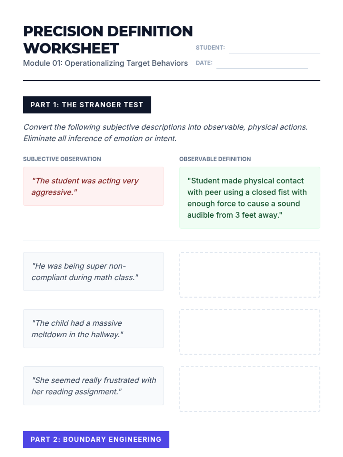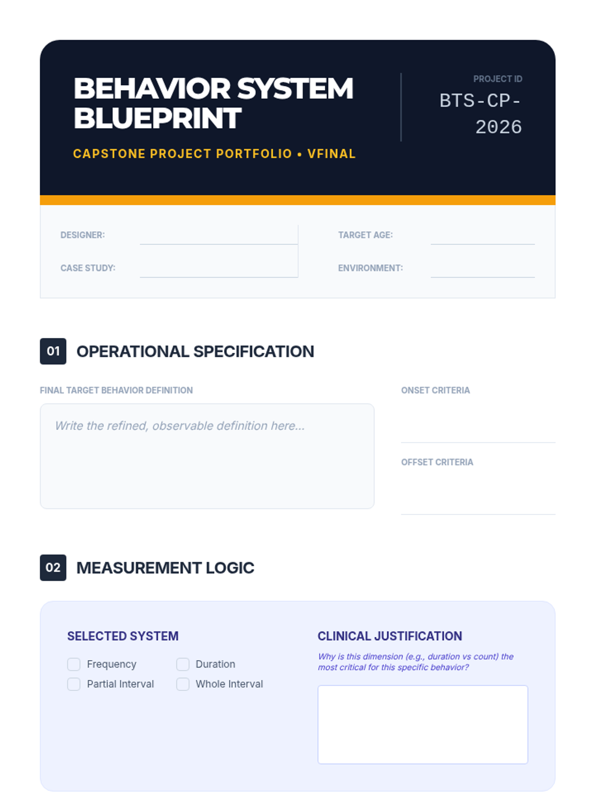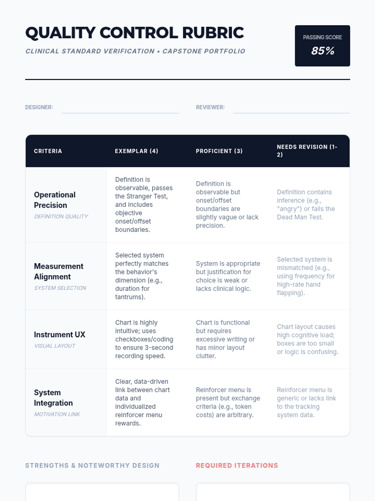 This undergraduate sequence teaches students to design evidence-based behavior tracking systems. It covers operational definitions, measurement selection, visual design principles for clinical charts, and the integration of preference assessments to create functional, user-friendly tools.