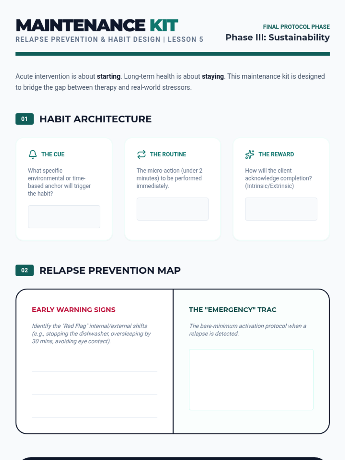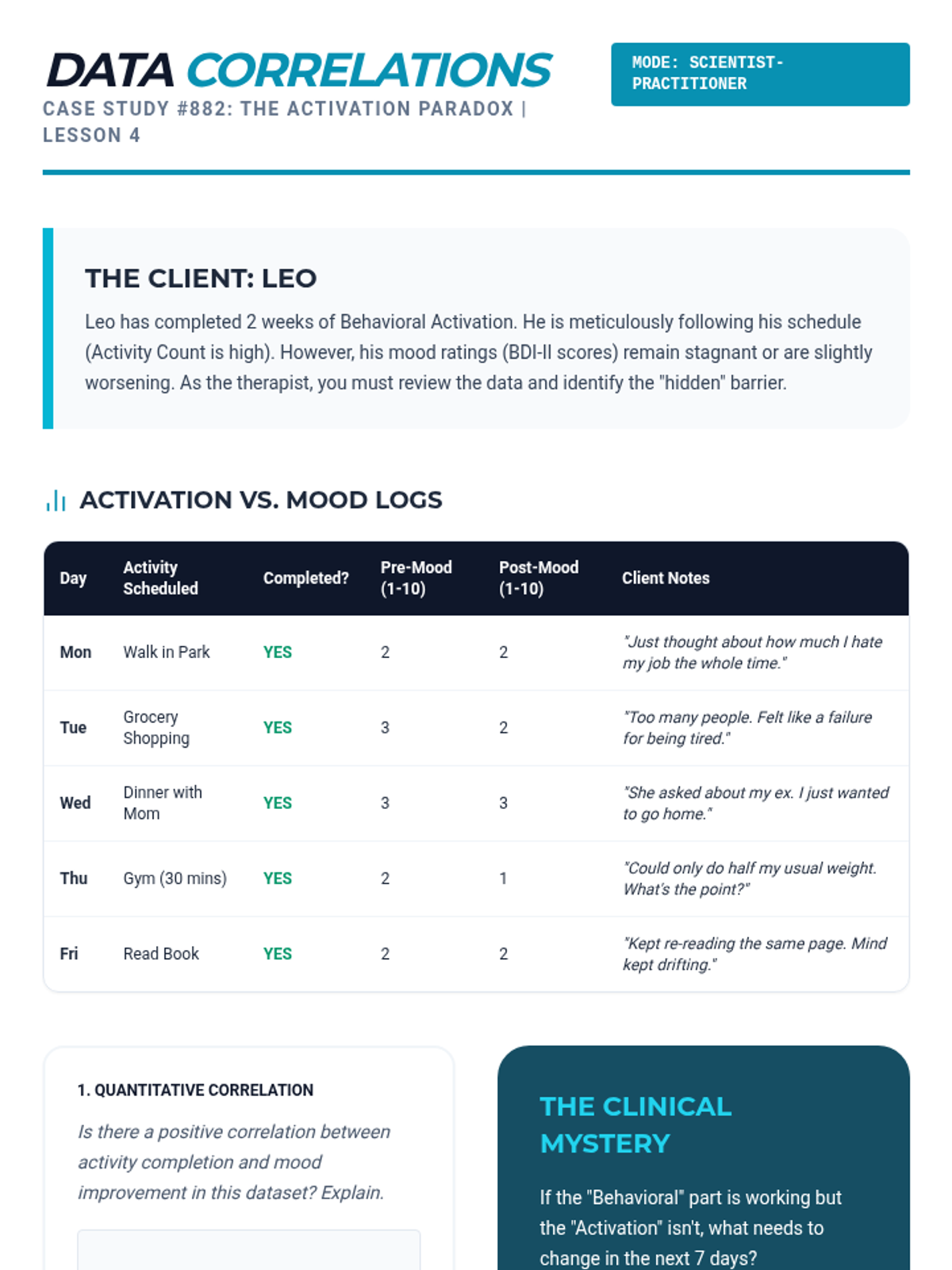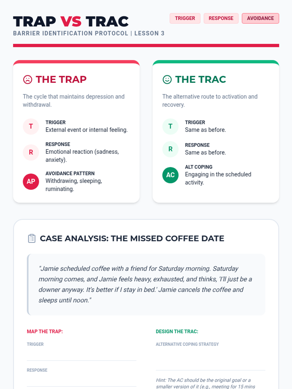 This sequence guides undergraduate students through the practical application of Behavioral Activation (BA) protocols. Moving from theoretical understanding to clinical implementation, students learn to design interventions, troubleshoot psychological barriers using the TRAP/TRAC model, and analyze data to refine therapeutic outcomes.