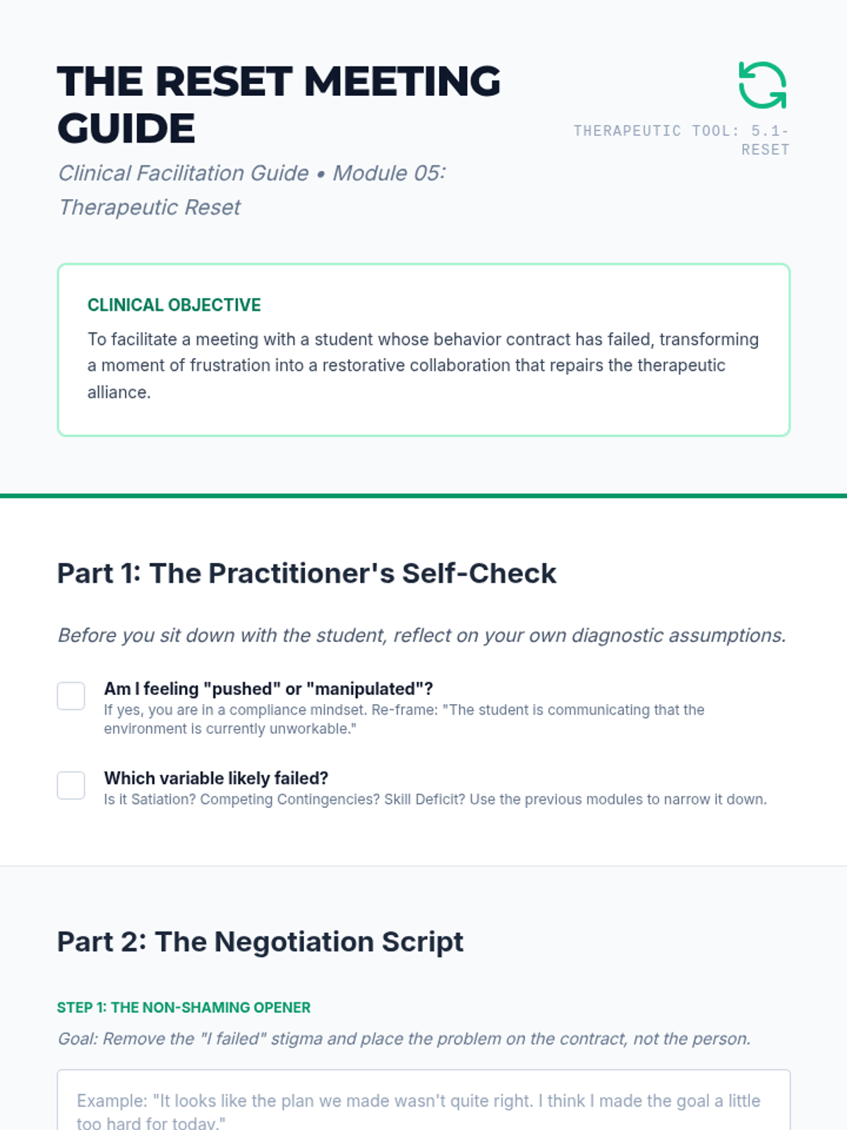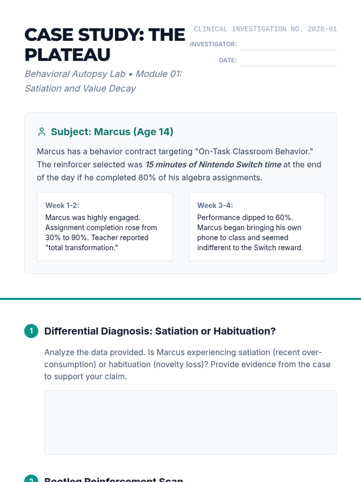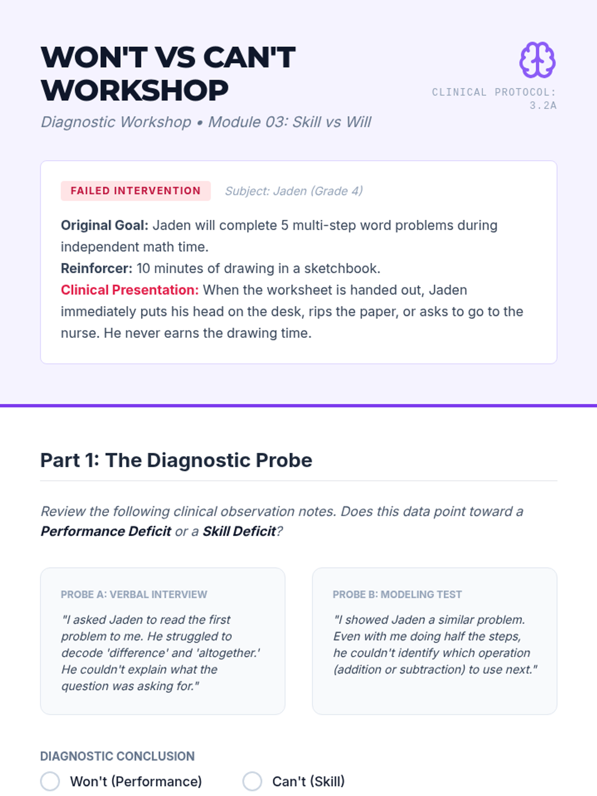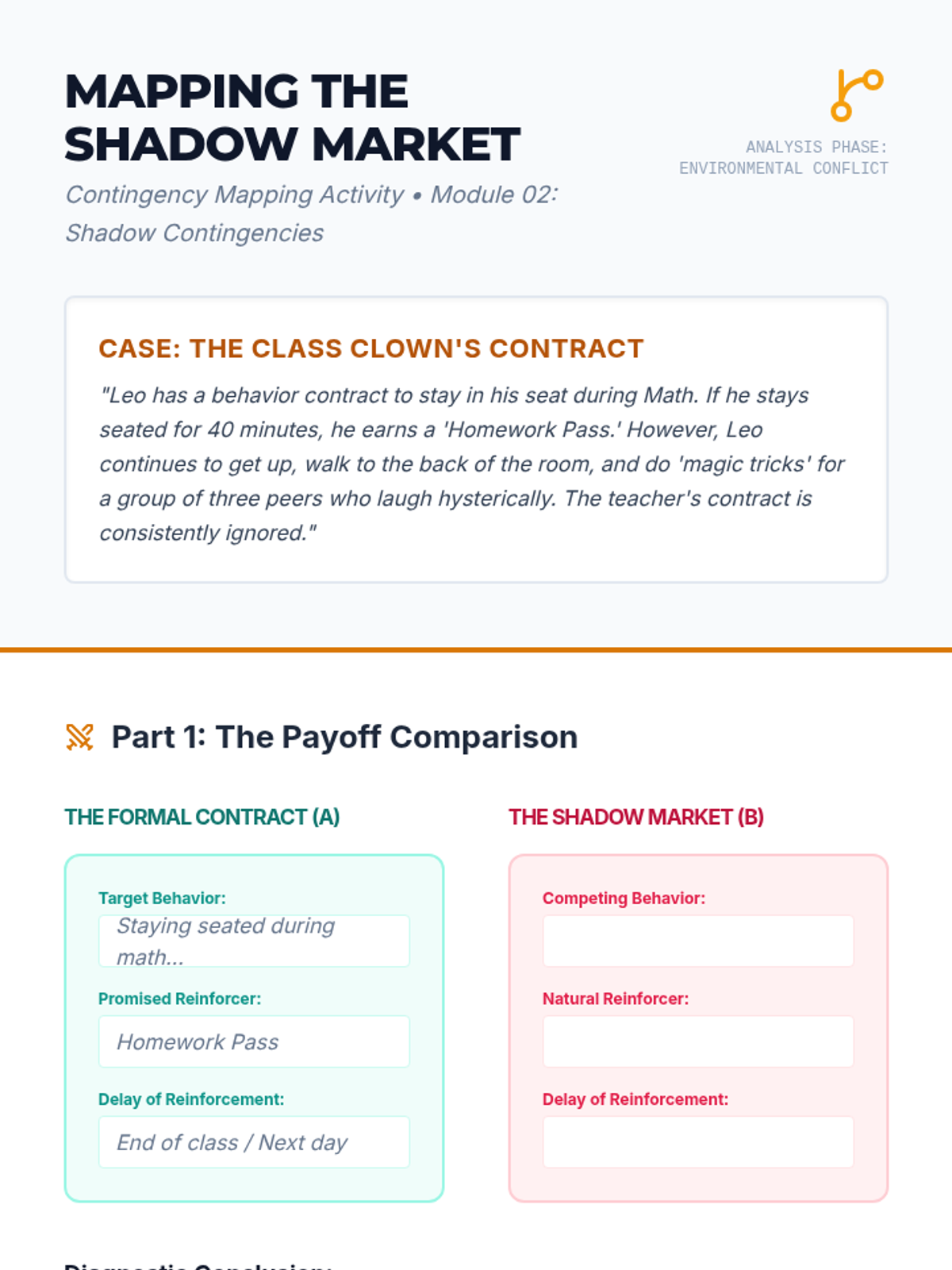 A graduate-level sequence focused on the diagnostic analysis of failed behavior contracts. Students investigate root causes like satiation, competing contingencies, and skill deficits through complex case studies and simulation.