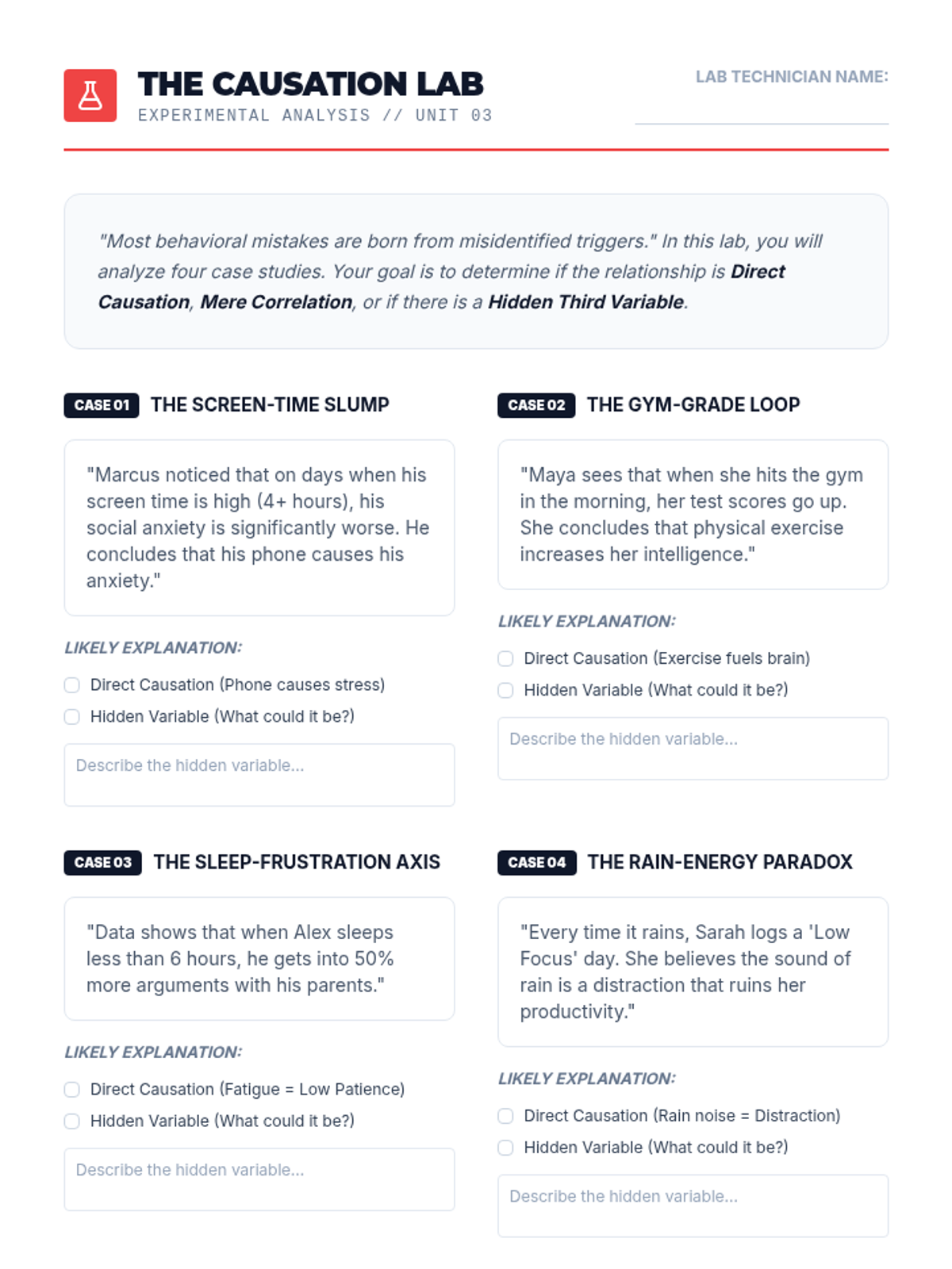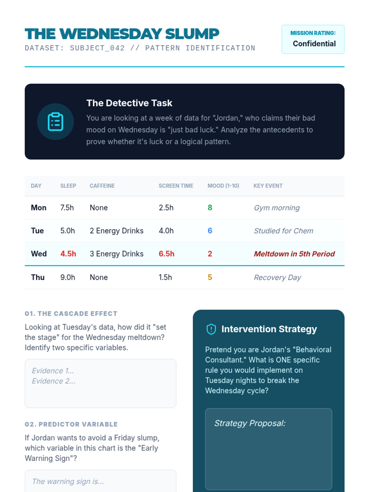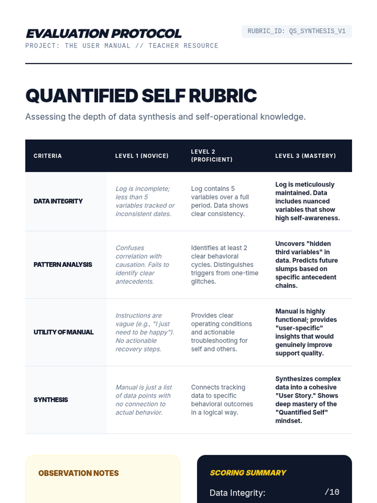 This sequence guides students through the 'Quantified Self' movement, treating their behavior as a data science project. Students design personalized tracking systems, analyze correlations and triggers, and synthesize their findings into a 'User Manual for Me'.