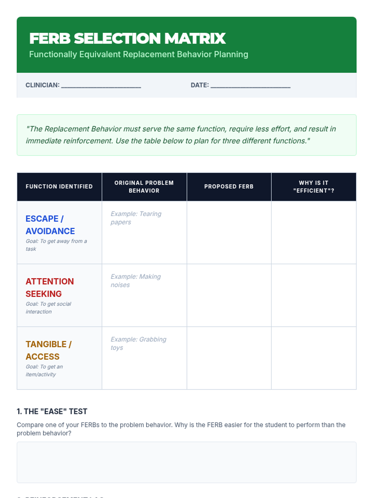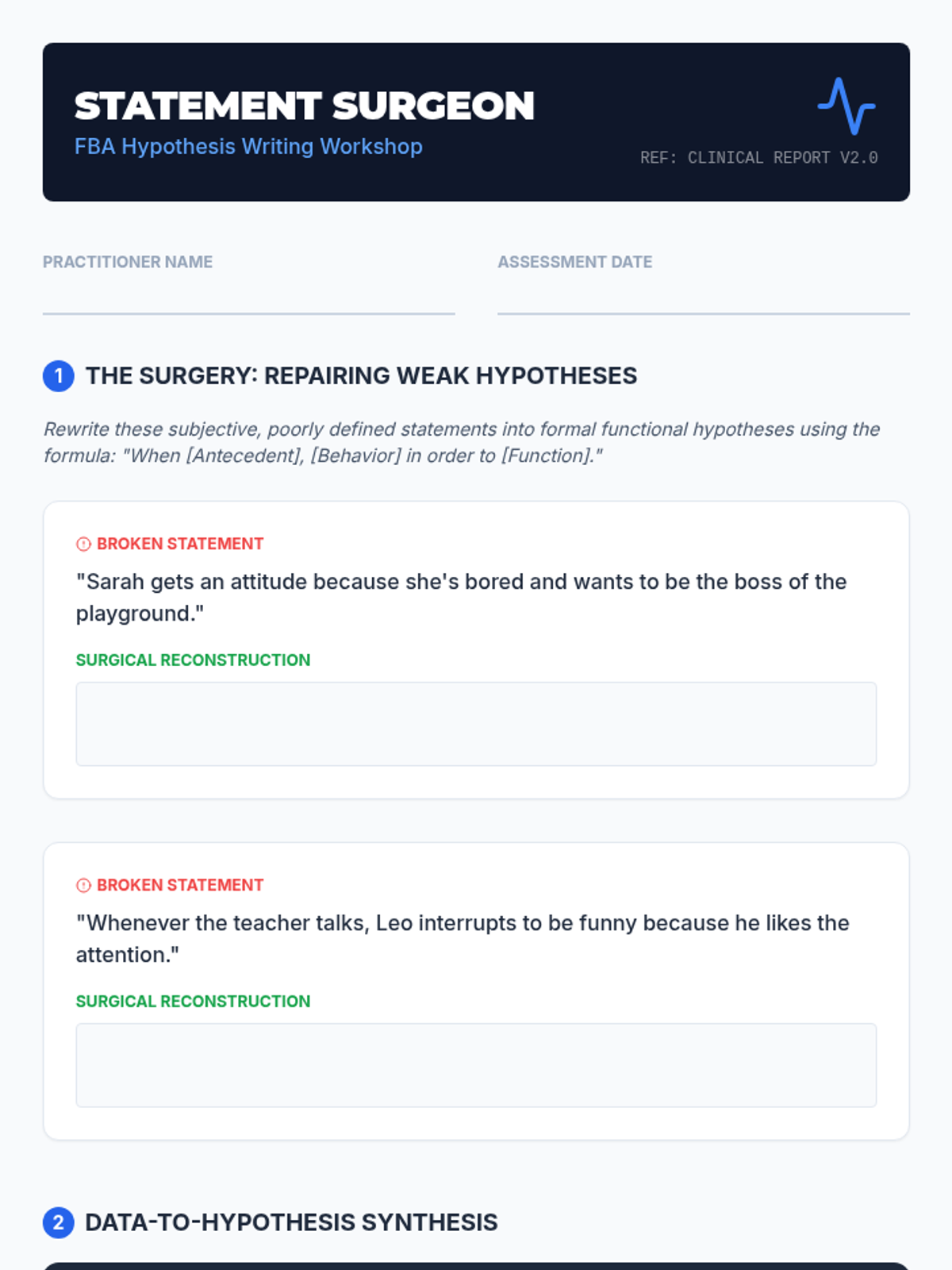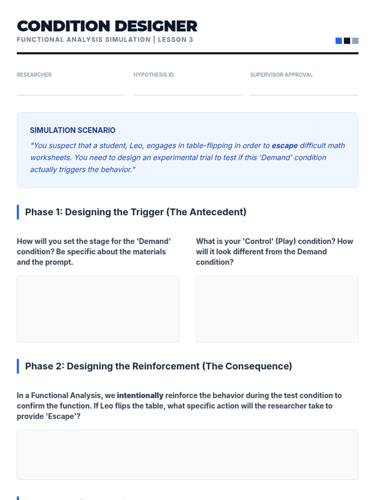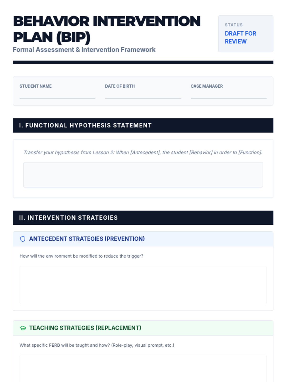 This project-based sequence guides undergraduate students through the synthesis of behavioral assessment data to formulate defensible functional hypotheses and design function-matched interventions. Students progress from data triangulation to formal hypothesis writing, an introduction to functional analysis, and finally the development of a professional Behavior Intervention Plan (BIP).