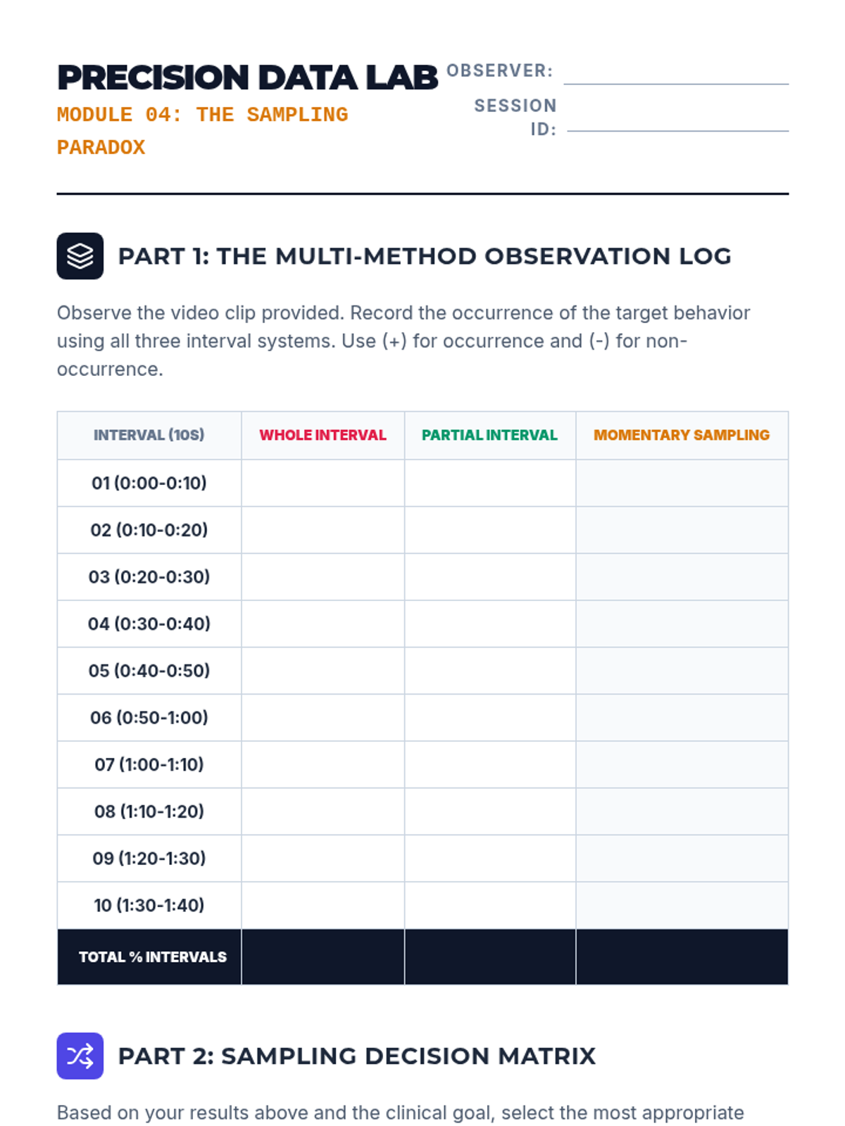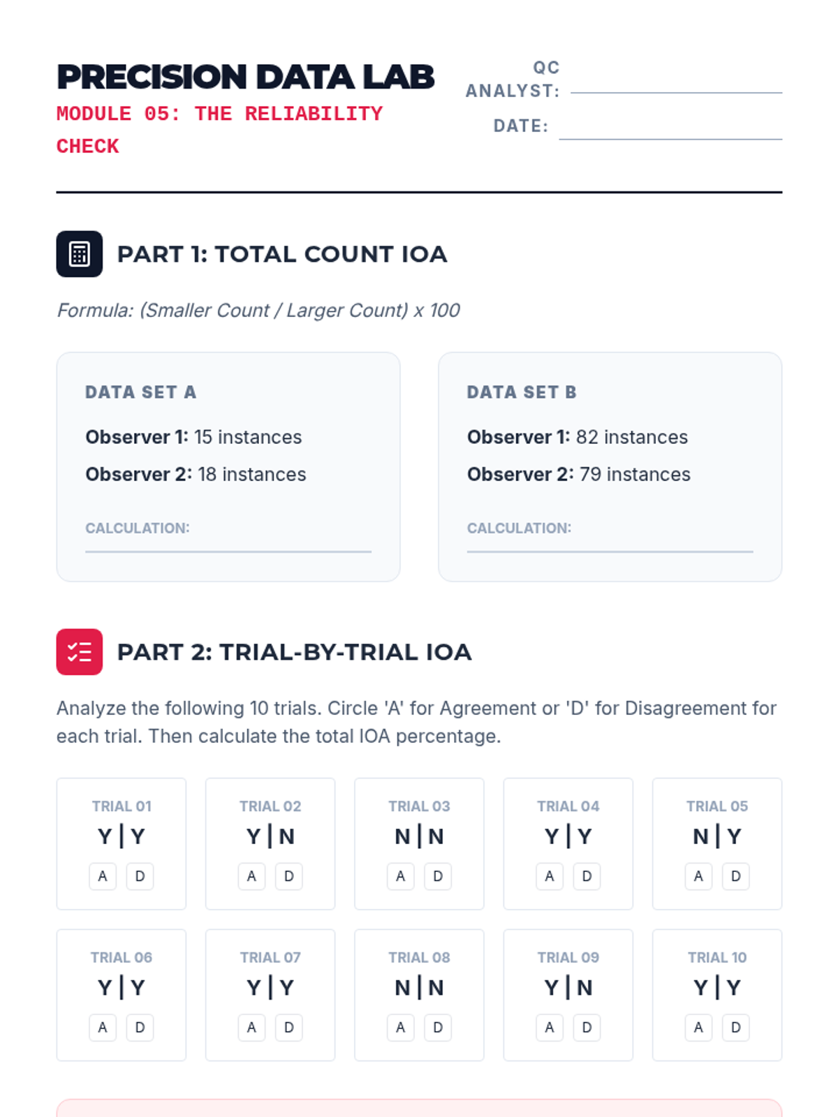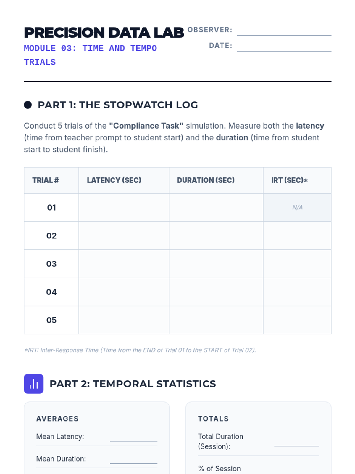 A technical sequence for undergraduate students focused on the quantitative measurement of behavior. Students progress from writing operational definitions to mastering various continuous and discontinuous measurement systems, culminating in calculating Inter-Observer Agreement (IOA) to ensure data reliability.