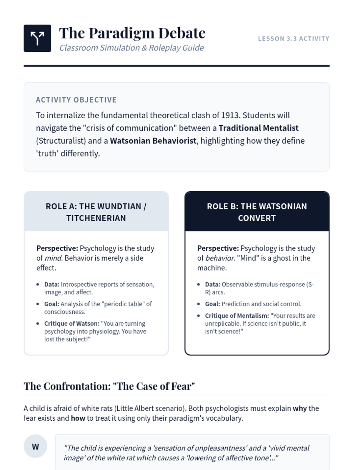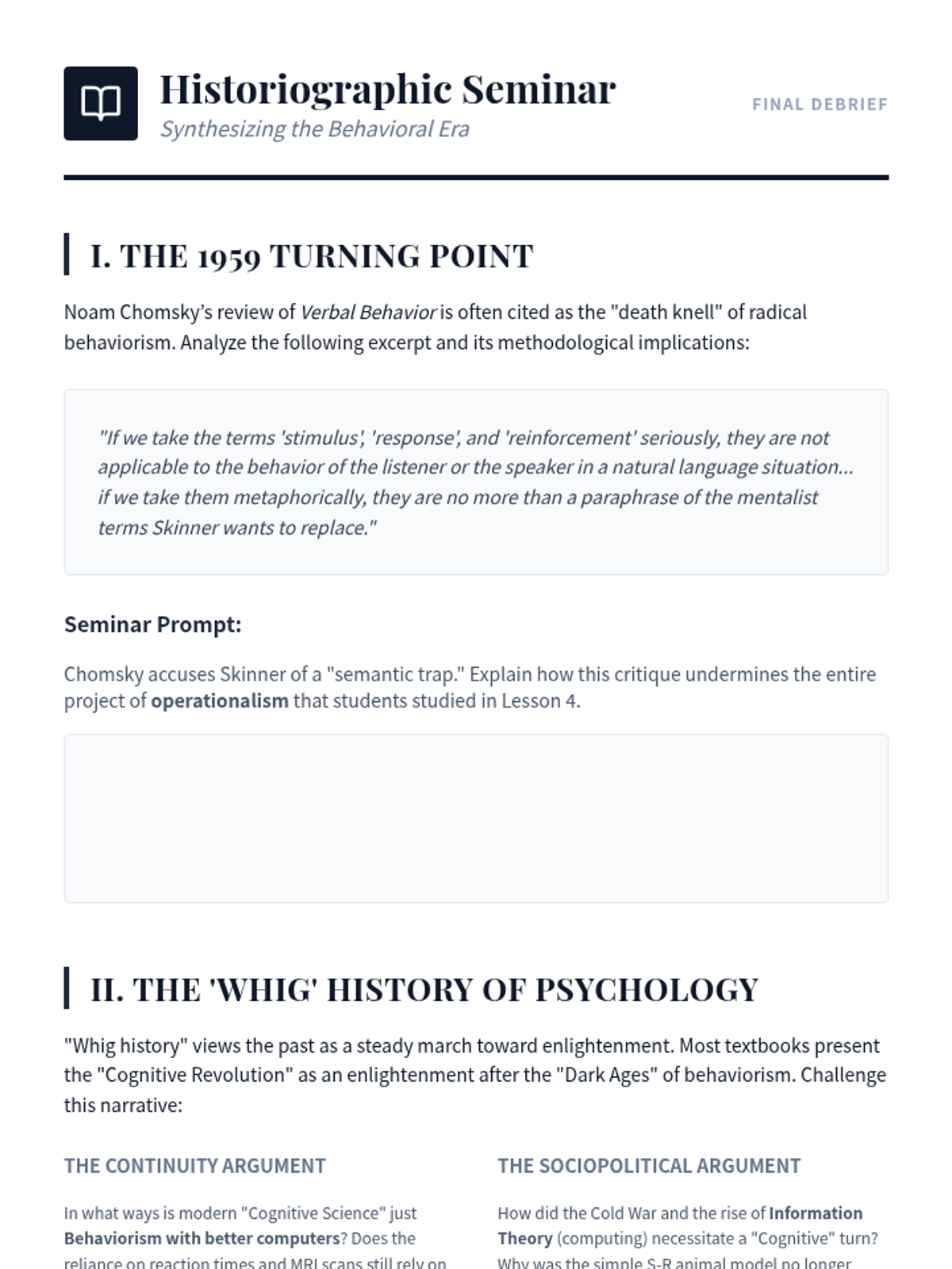 This graduate-level sequence explores the methodological and philosophical shift from introspectionist mentalism to the objective rigors of behaviorism. Students will analyze the historiographical factors, sociopolitical contexts, and key figures that redefined psychology as a 'science of behavior,' critiquing the costs and benefits of this transition.