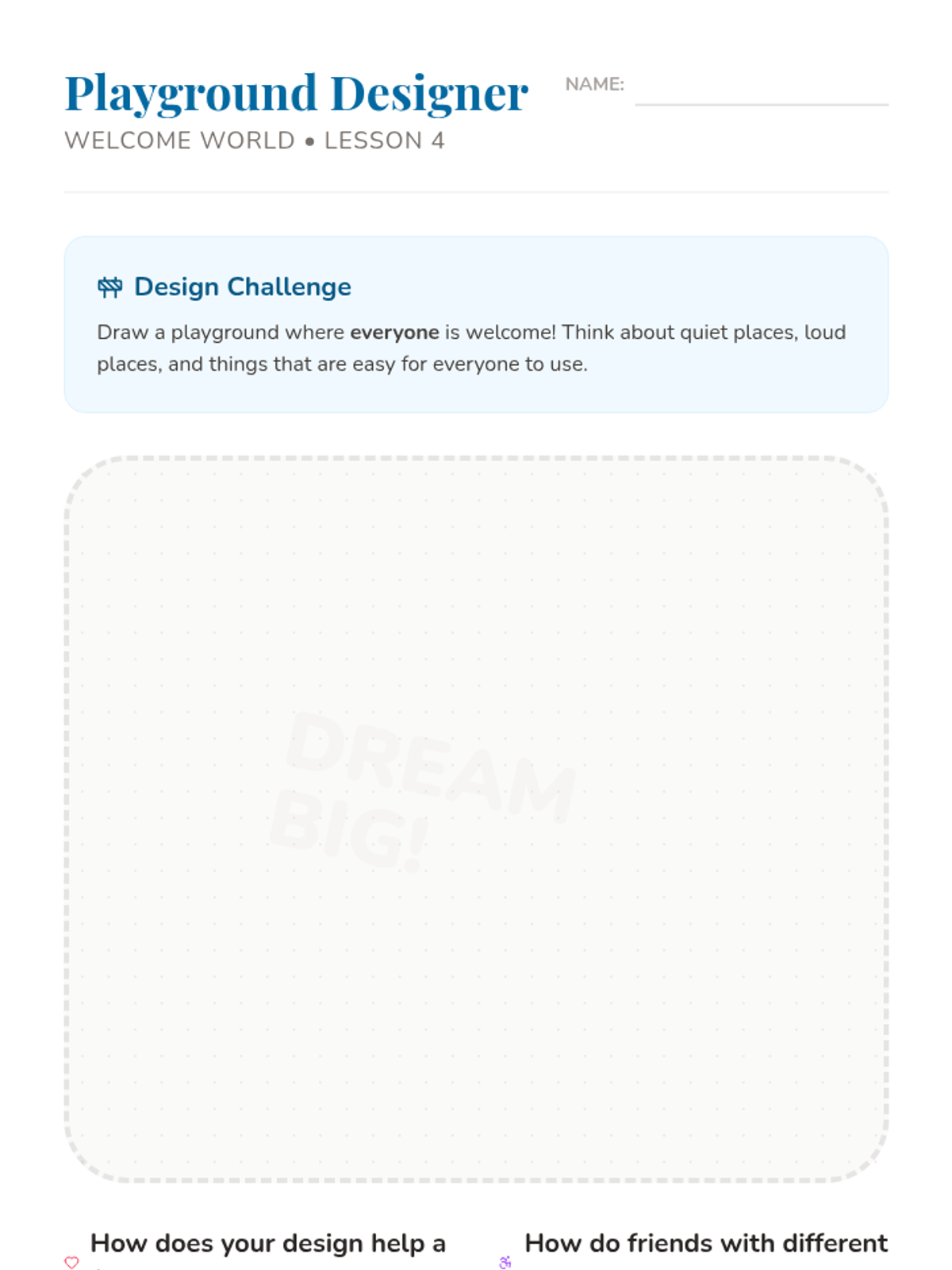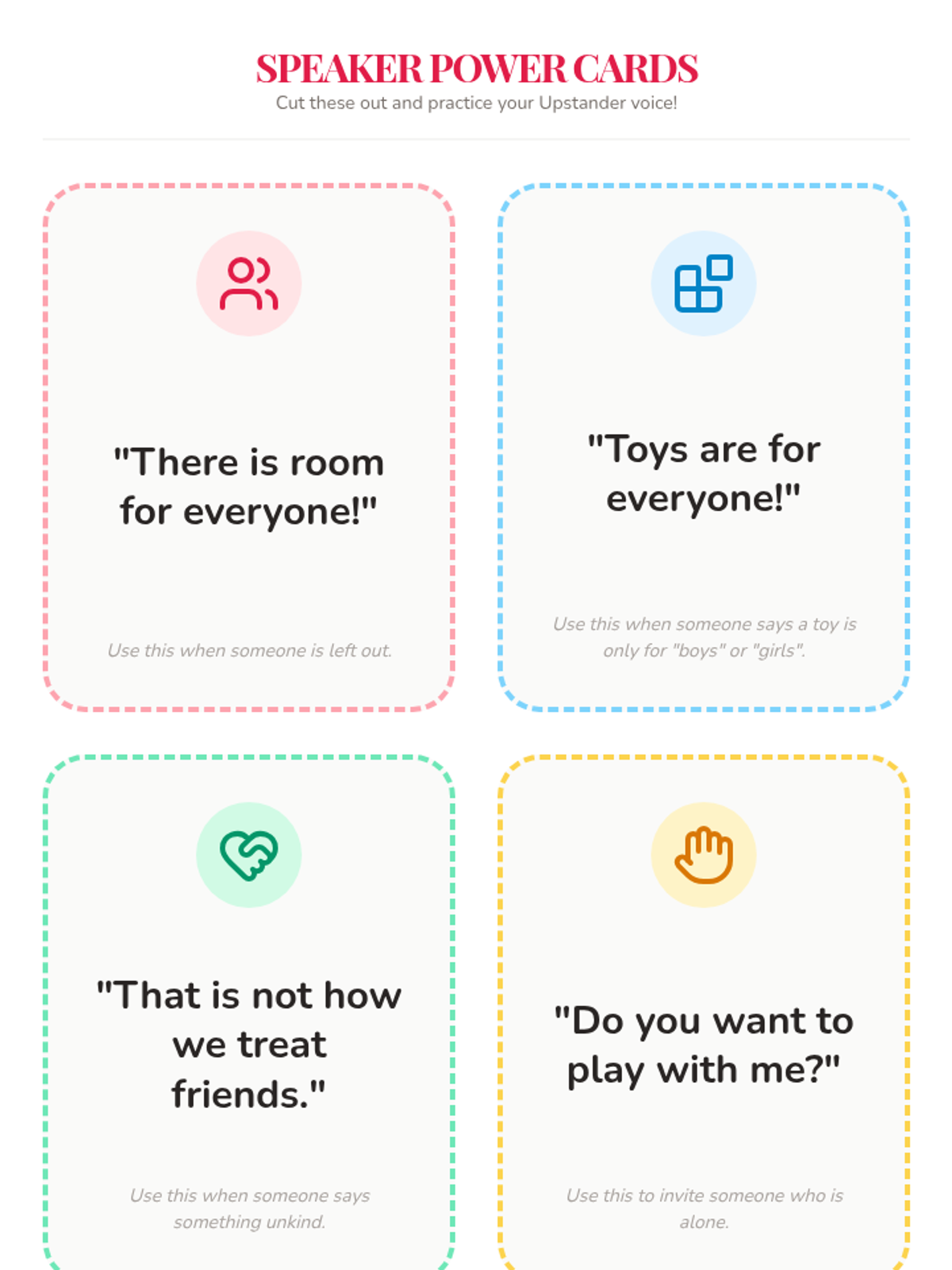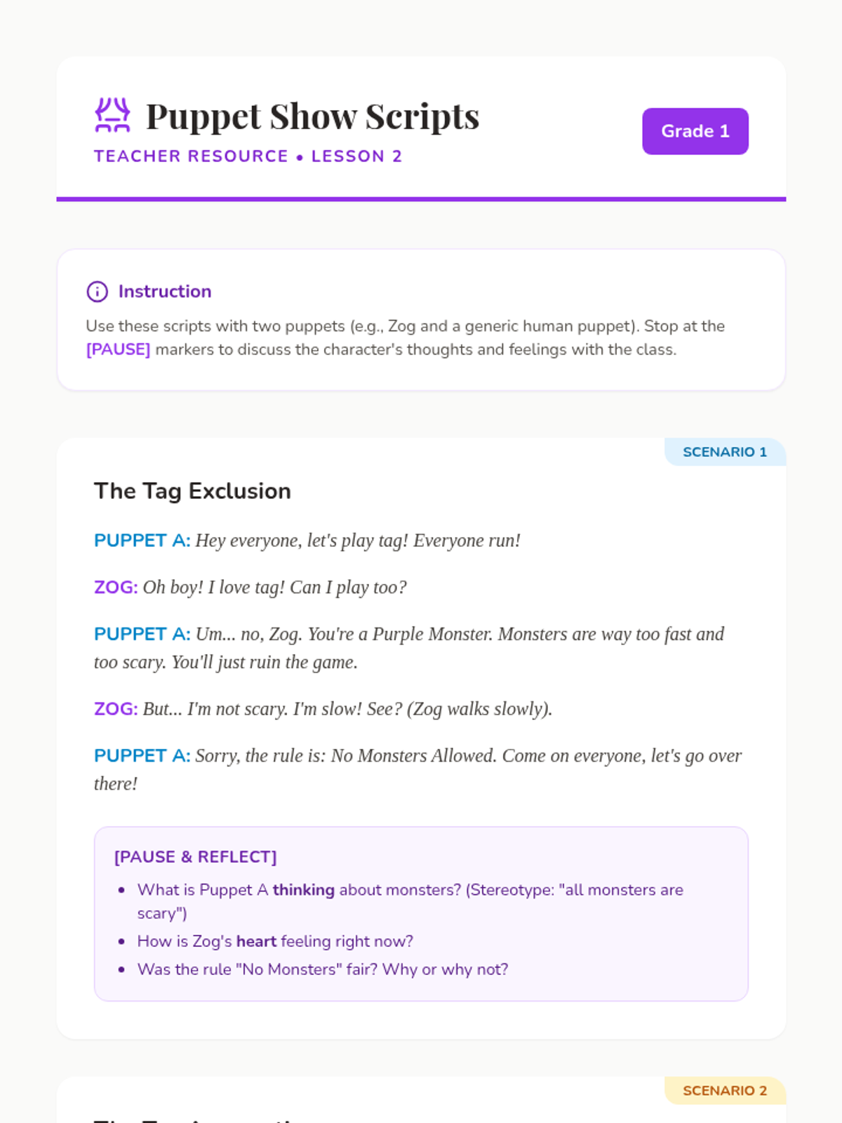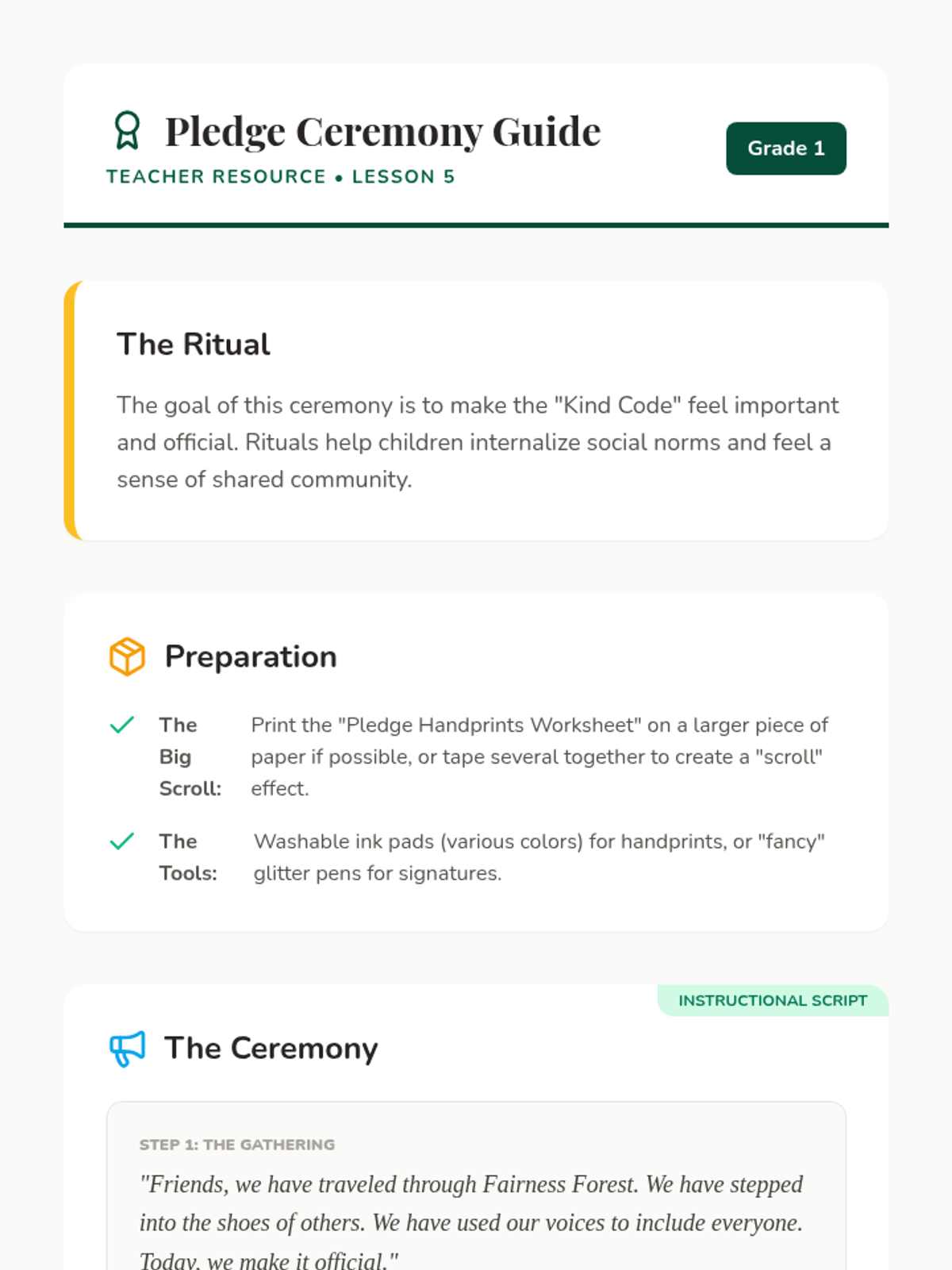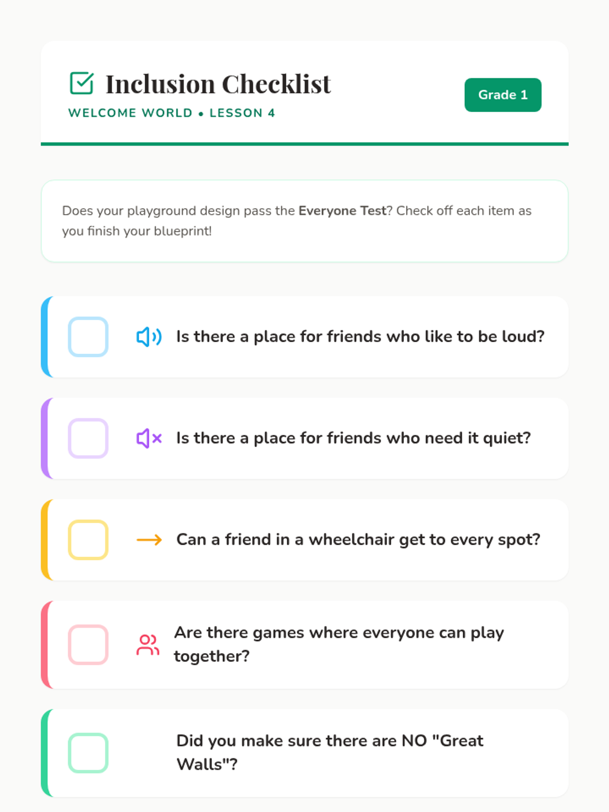 A social-emotional learning sequence for 1st graders focused on empathy, perspective-taking, and challenging exclusion. Students experience simulations, role-play, and creative projects to build an inclusive classroom community.