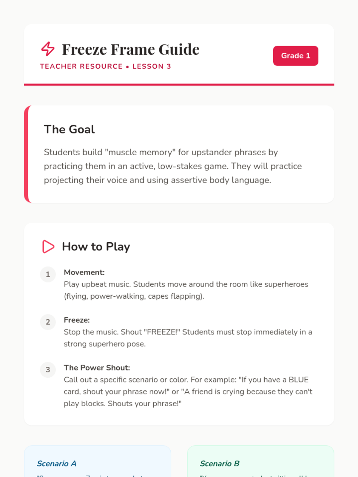 A pair of 10-minute assembly lessons focused on friendship, safety, and community respect for K-2 and 3-5 students, addressing physical and verbal behavior.
