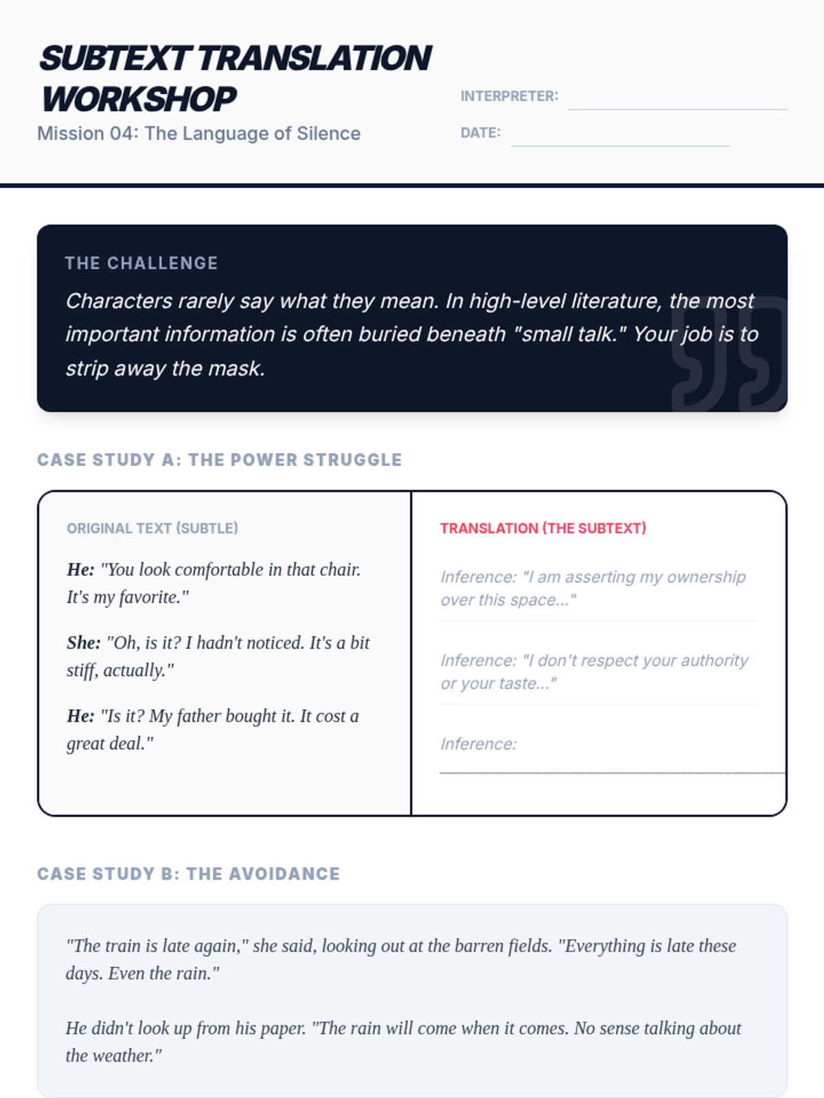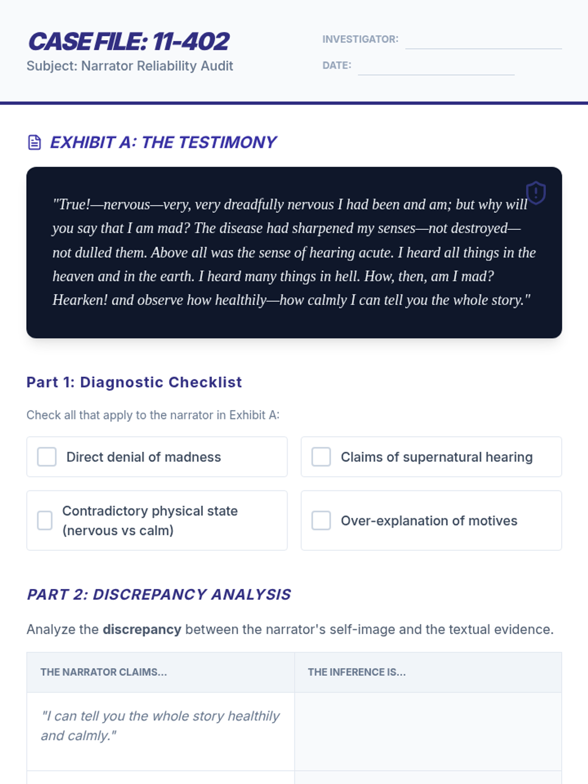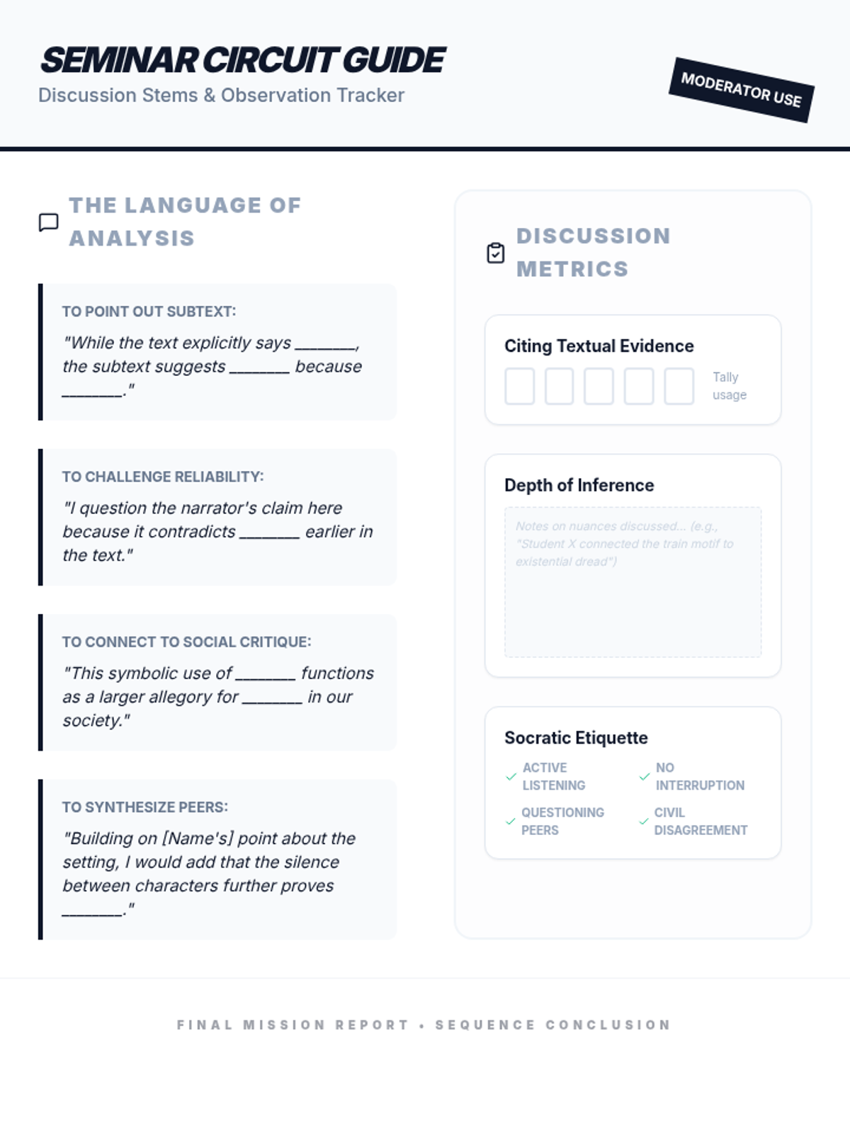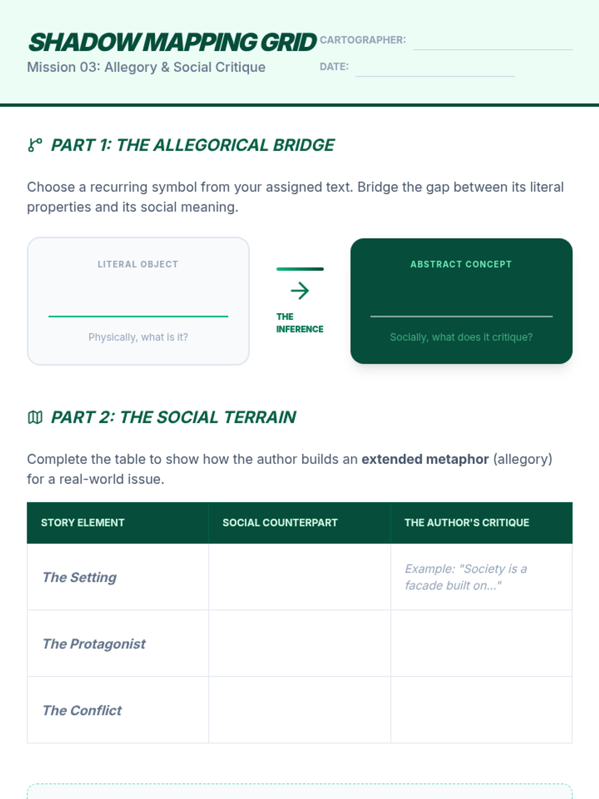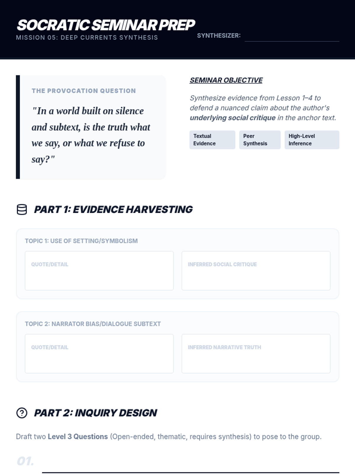 This 11th-grade ELA sequence explores the mechanics of subtext, inference, and social commentary. Students move from understanding the 'Iceberg Theory' of minimalist prose to navigating unreliable narrators, decoding symbolic allegories, and finally synthesizing complex textual evidence in a high-level Socratic seminar.