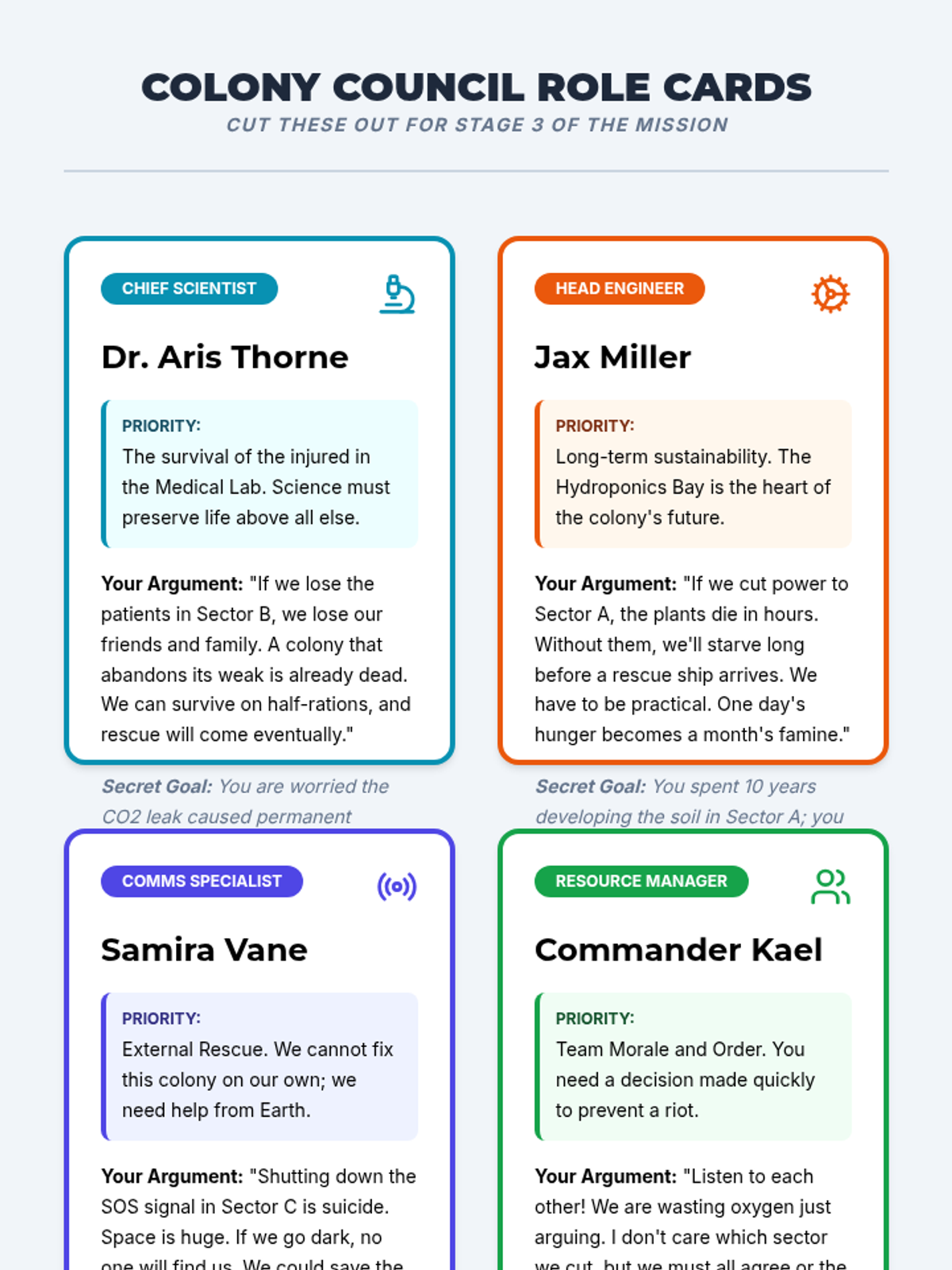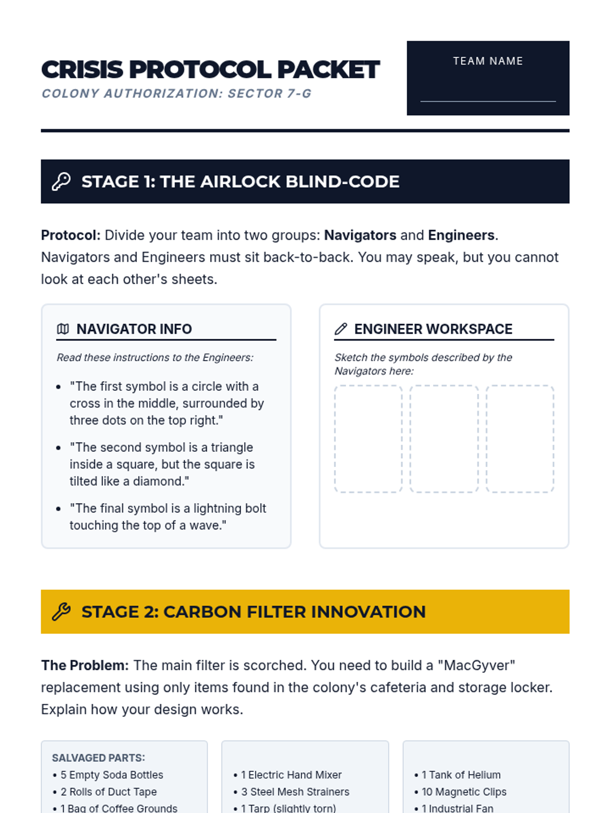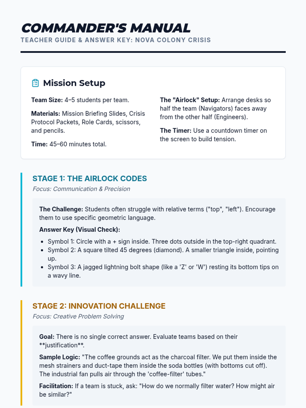 A high-stakes problem-solving adventure where middle school students must work together to save a space colony. This sequence focuses on developing teamwork, effective communication, and innovative thinking through an escape-room style challenge and social role-playing scenarios.